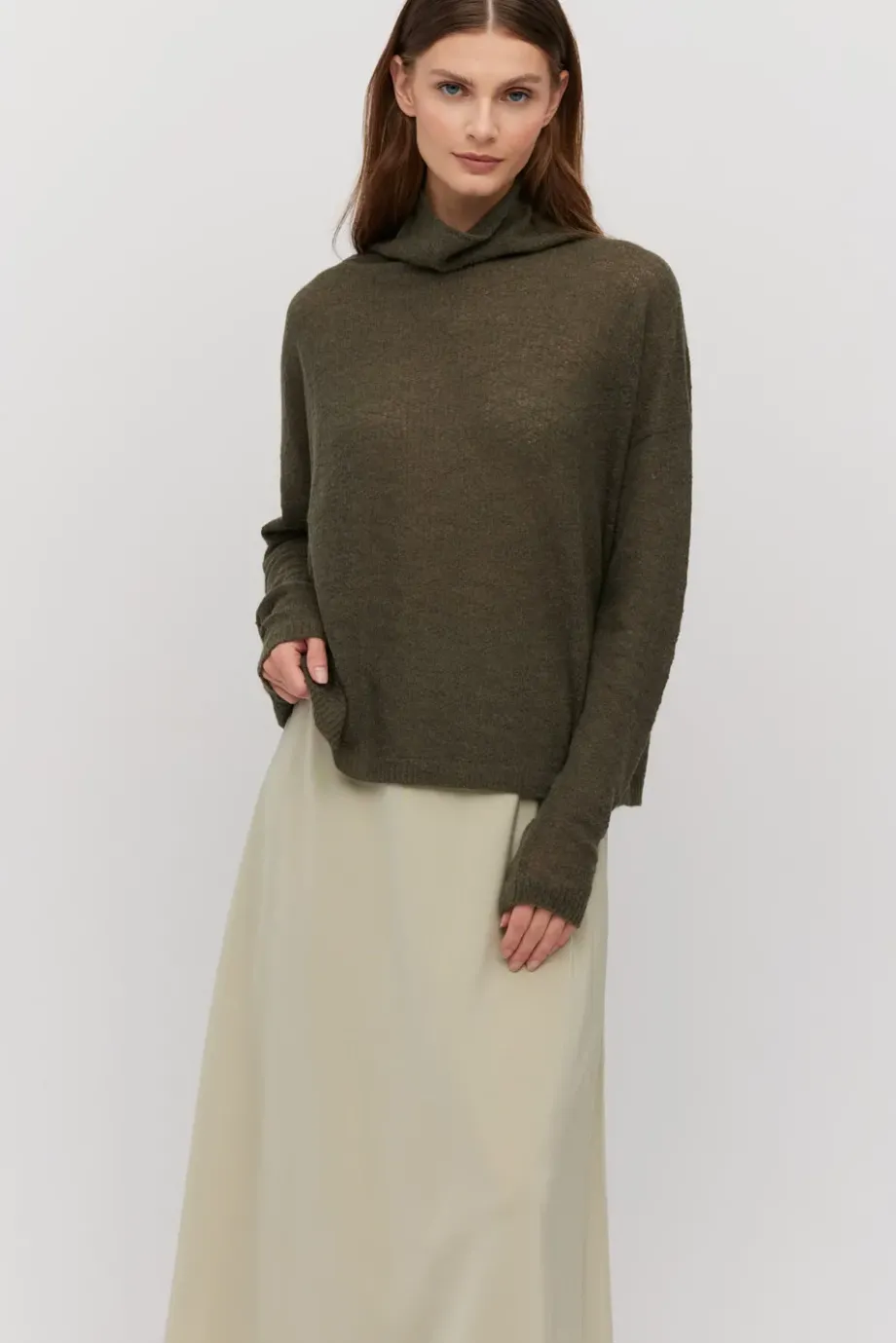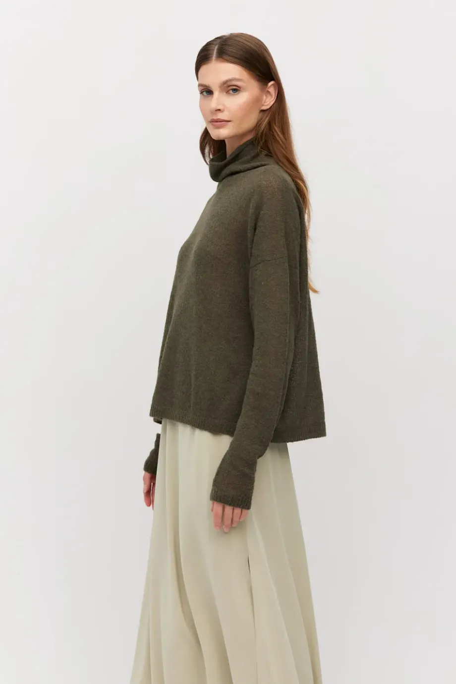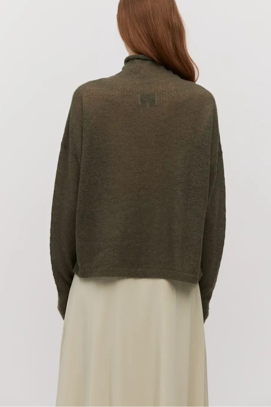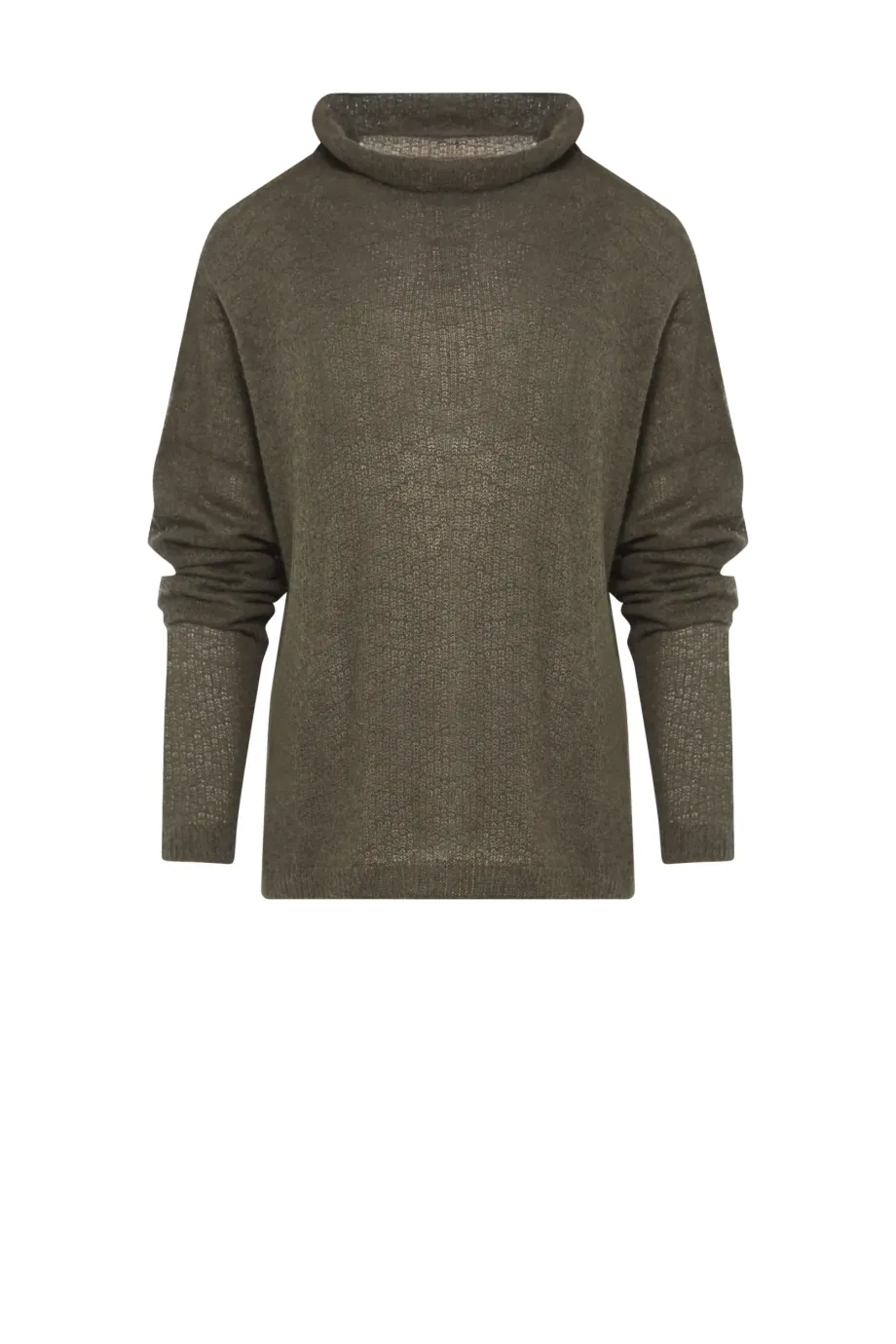 Svetr s vlnou alpaky. Dlouhý rukáv, volný střih, měkký rolák. Vyrobený ve vazbě retained stitch, která dodává úpletu objem a strukturu. Upletený na stroji s jemností 7 GG. Zelená barva.