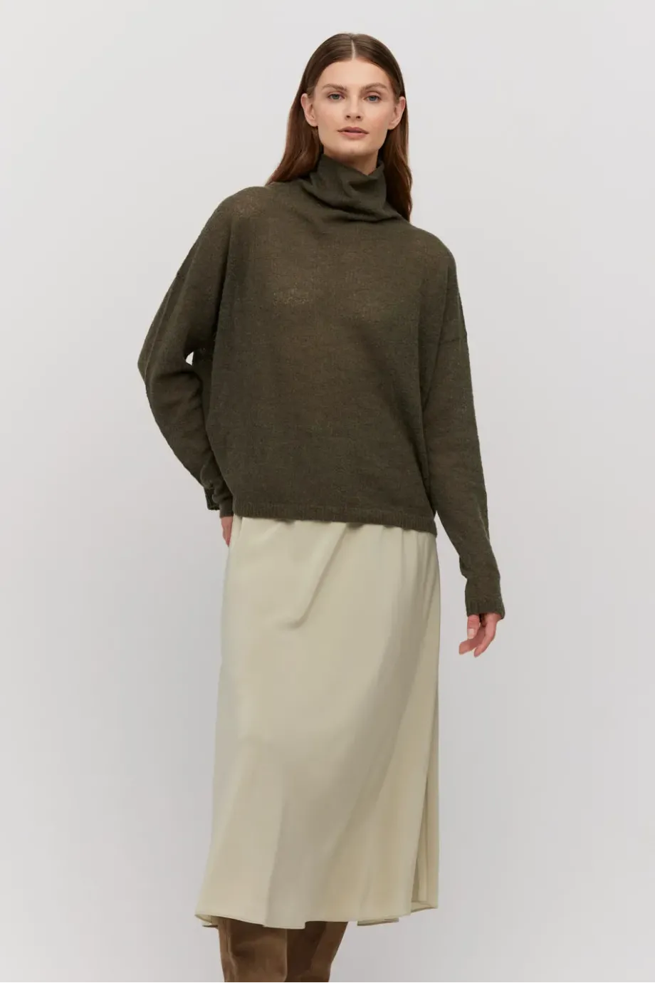 Svetr s vlnou alpaky. Dlouhý rukáv, volný střih, měkký rolák. Vyrobený ve vazbě retained stitch, která dodává úpletu objem a strukturu. Upletený na stroji s jemností 7 GG. Zelená barva.