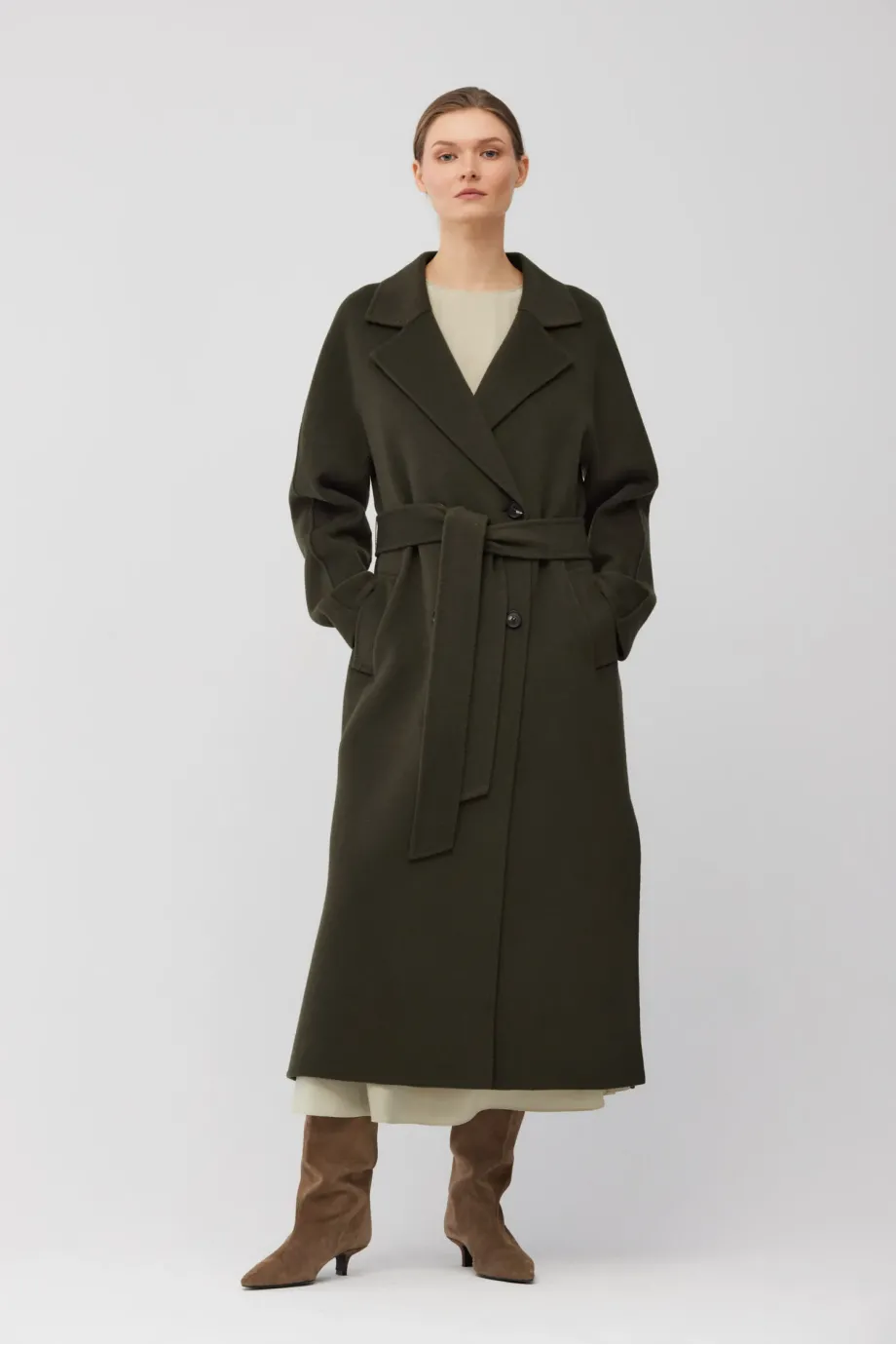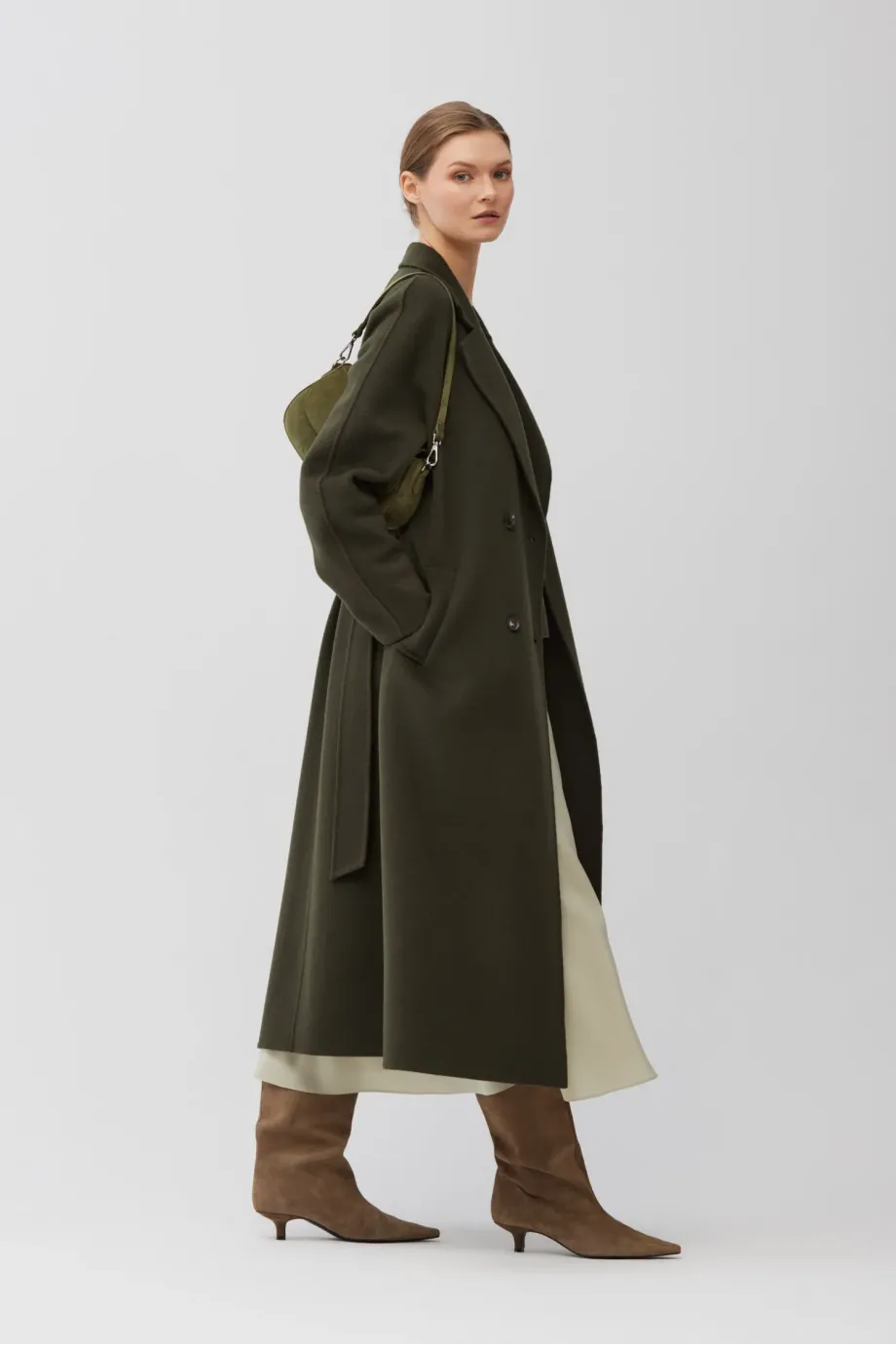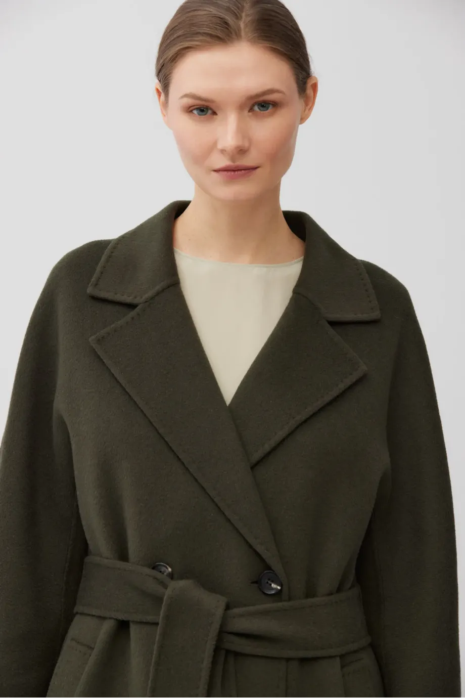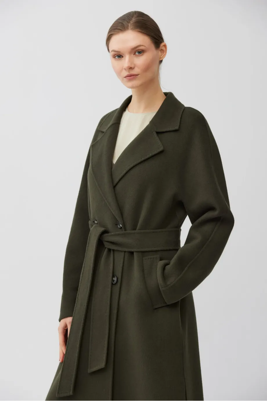 Dvojřadový kabát z doubleface tkaniny - směs vlny a hedvábí. Délka pod kolena, pásek v pase, klopový límec. Lehké, nevyztužené. Barva tmavě zelená.