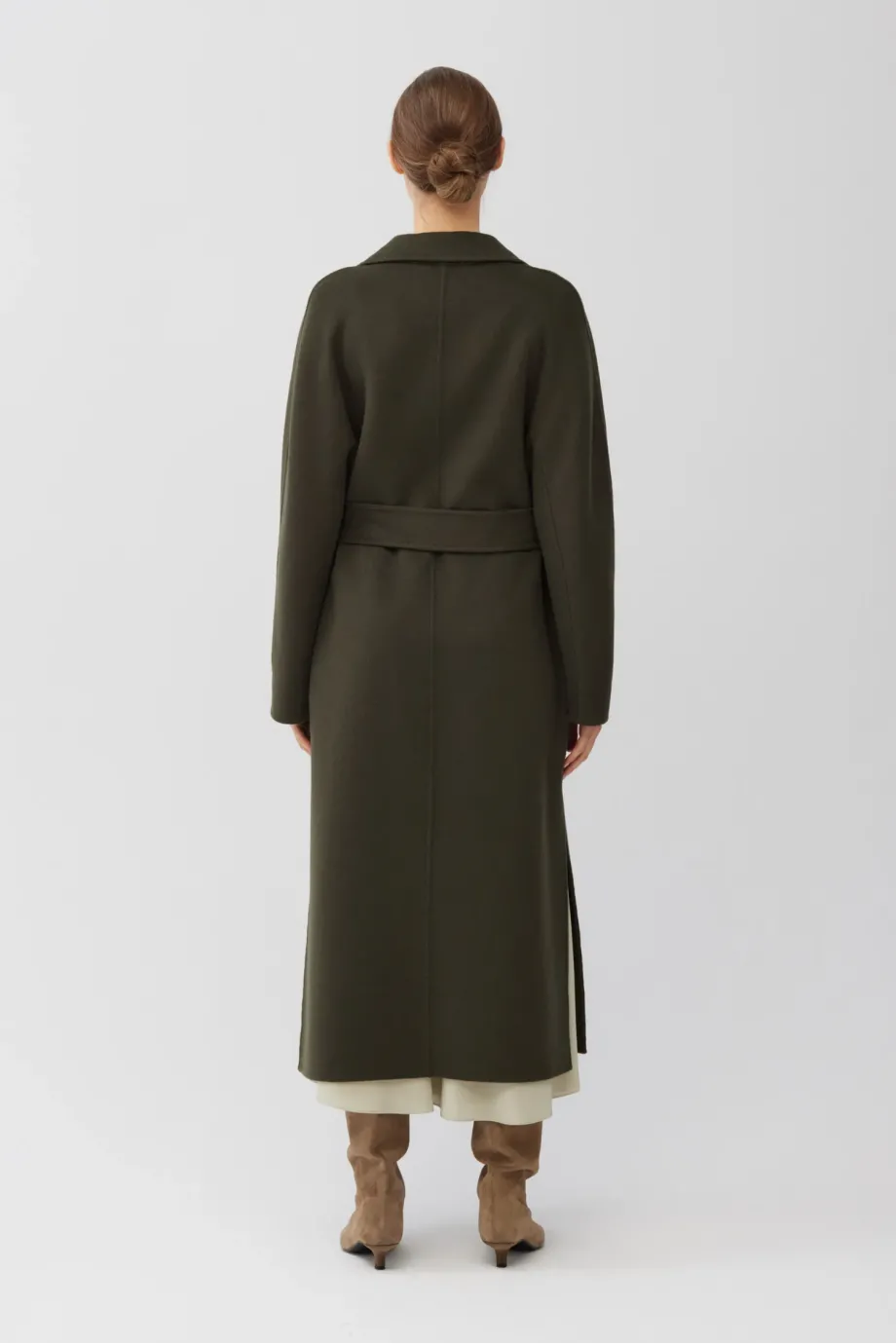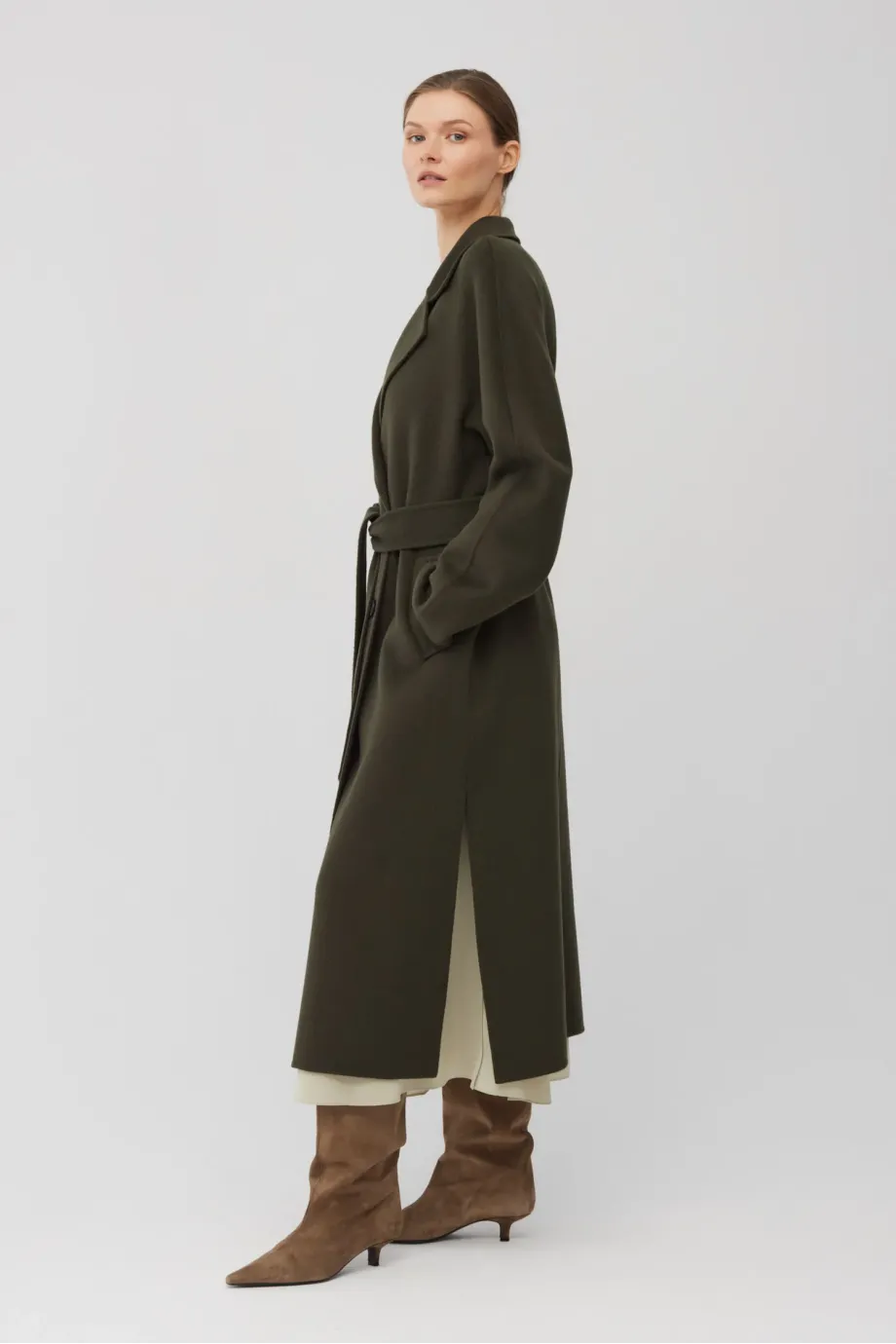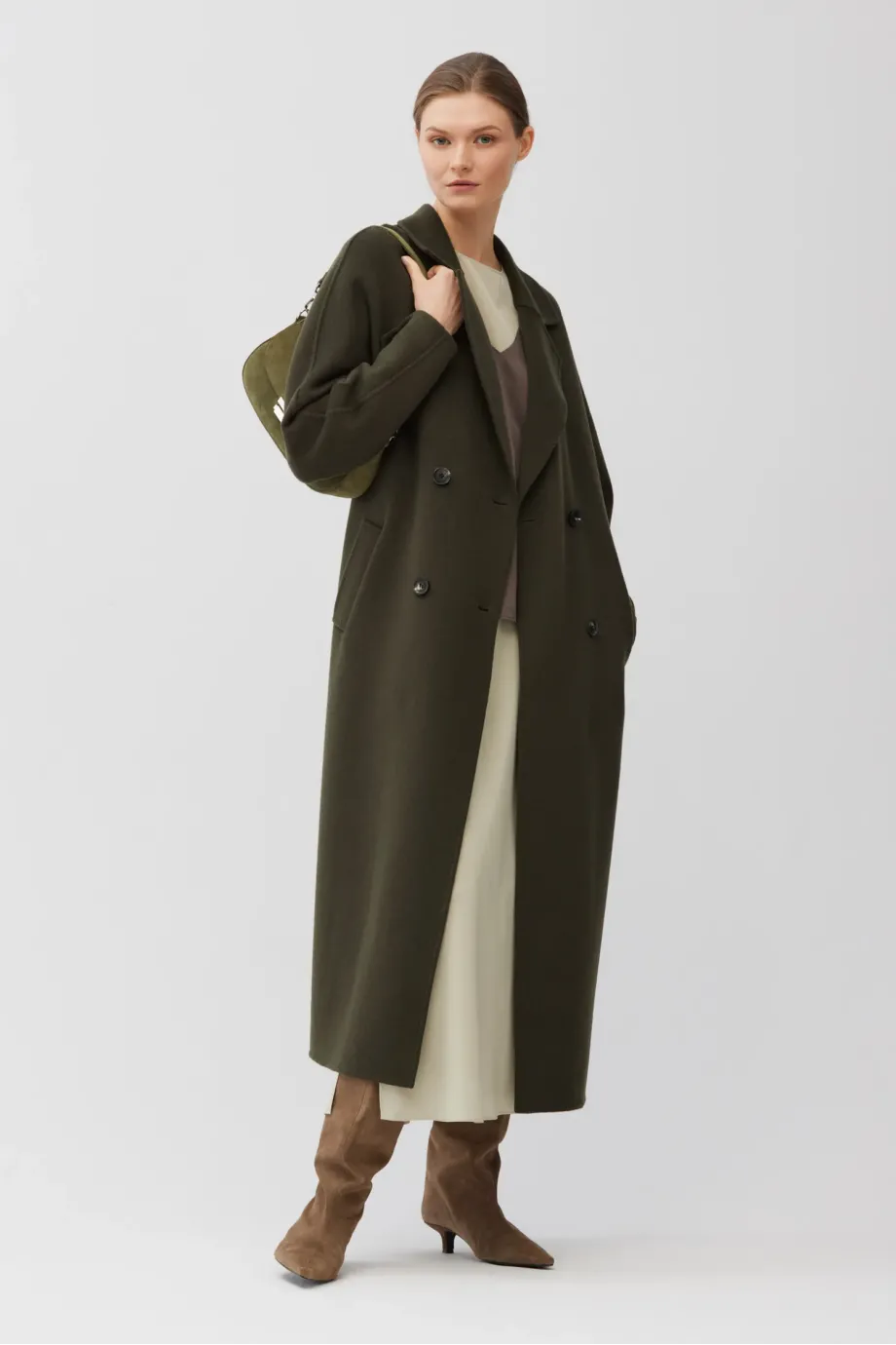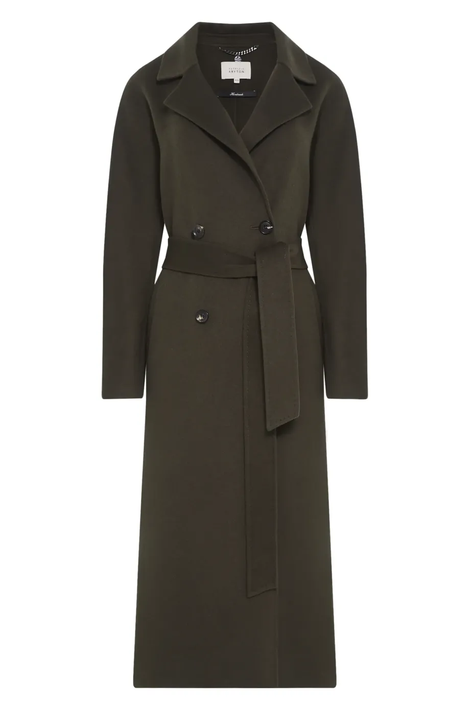 Dvojřadový kabát z doubleface tkaniny - směs vlny a hedvábí. Délka pod kolena, pásek v pase, klopový límec. Lehké, nevyztužené. Barva tmavě zelená.