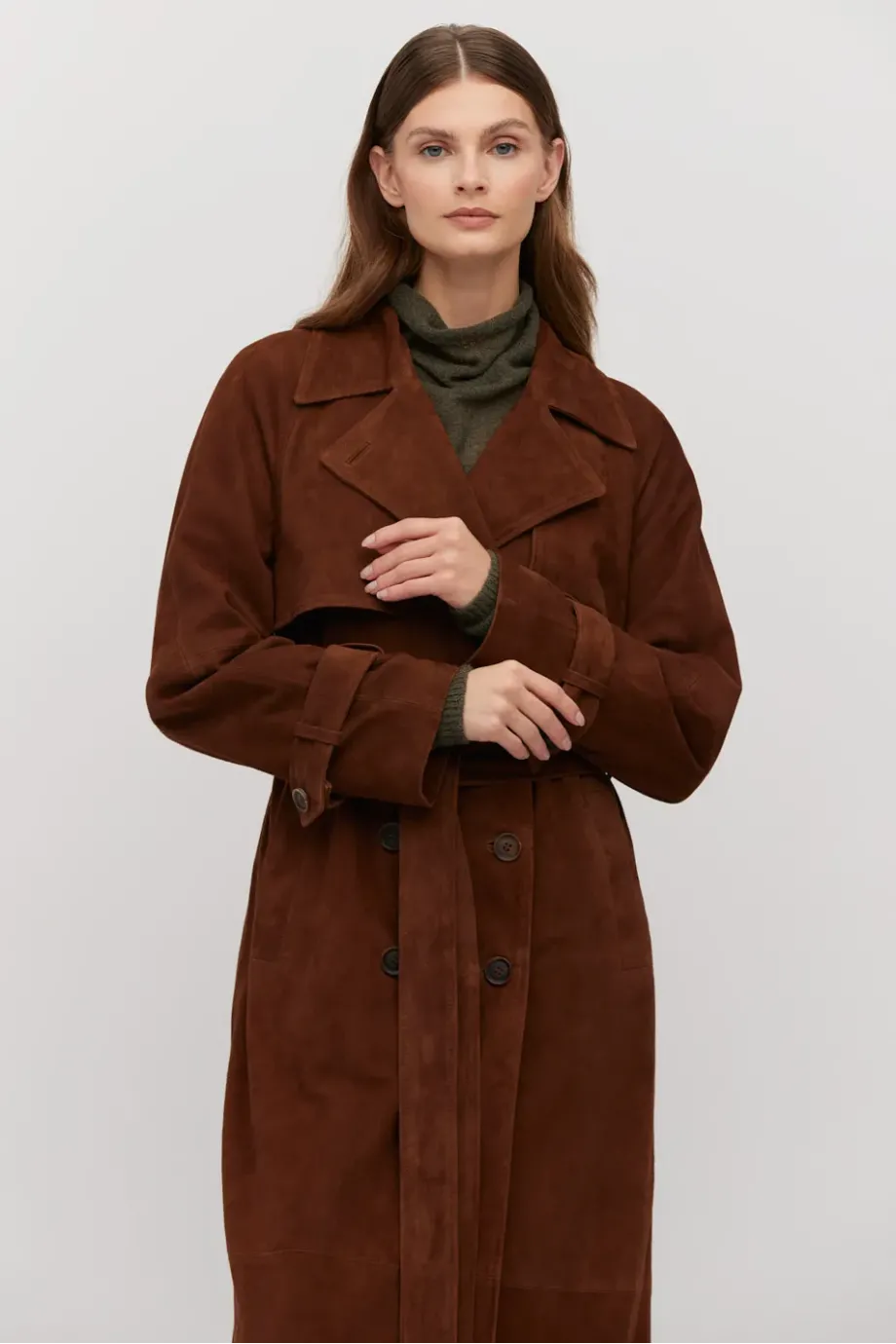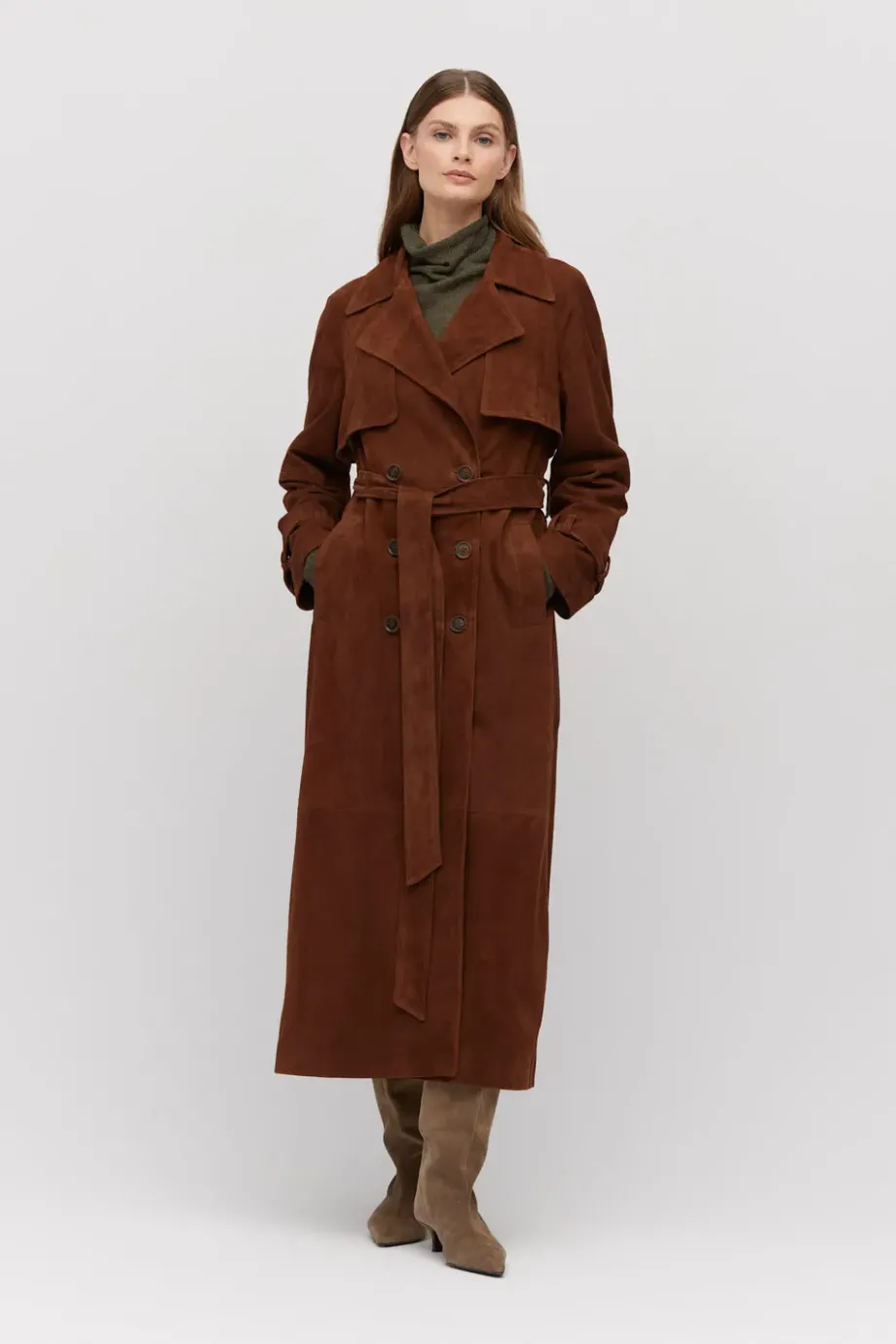 Trenčkot z měkké, přírodní semišové kůže v hnědé barvě. Délka midi, zapínání na pásek v pase. Nárameníky na rukávech, boční kapsy. Rozparky po stranách. Model s podšívkou.