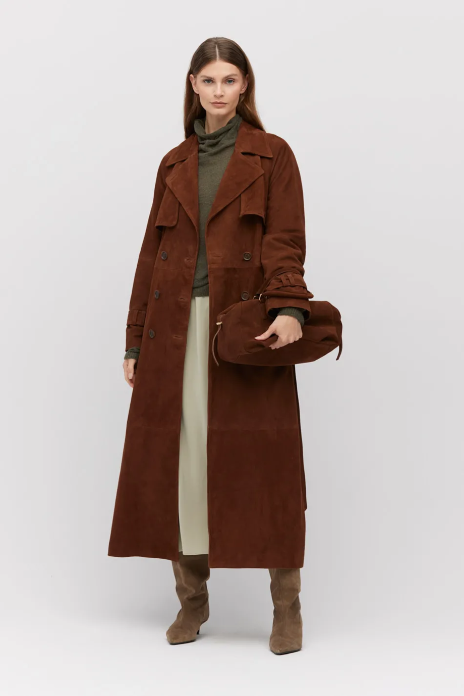Trenčkot z měkké, přírodní semišové kůže v hnědé barvě. Délka midi, zapínání na pásek v pase. Nárameníky na rukávech, boční kapsy. Rozparky po stranách. Model s podšívkou.