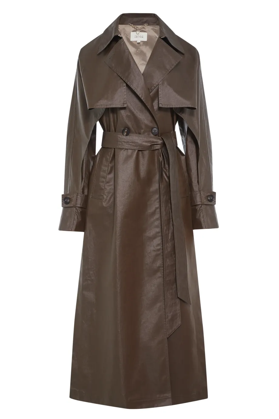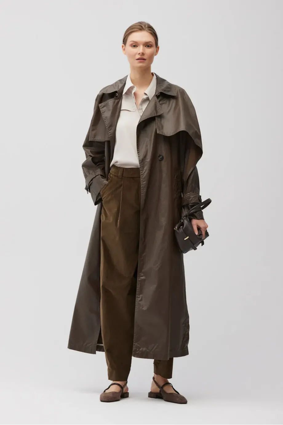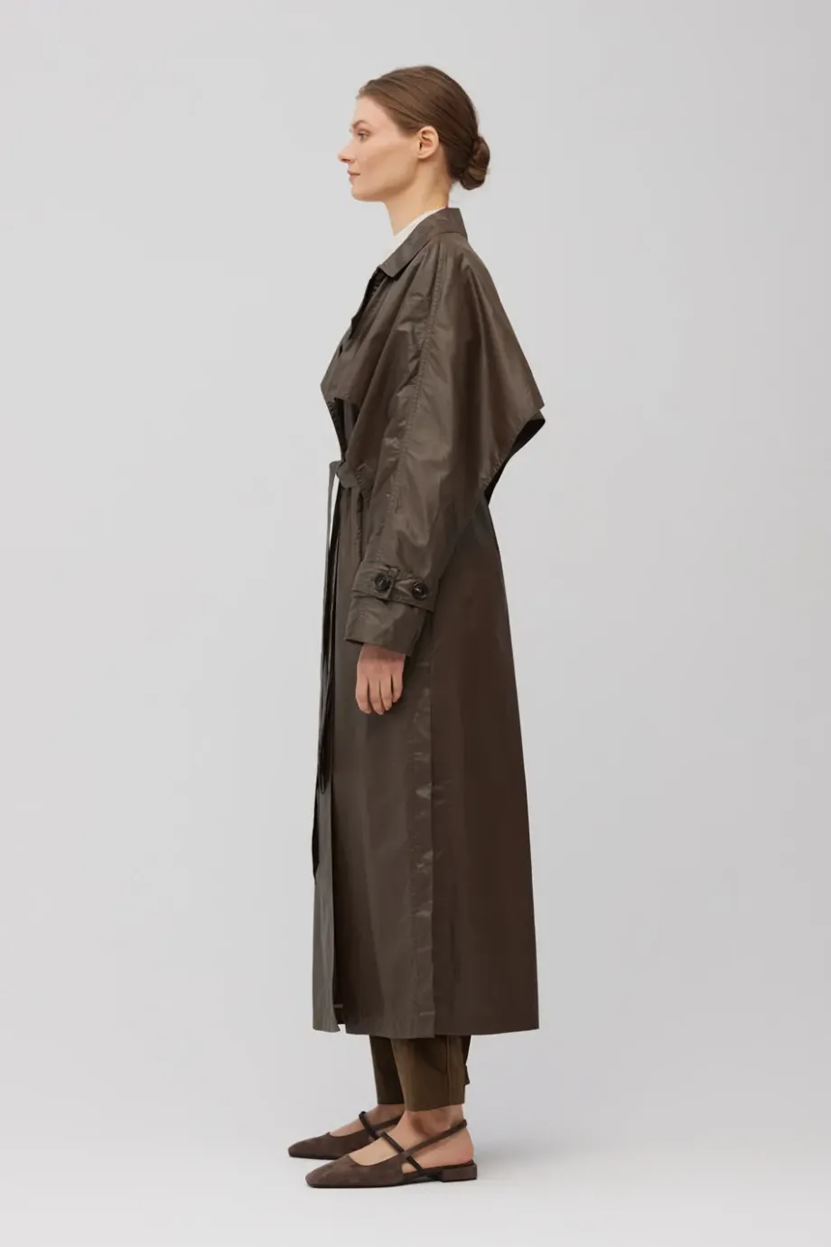 Trenčkot s rozparky a límcem typu storm flap. Raglánové rukávy. Látka s jemným leskem v tmavě hnědé barvě. Délka midi, boční rozparky, pásek v pase. Límec, nárameníky na rukávech. Knoflíky z přírodního rohu. Kapsy ve švech. Celý model je podšitý.