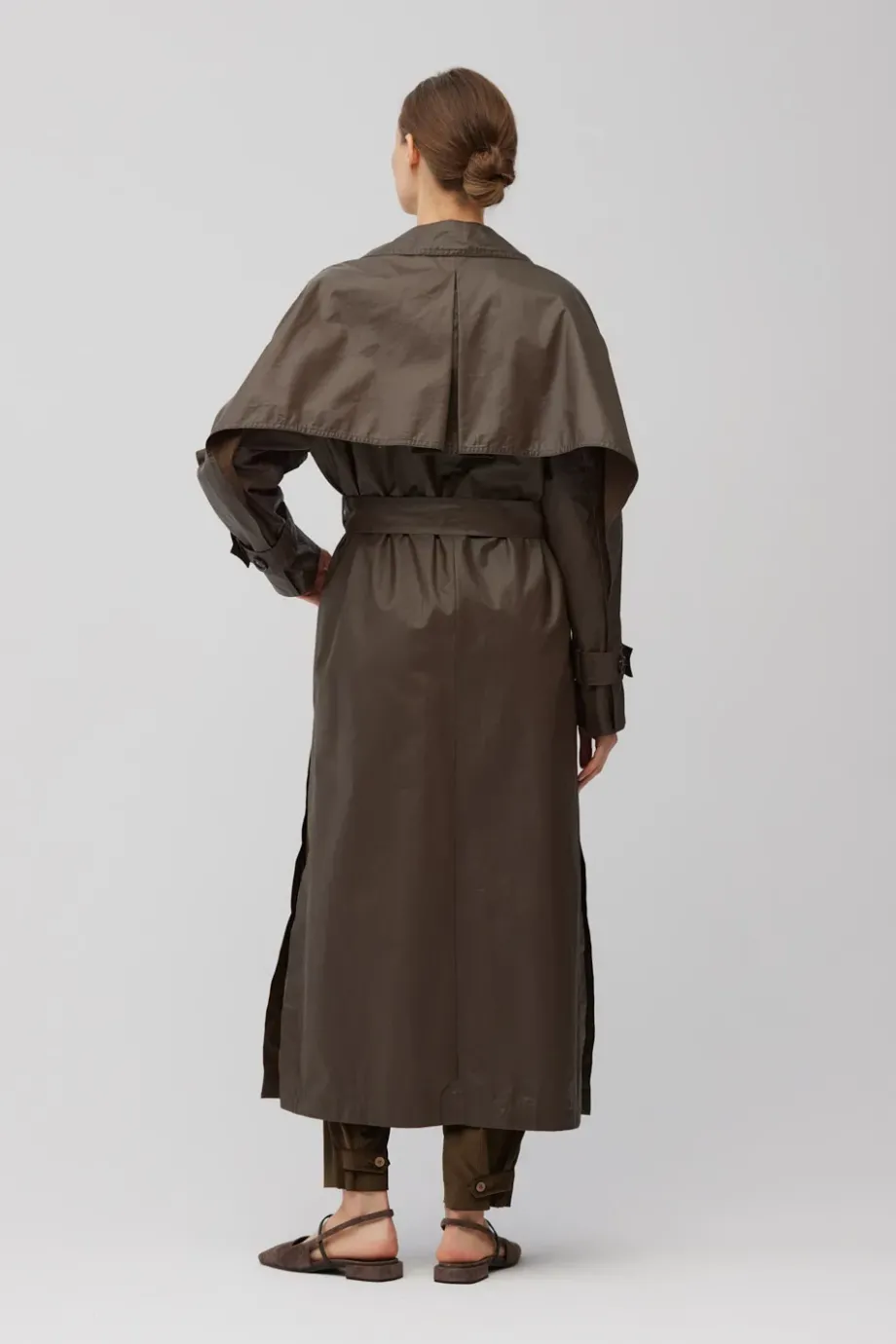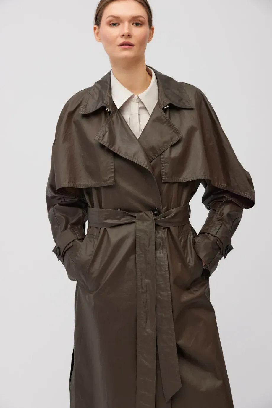 Trenčkot s rozparky a límcem typu storm flap. Raglánové rukávy. Látka s jemným leskem v tmavě hnědé barvě. Délka midi, boční rozparky, pásek v pase. Límec, nárameníky na rukávech. Knoflíky z přírodního rohu. Kapsy ve švech. Celý model je podšitý.