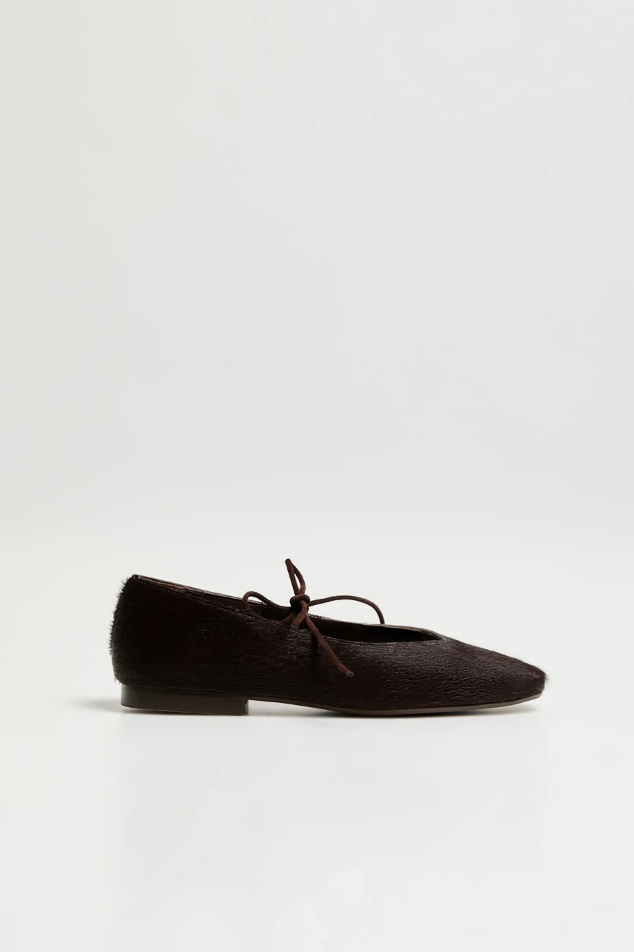 Baleríny vyrobené z přírodní kůže s delšími chlupy, v hlubokém odstínu tmavě hnědé. Nízký svršek vázaný tenkým řemínkem umožňuje přizpůsobit obuv nártu. Mandleový špička a plochá podešev zajišťují lehkost a pružnost. Ručně šité ve španělské manufaktuře.