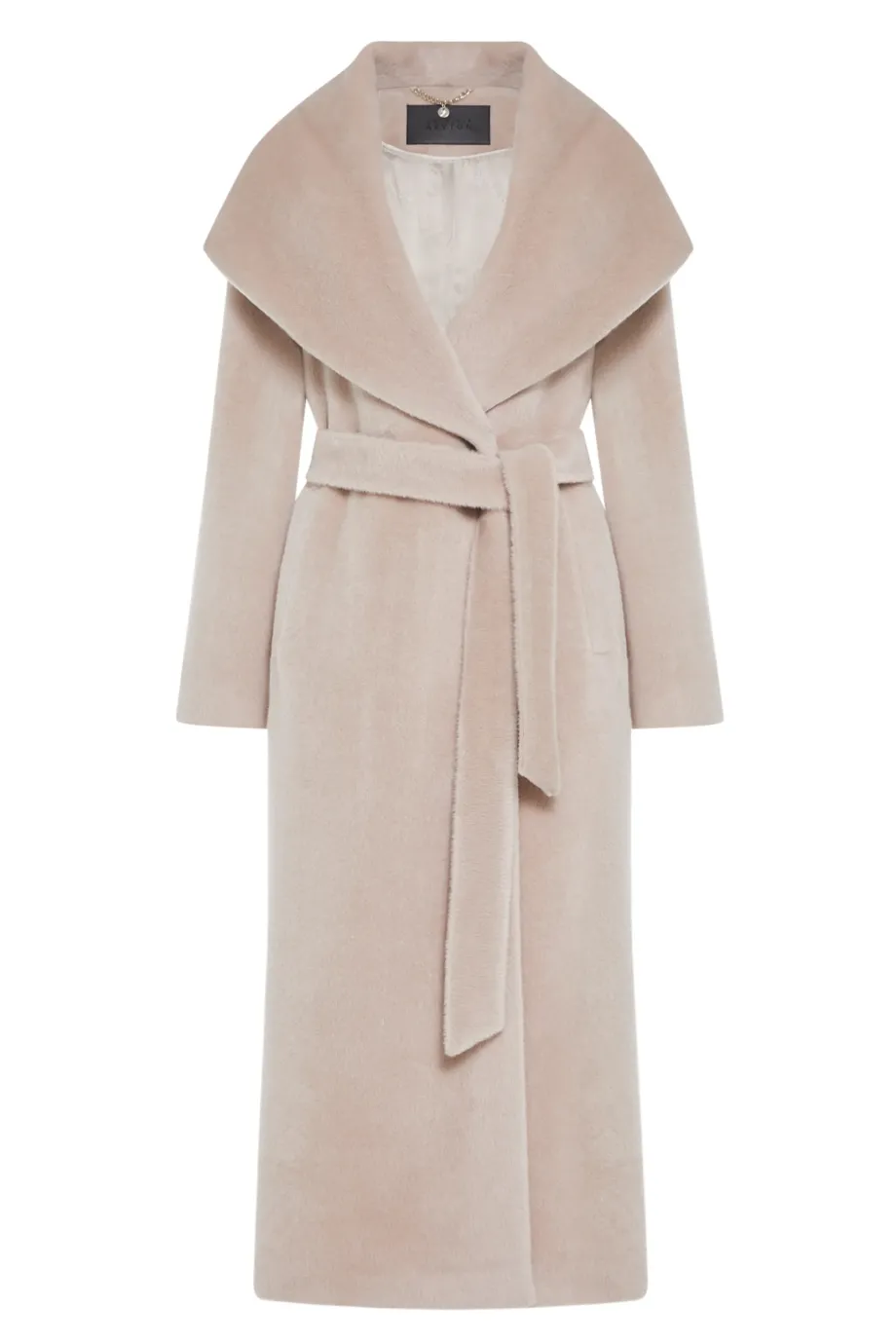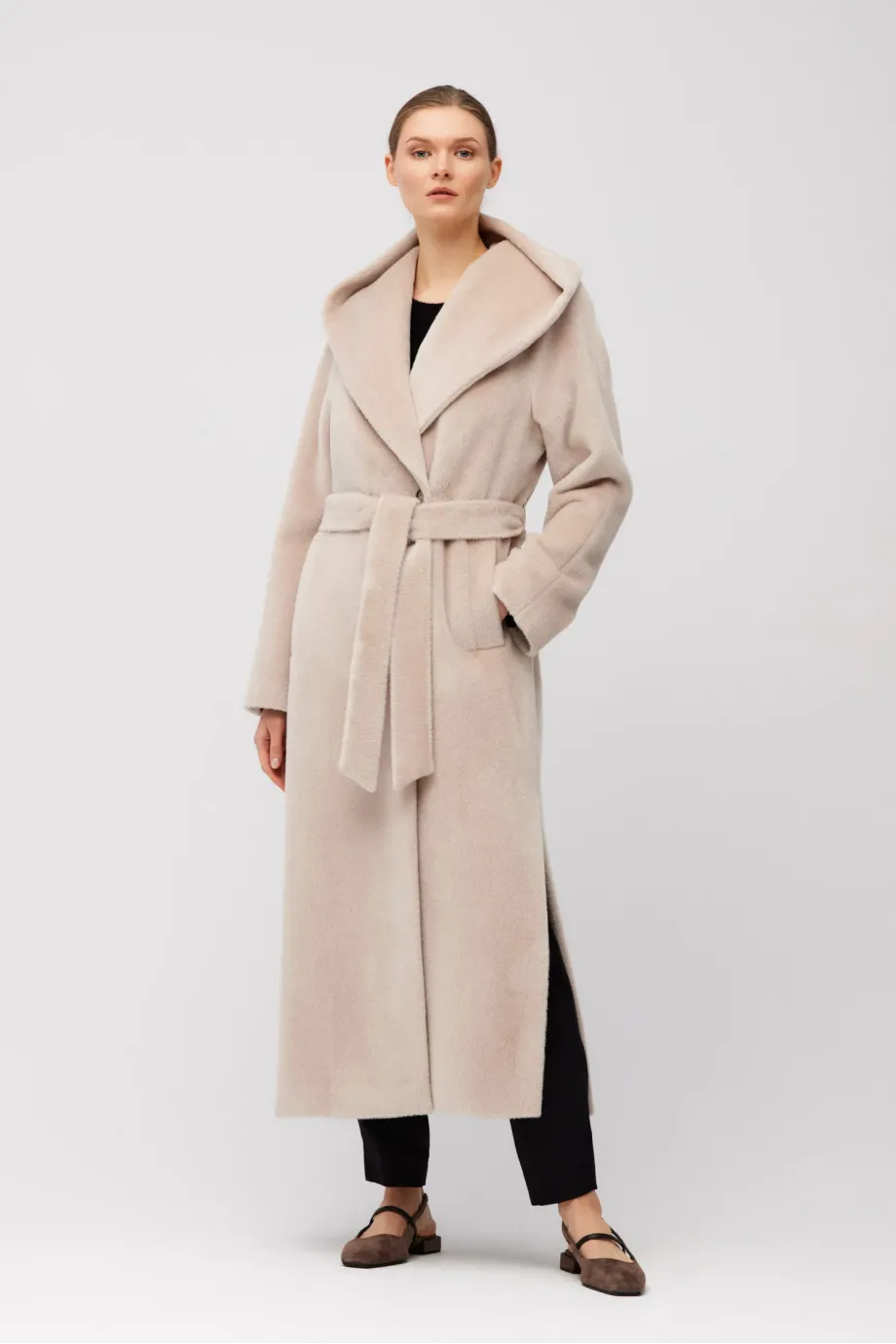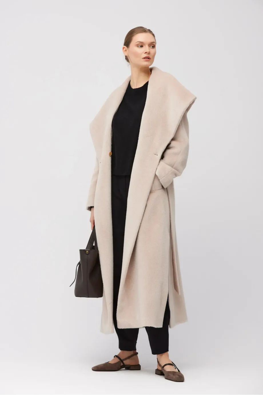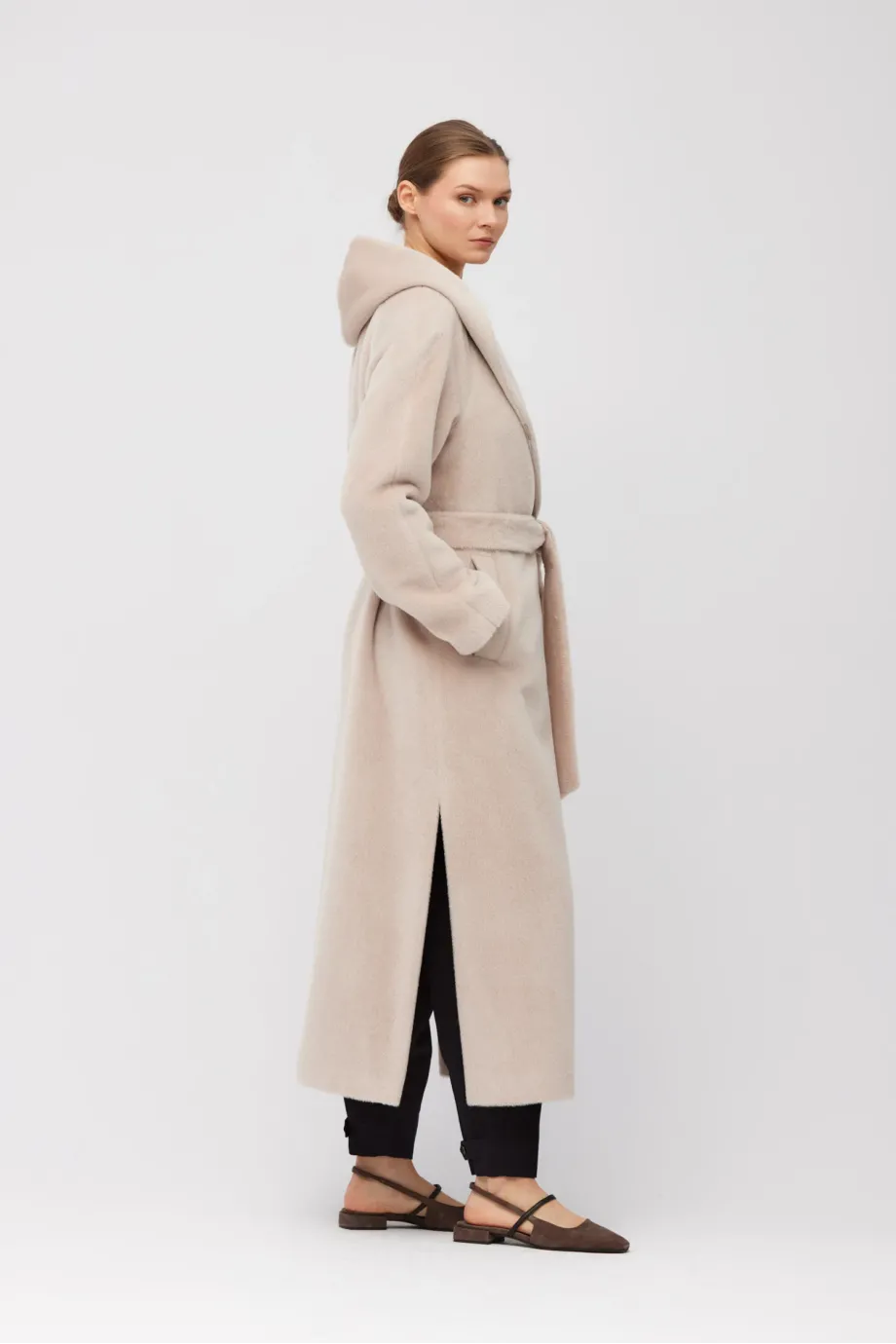 Jednoduchý střih v maxi délce, vyrobený z měkké tkaniny s příměsí baby suri alpaky. Pásek v pase, raglánové rukávy a šálový límec přecházející v kapuci. Boční rozparky. Celý model je podšitý, s ozdobným prošitím, pipingem a lemováním z vnitřní strany. Zapínání na knoflík z přírodního ořechu corozo.