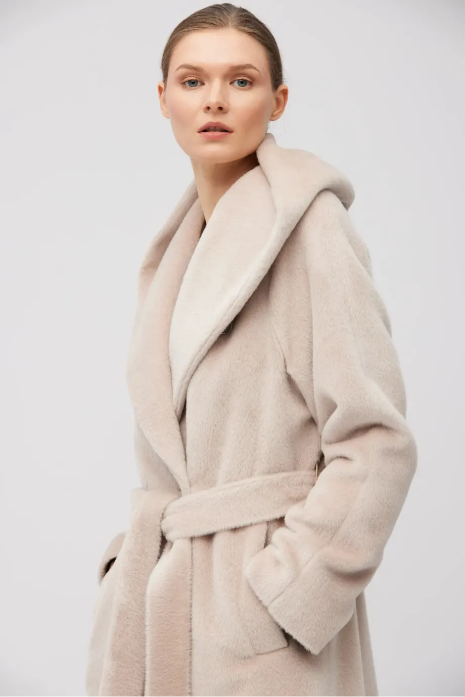 Maxi kabát z baby suri alpaky s kapucí