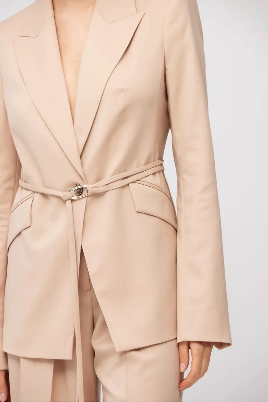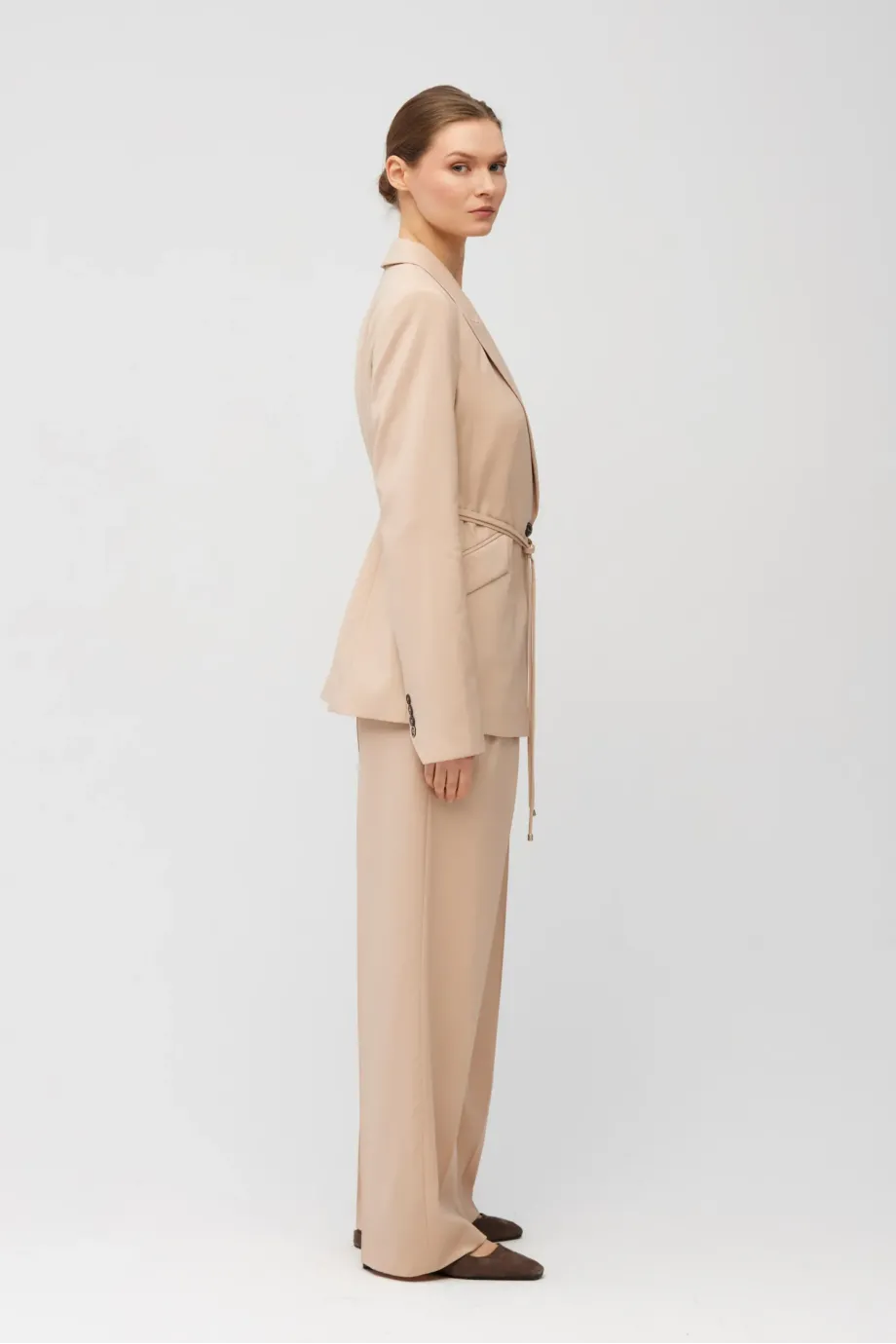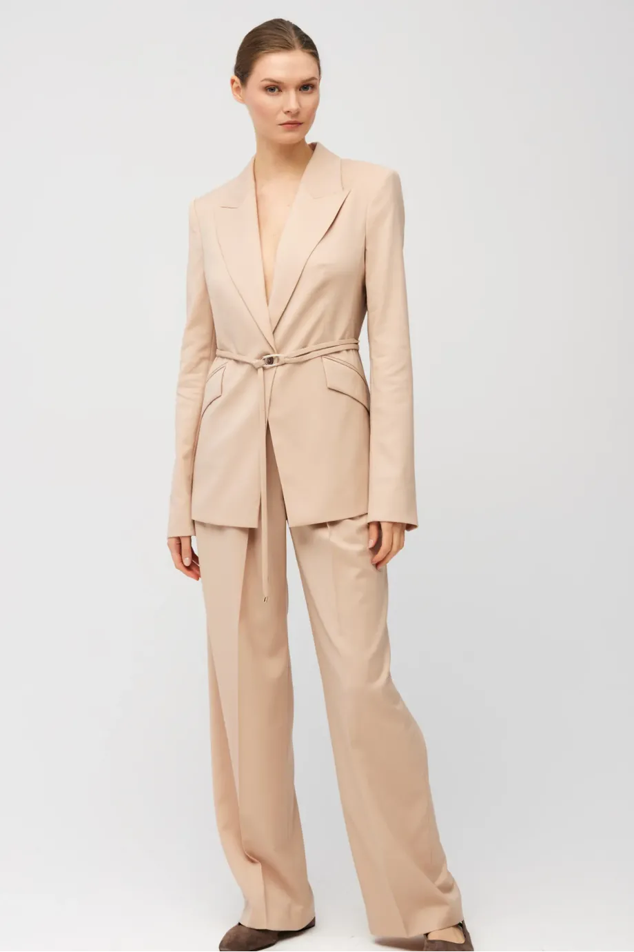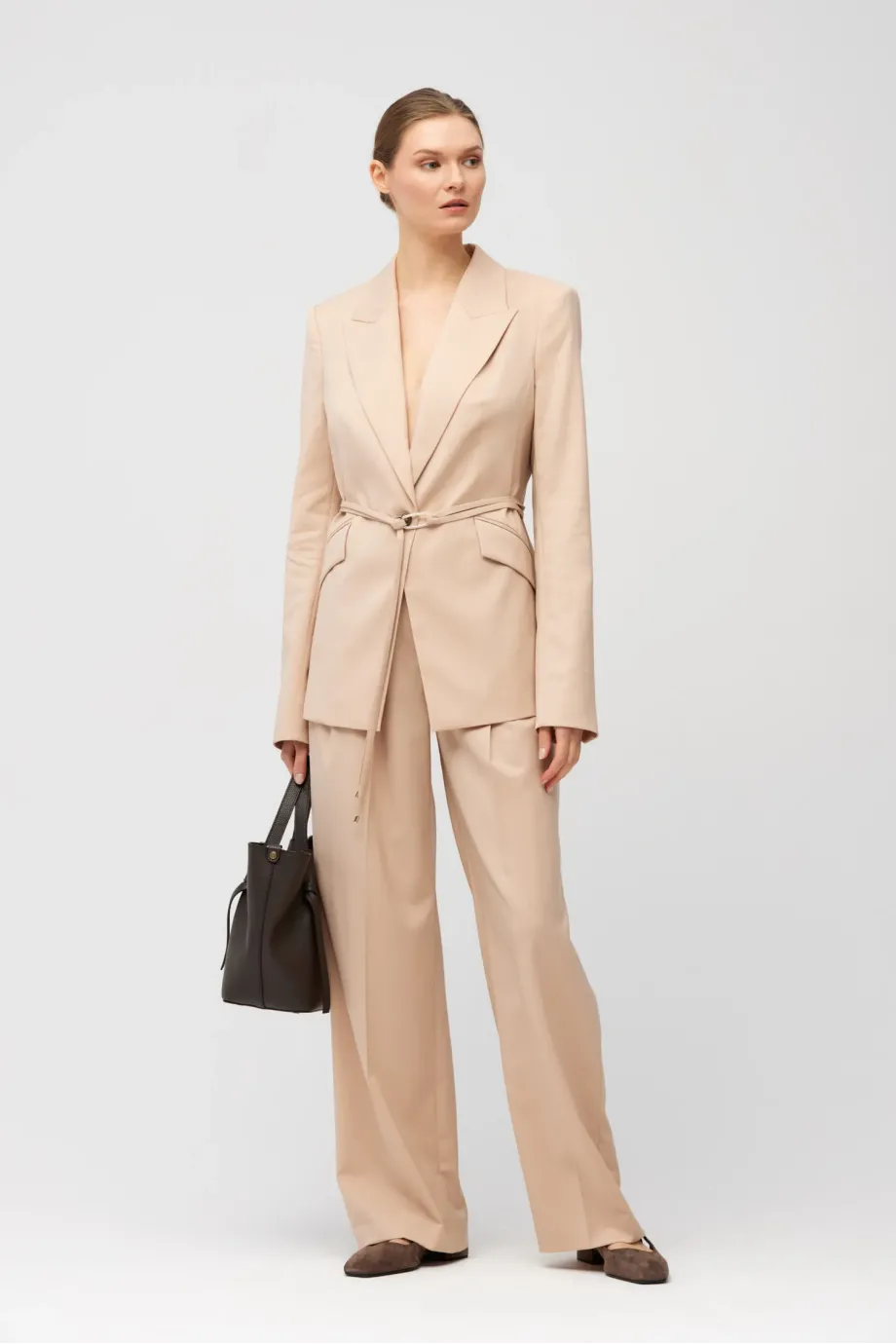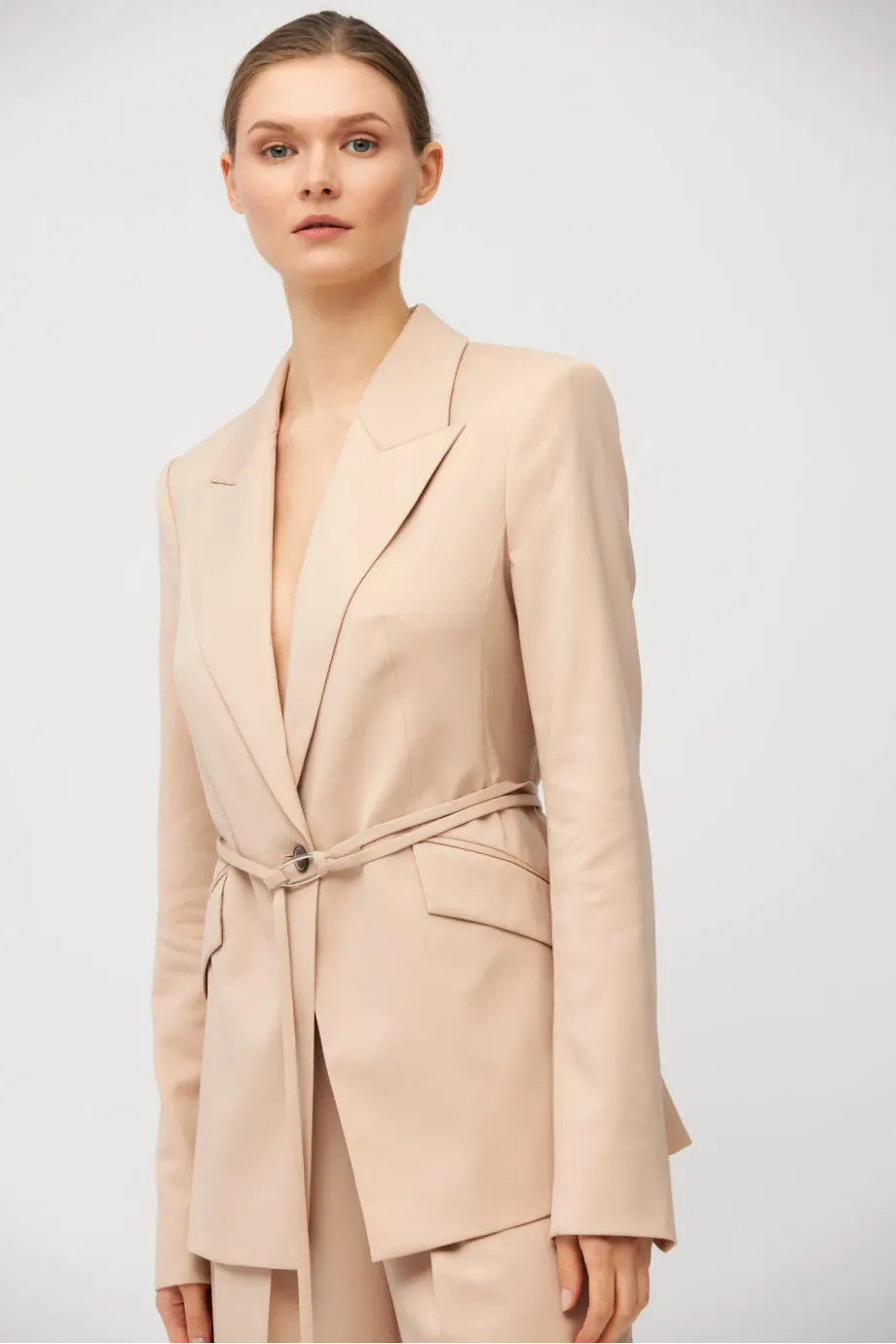 Taliovaný blejzr z panenské vlny v pudrově růžové barvě. Zapínání na jeden knoflík z perleti. Jemně zvýrazněná linie ramen. Model mírně zúžený, dlouhý rukáv, límec. Kapsy s klopami. Celé na podšívce. K doplnění soupravy kalhoty ze stejné látky.