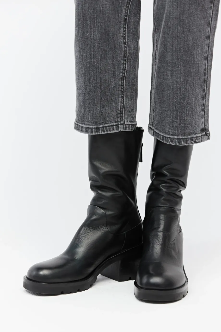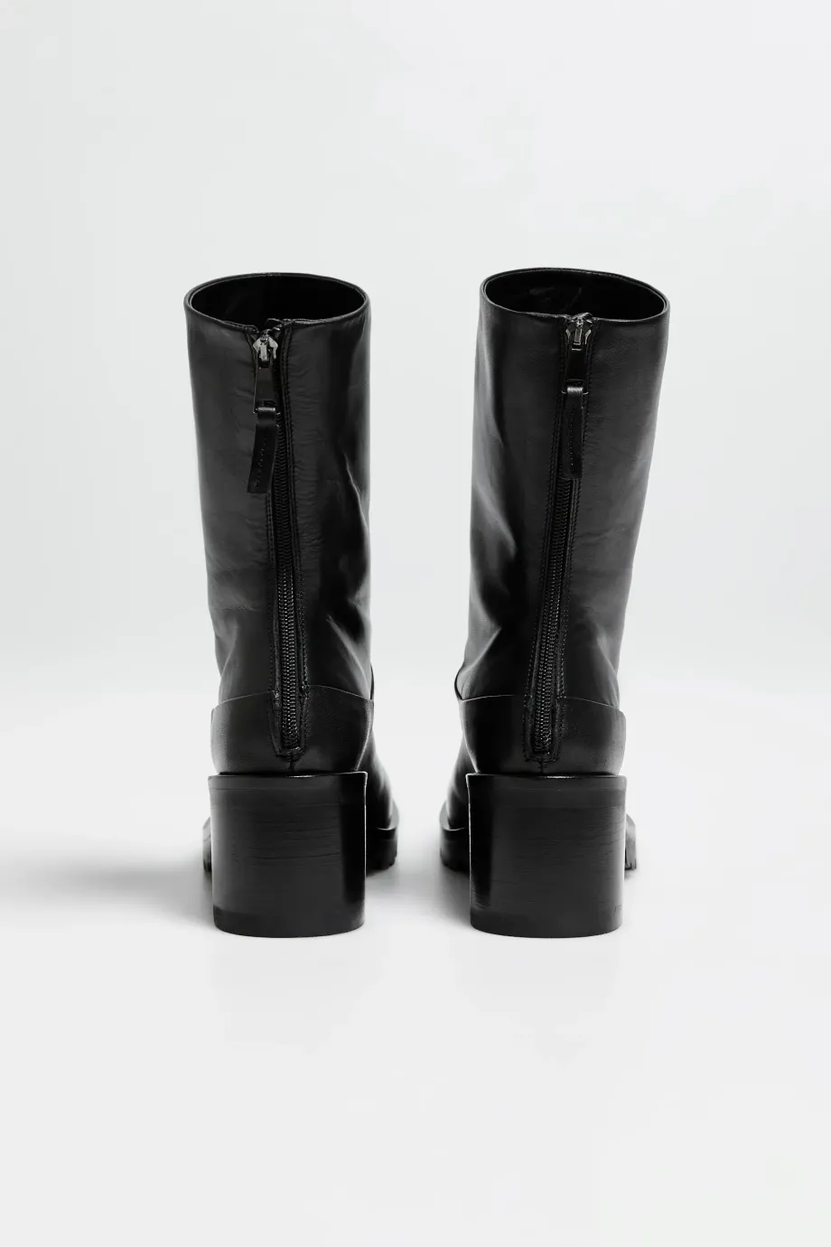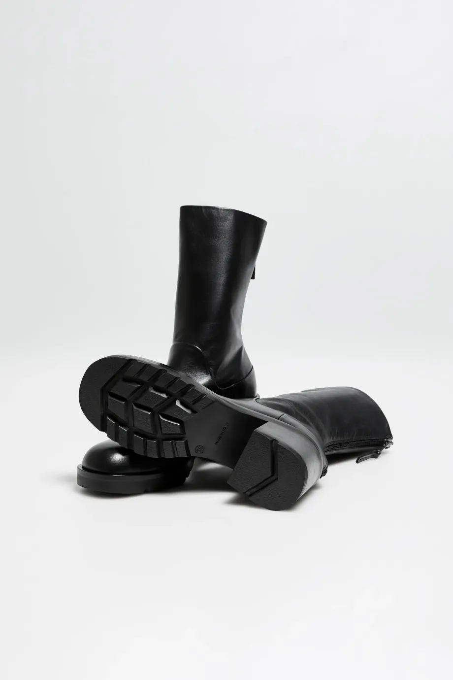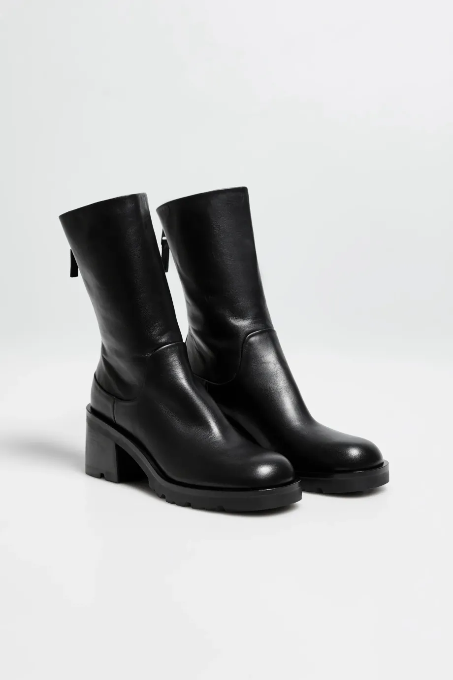 Černé boty, s vysokým koženým svrškem. Zapínání vzadu. Stabilní, masivní podrážka. Ručně šité v italské manufaktuře.