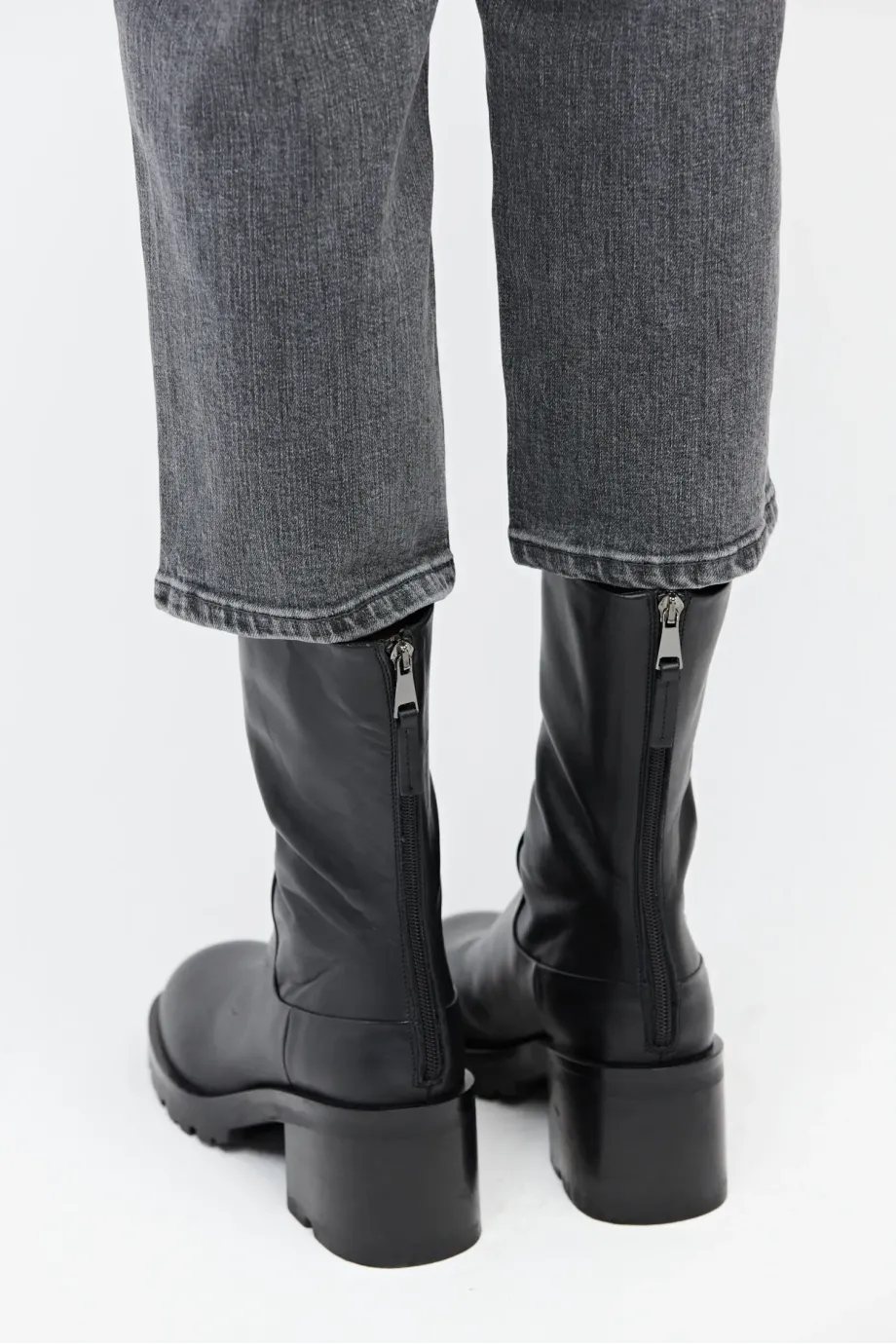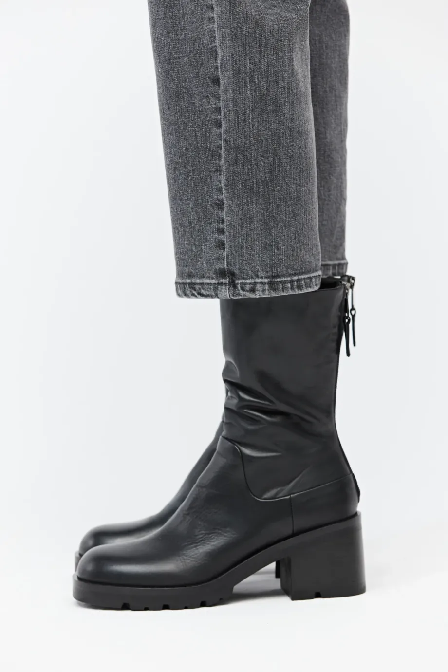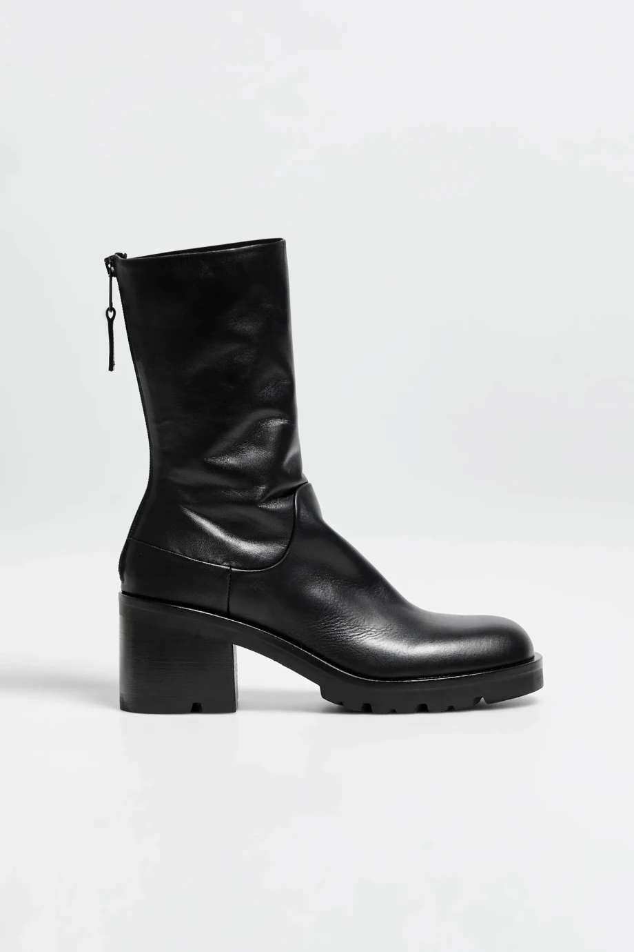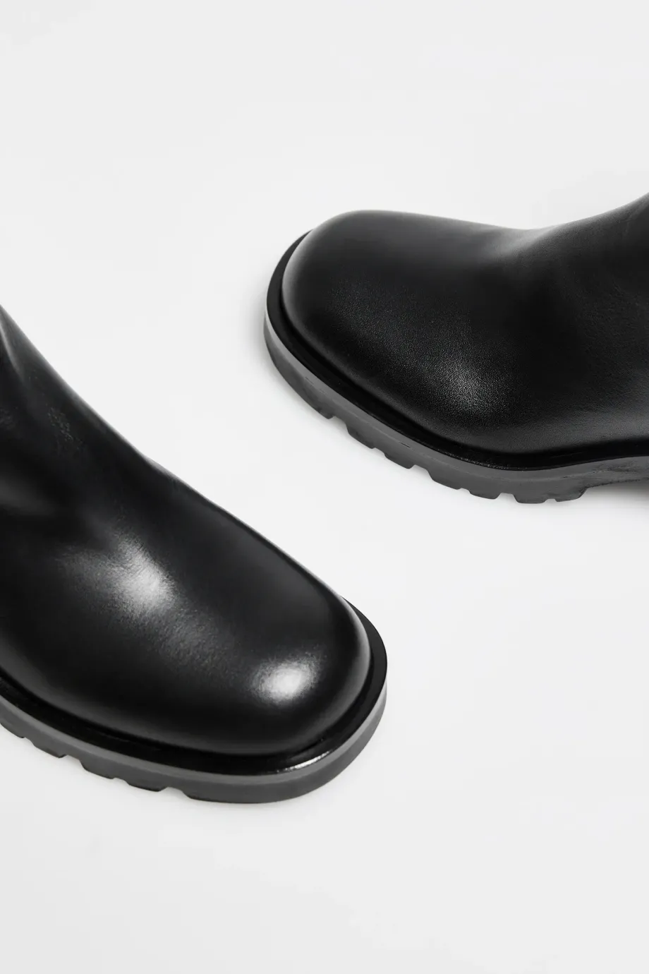 Černé boty, s vysokým koženým svrškem. Zapínání vzadu. Stabilní, masivní podrážka. Ručně šité v italské manufaktuře.
