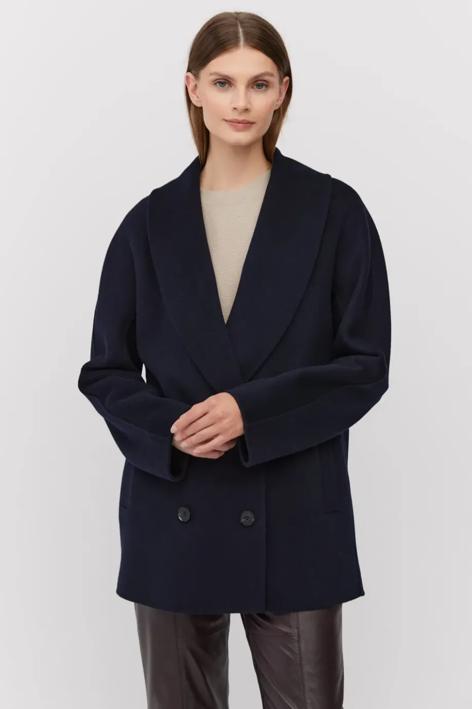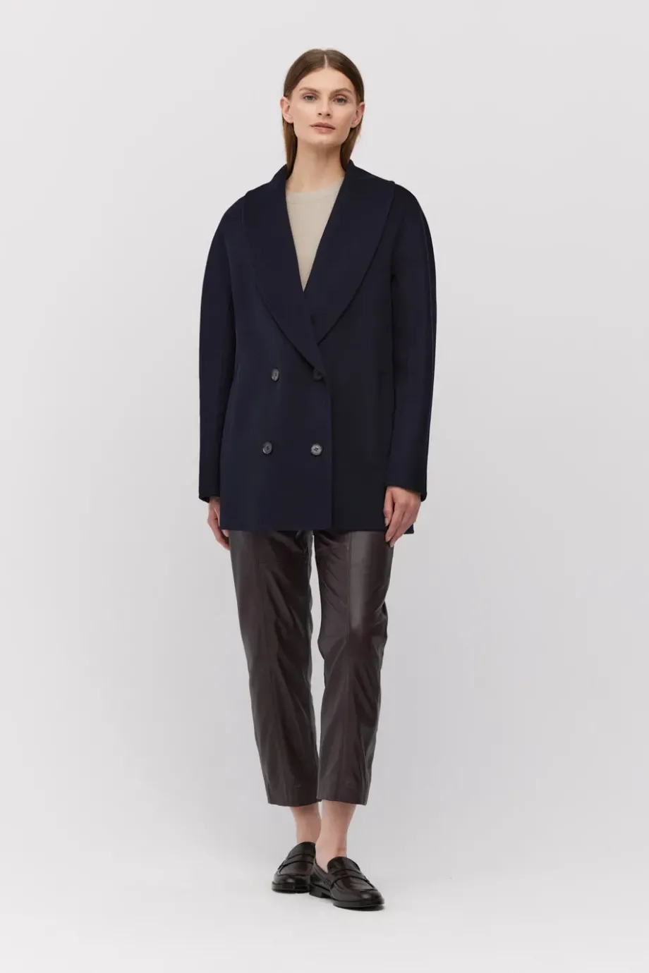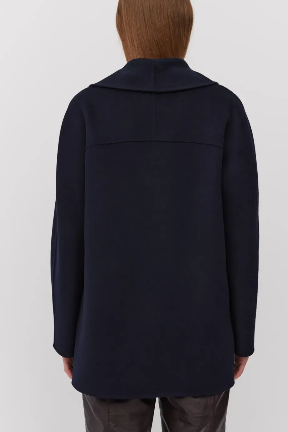 Lehká, nepodšívaná bunda jednoduchého, volného střihu. Tkanina doubleface – směs vlny a hedvábí. Dvoupřezkový model s kapsami a šálovým límcem. Barva námořnická modrá.