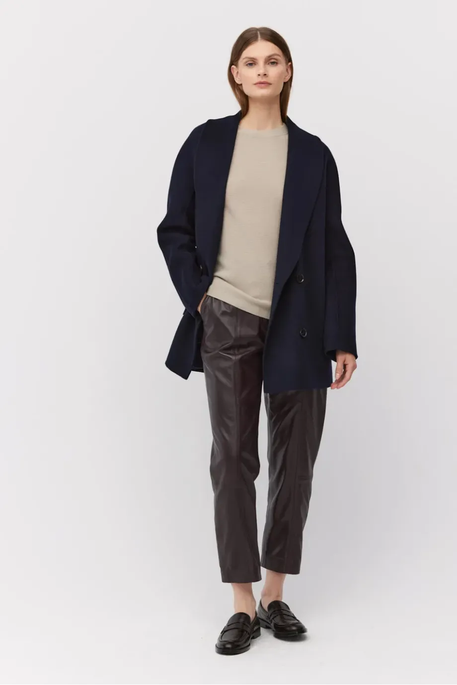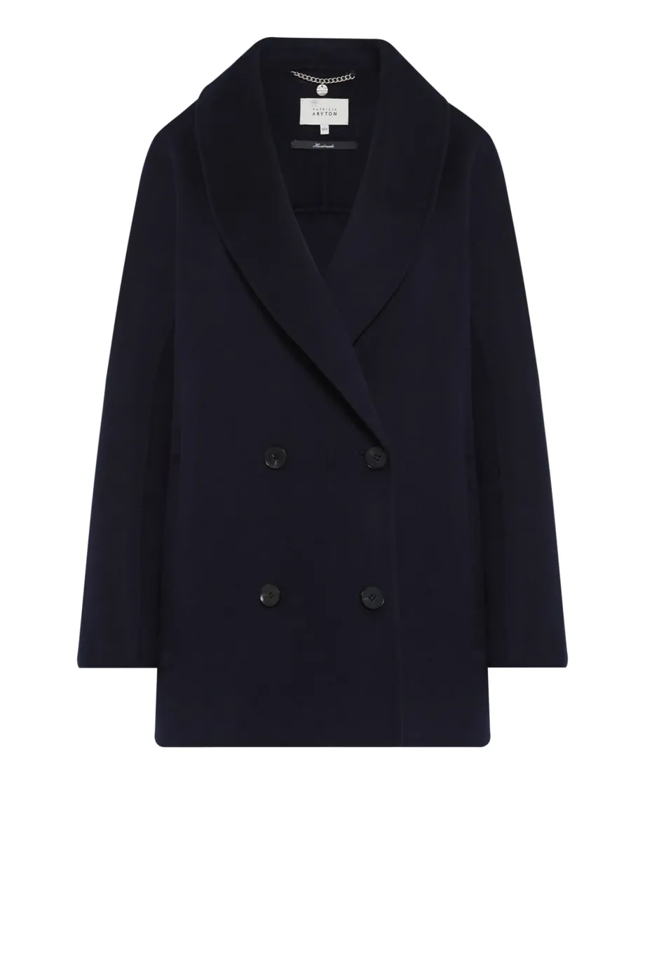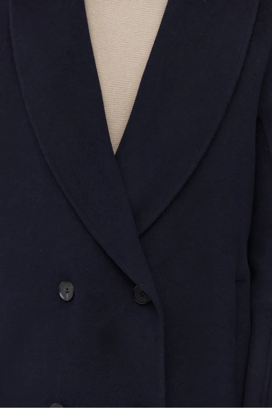 Lehká, nepodšívaná bunda jednoduchého, volného střihu. Tkanina doubleface – směs vlny a hedvábí. Dvoupřezkový model s kapsami a šálovým límcem. Barva námořnická modrá.