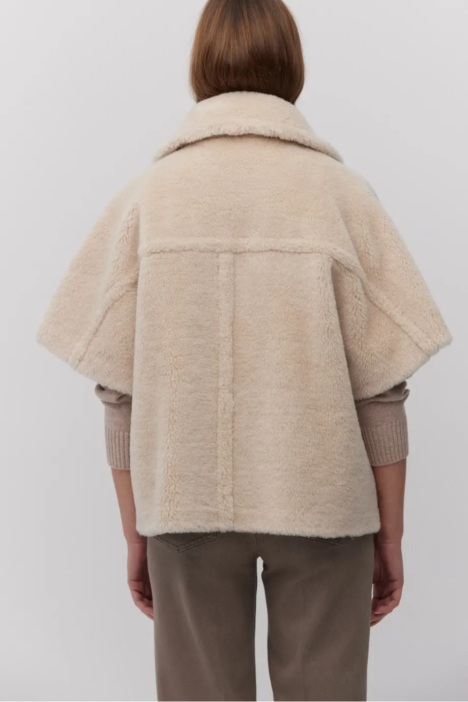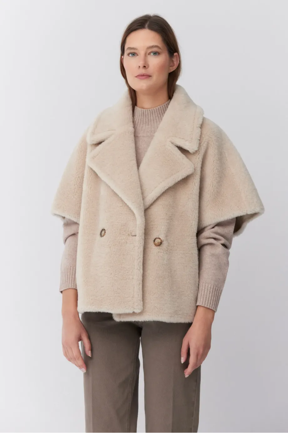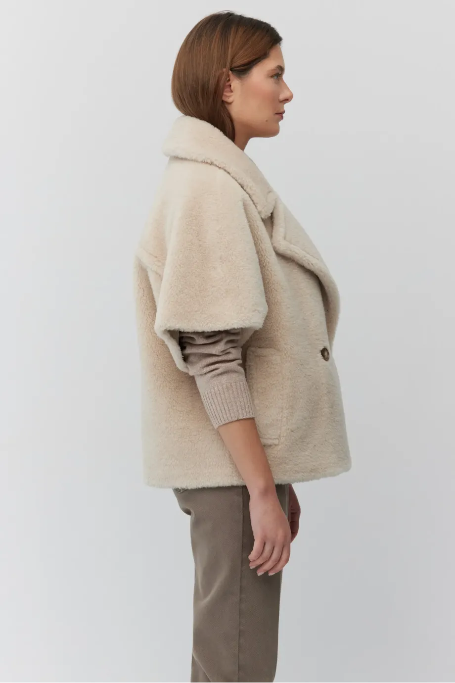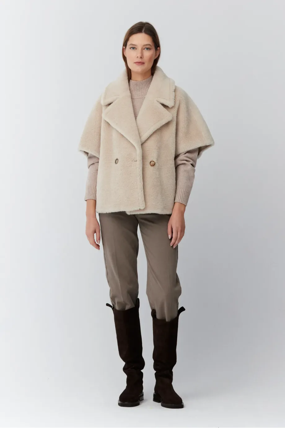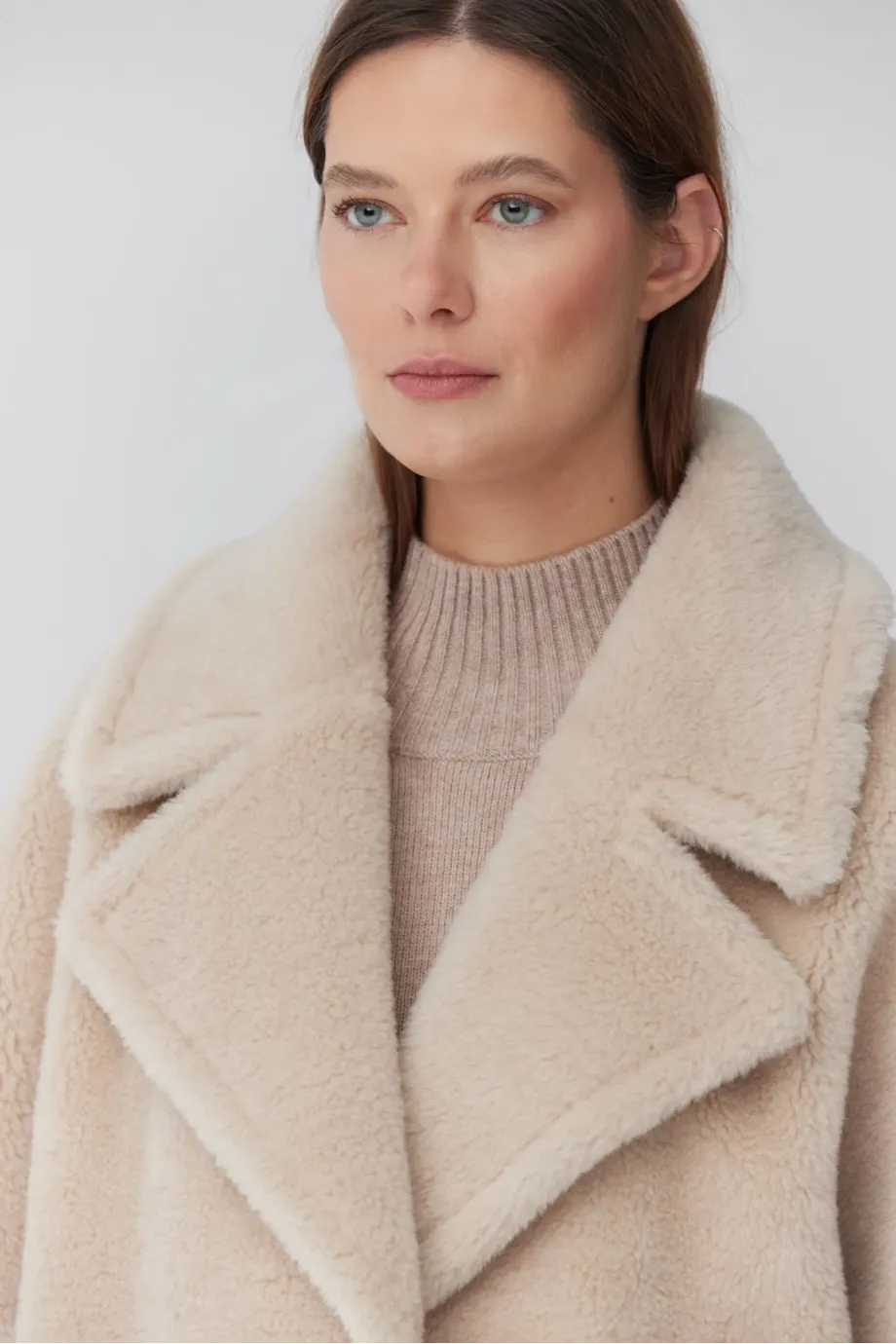 Kabát z vlny typu teddy bear, s jednoduchým střihem a délkou do lokte. Dvouřadový, zapínaný na přírodní knoflíky, s kapsami a velkým límcem.