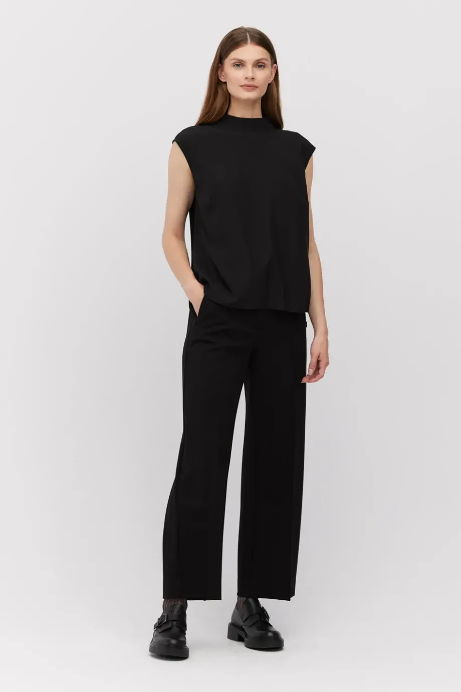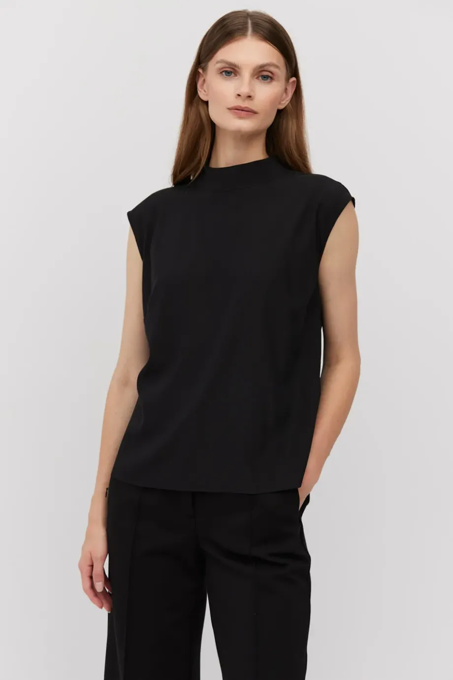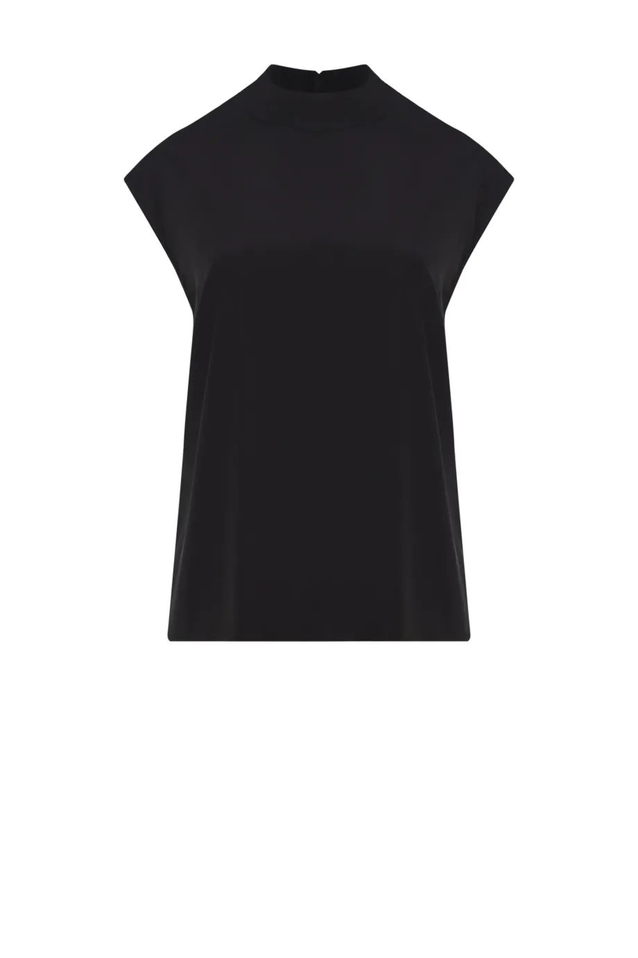 Černá hedvábná blůza. Stojáček s zapínáním na krku. Krátký, klesající rukáv. Jednoduchý, volný střih.