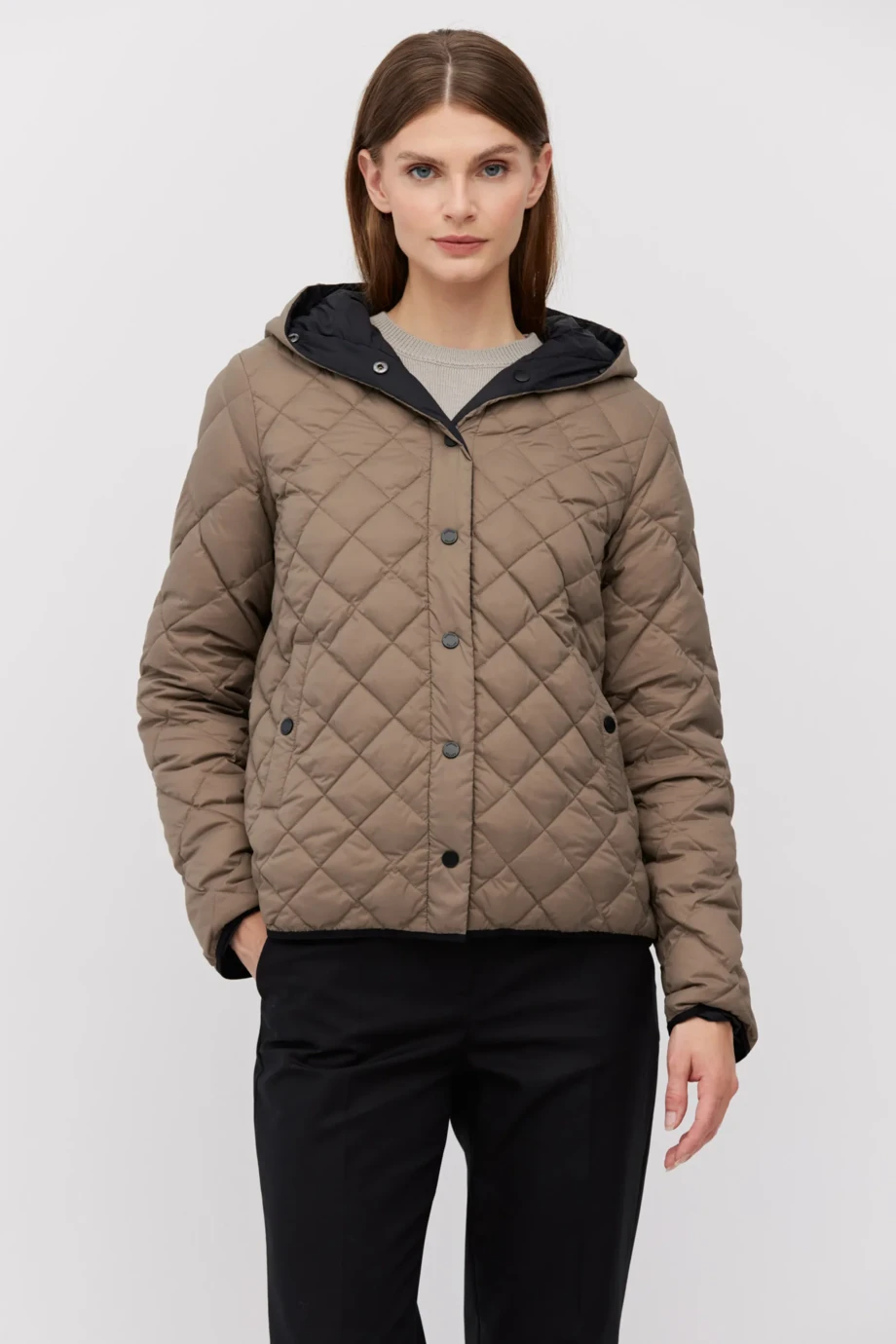Oboustranná bunda s kapucí v odstínech světlé hnědé a černé, plněná přírodním peřím. Lehké, zapíná se na patentky, s kapsami. Může být nošena samostatně nebo jako dodatečné zateplení pod kabát.