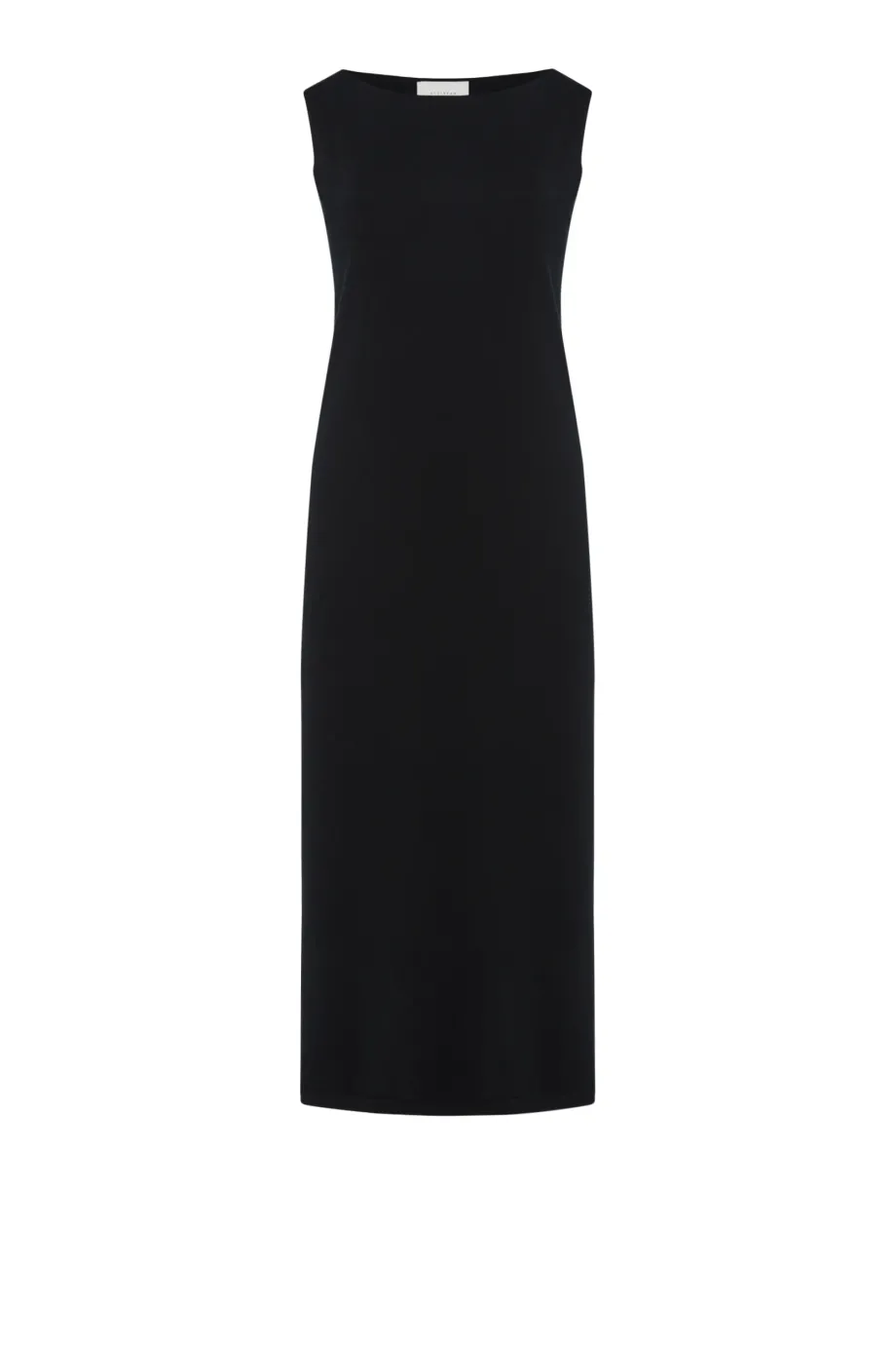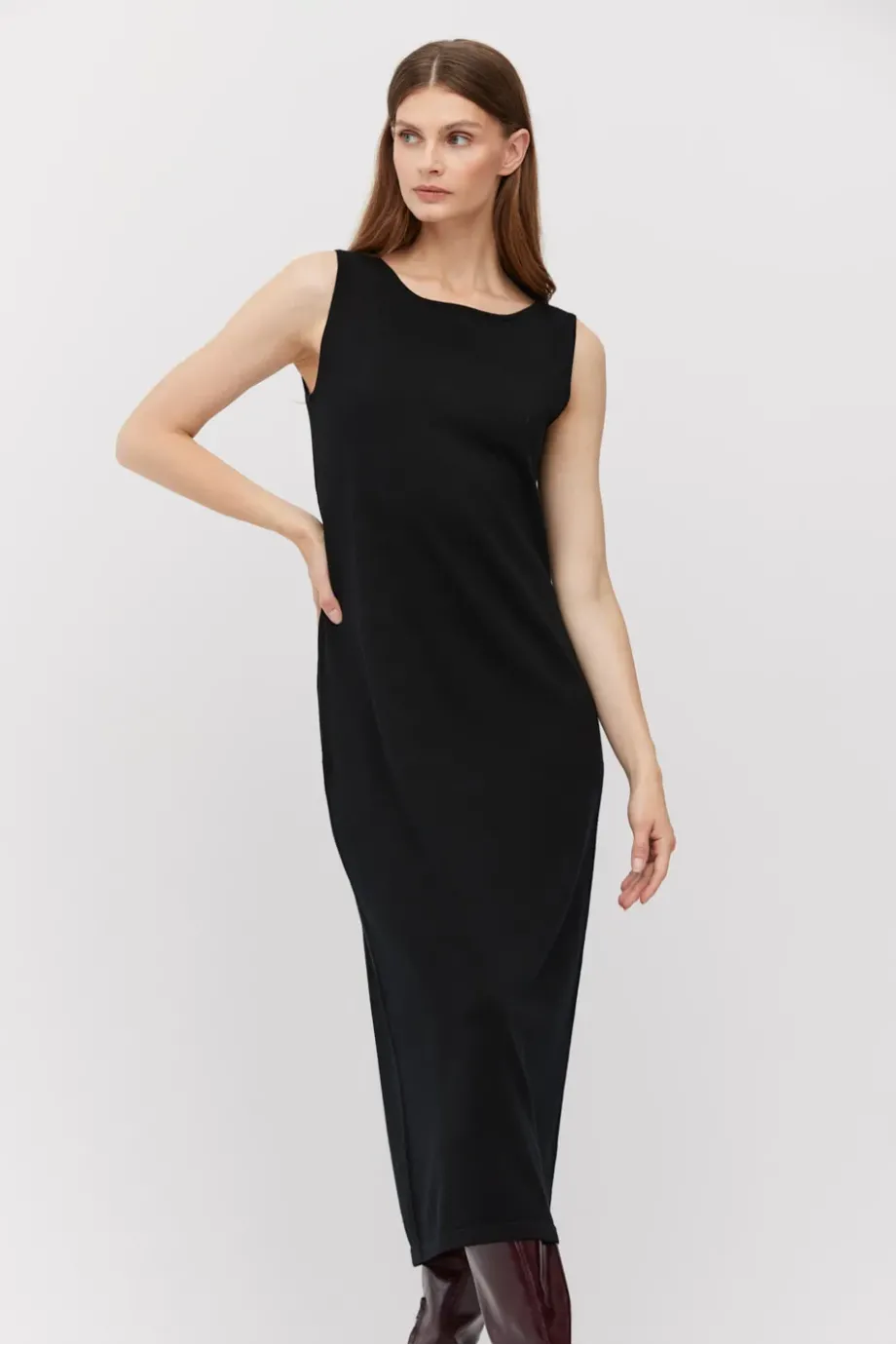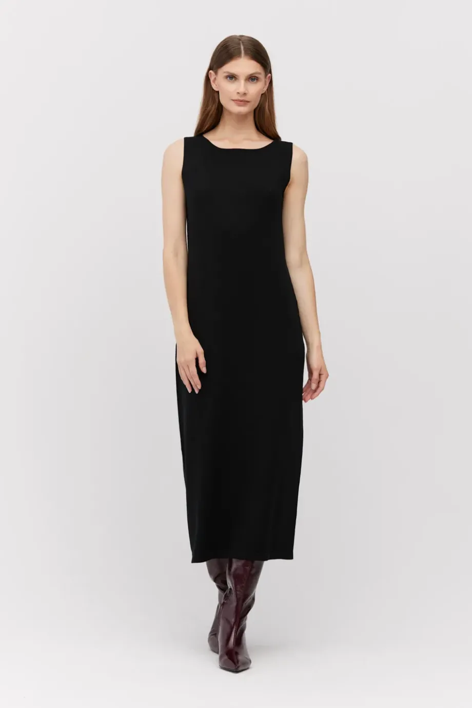 Černé midi šaty z merinové vlny. Bez rukávů, s kulatým výstřihem a přiléhavým střihem. Vyrobeno jemným stehem single jersey na stroji s uiglením 12 GG.