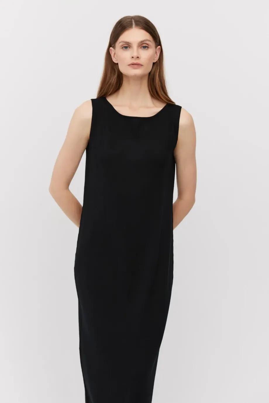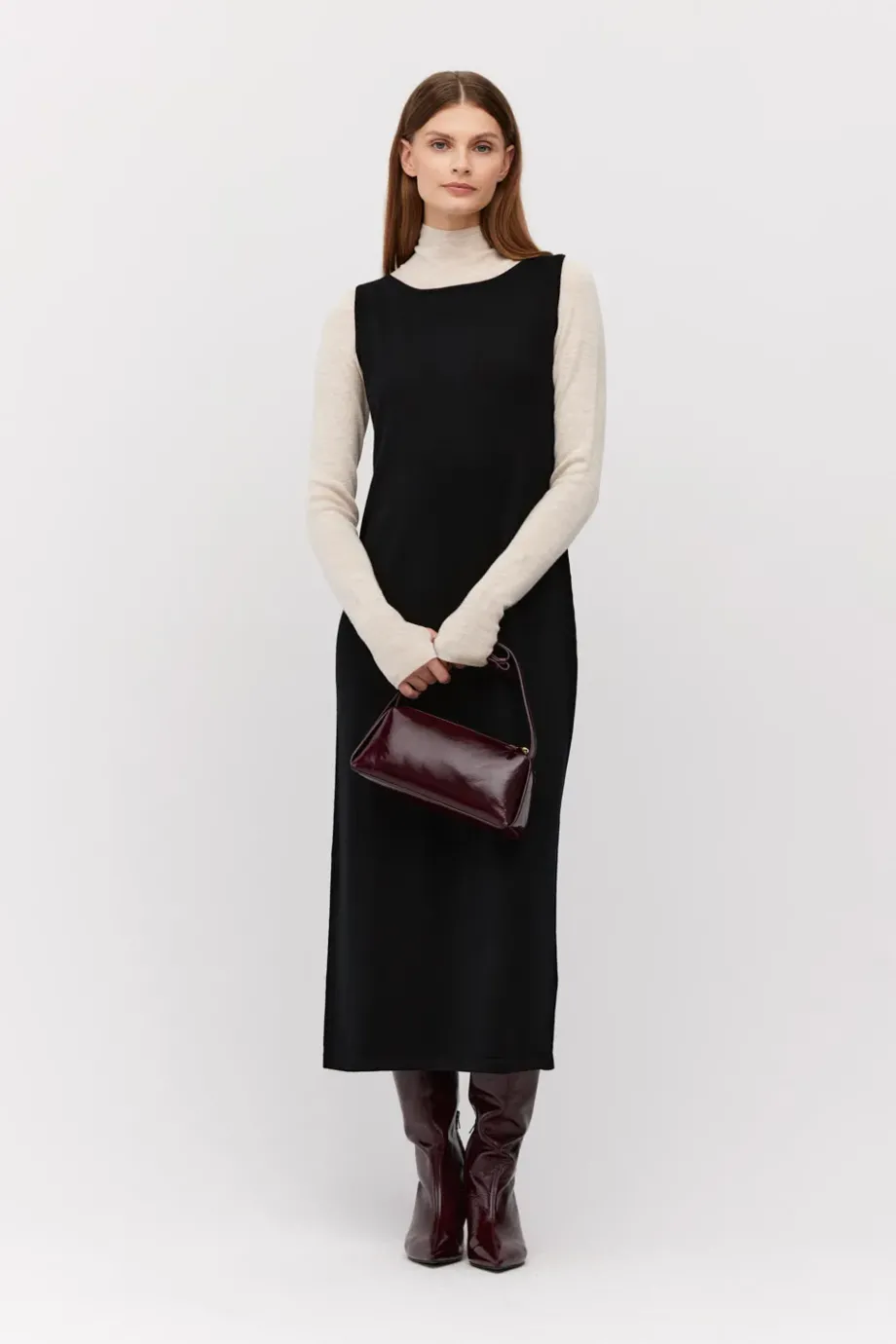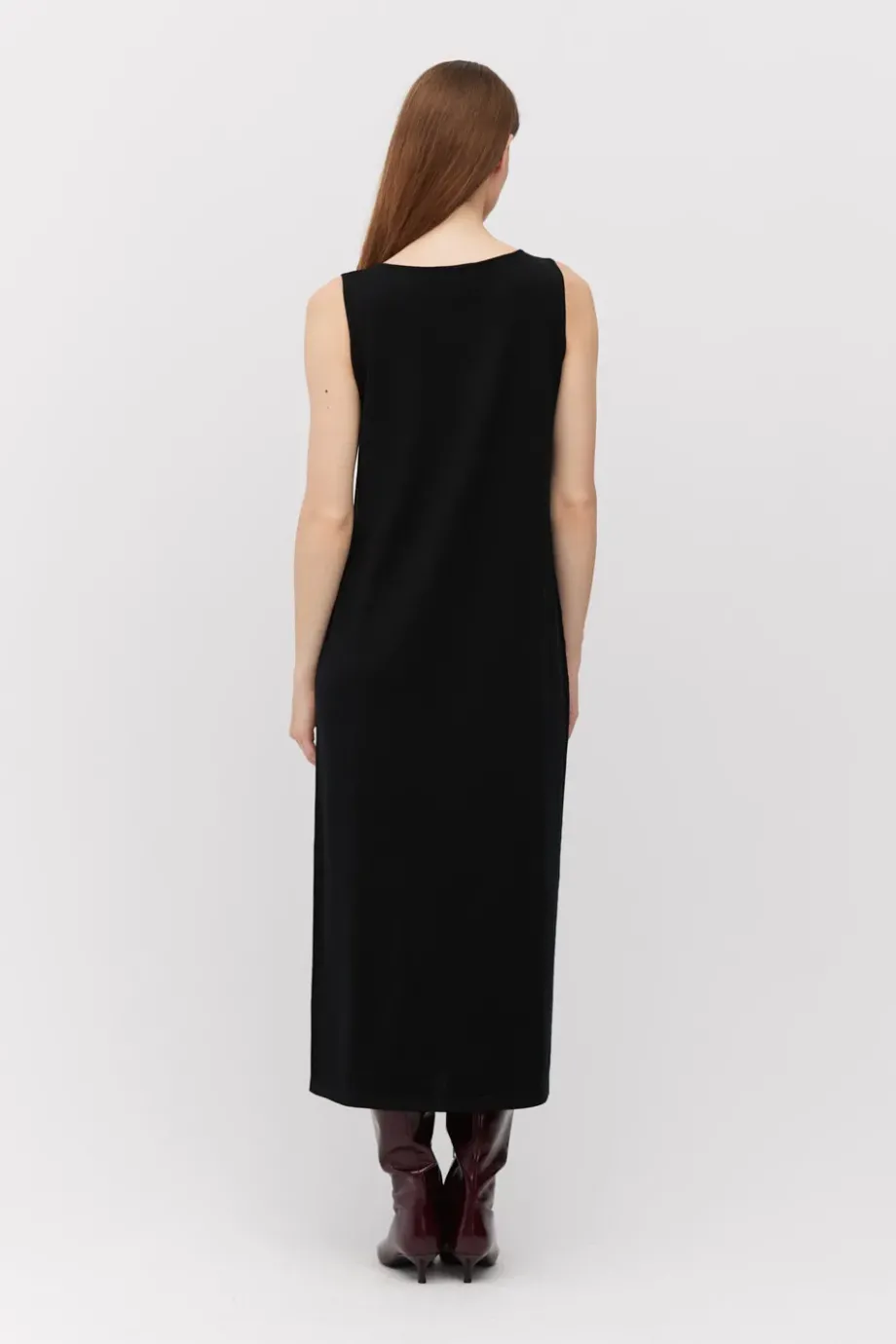 Černé midi šaty z merinové vlny. Bez rukávů, s kulatým výstřihem a přiléhavým střihem. Vyrobeno jemným stehem single jersey na stroji s uiglením 12 GG.