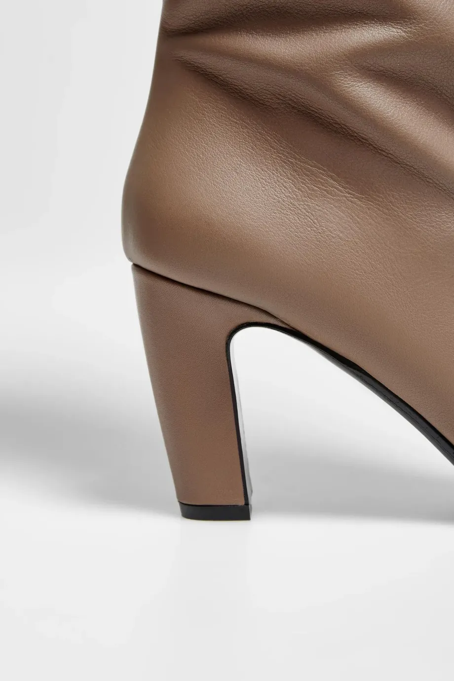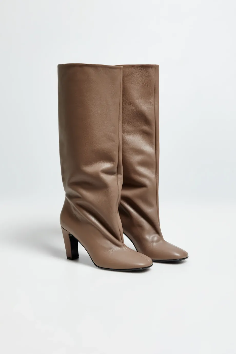 Vkládané kozačky z přírodní hladké kůže v hnědé barvě. Kulatá špička, vysoký podpatek a široký svršek. Minimalistické. Ručně vyrobené v italské manufaktuře.
