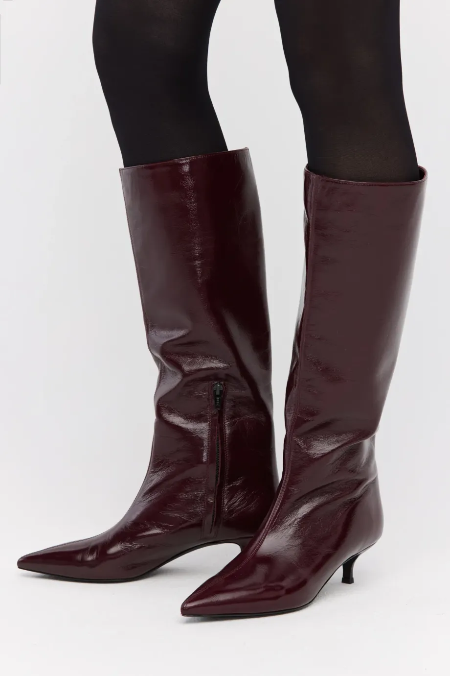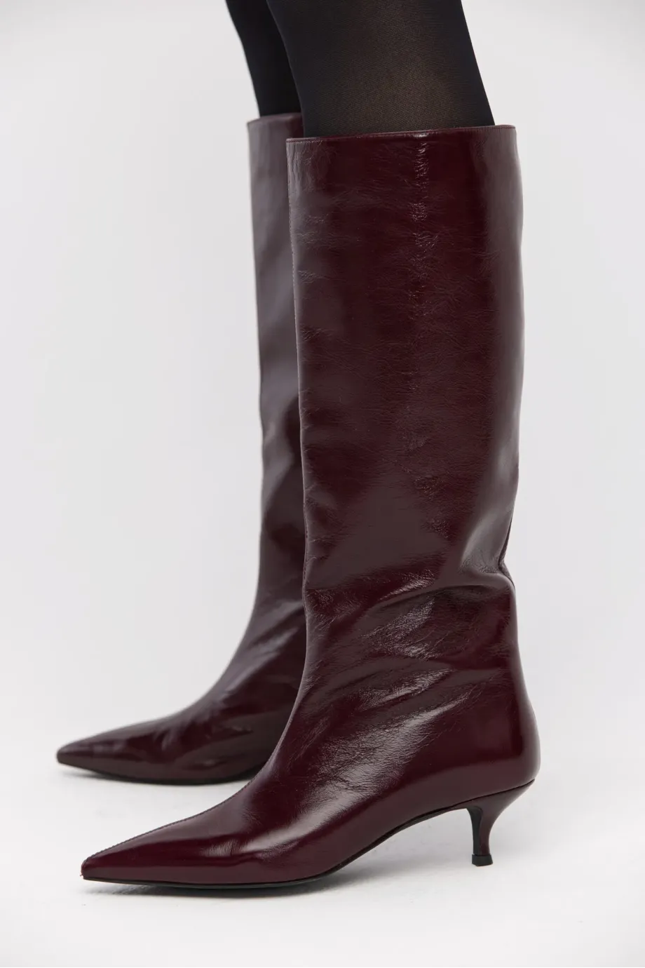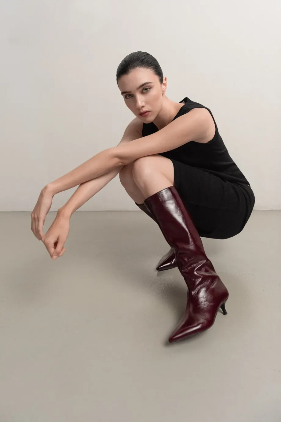 Kozačky z přírodní boxerkové kůže v barvě lilku. Štíhlá, špičatá špička, střední podpatek typu kitten heel. Z boku zapínání. Minimalistické, ručně vyrobené v italské manufaktuře.