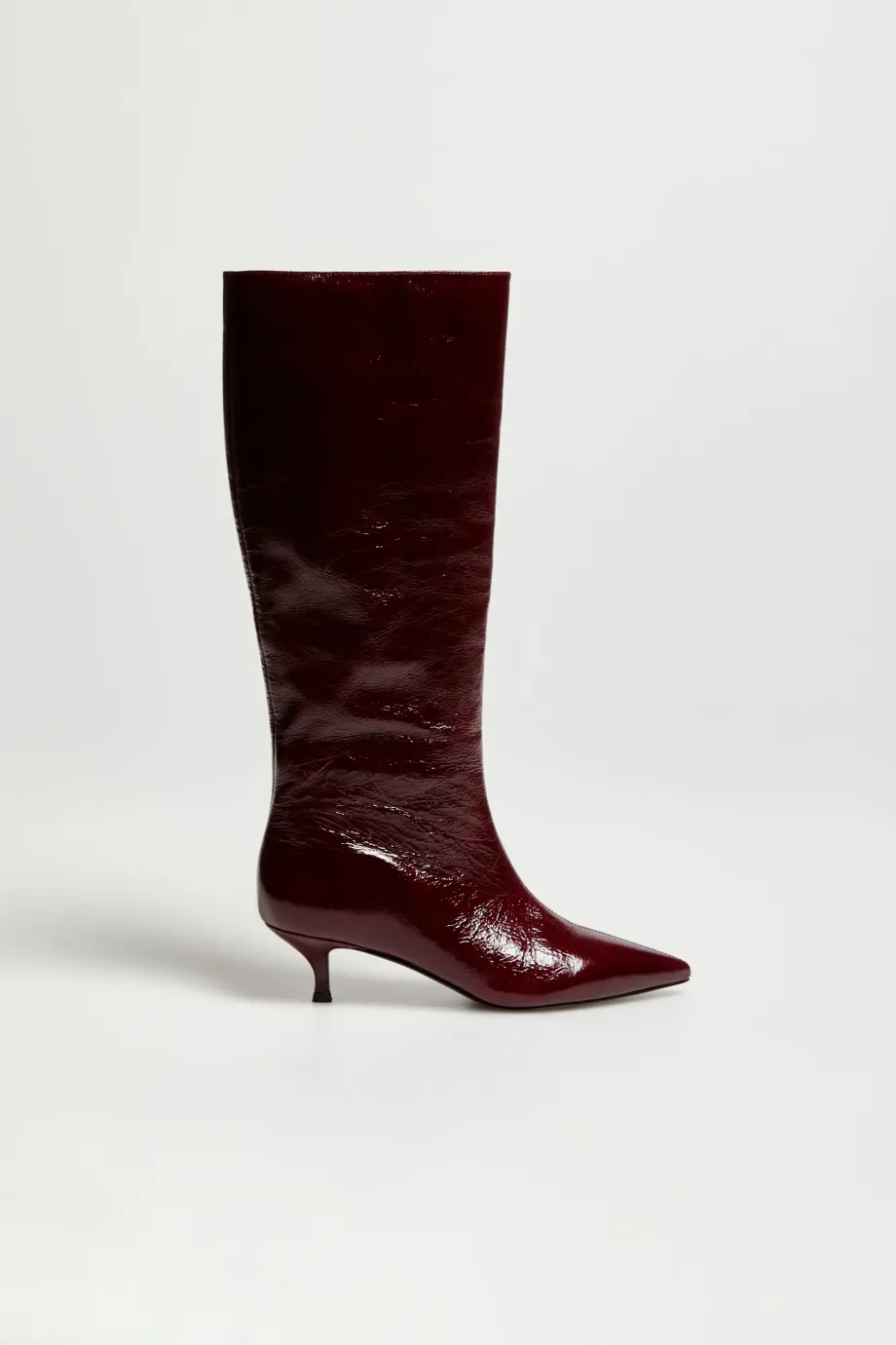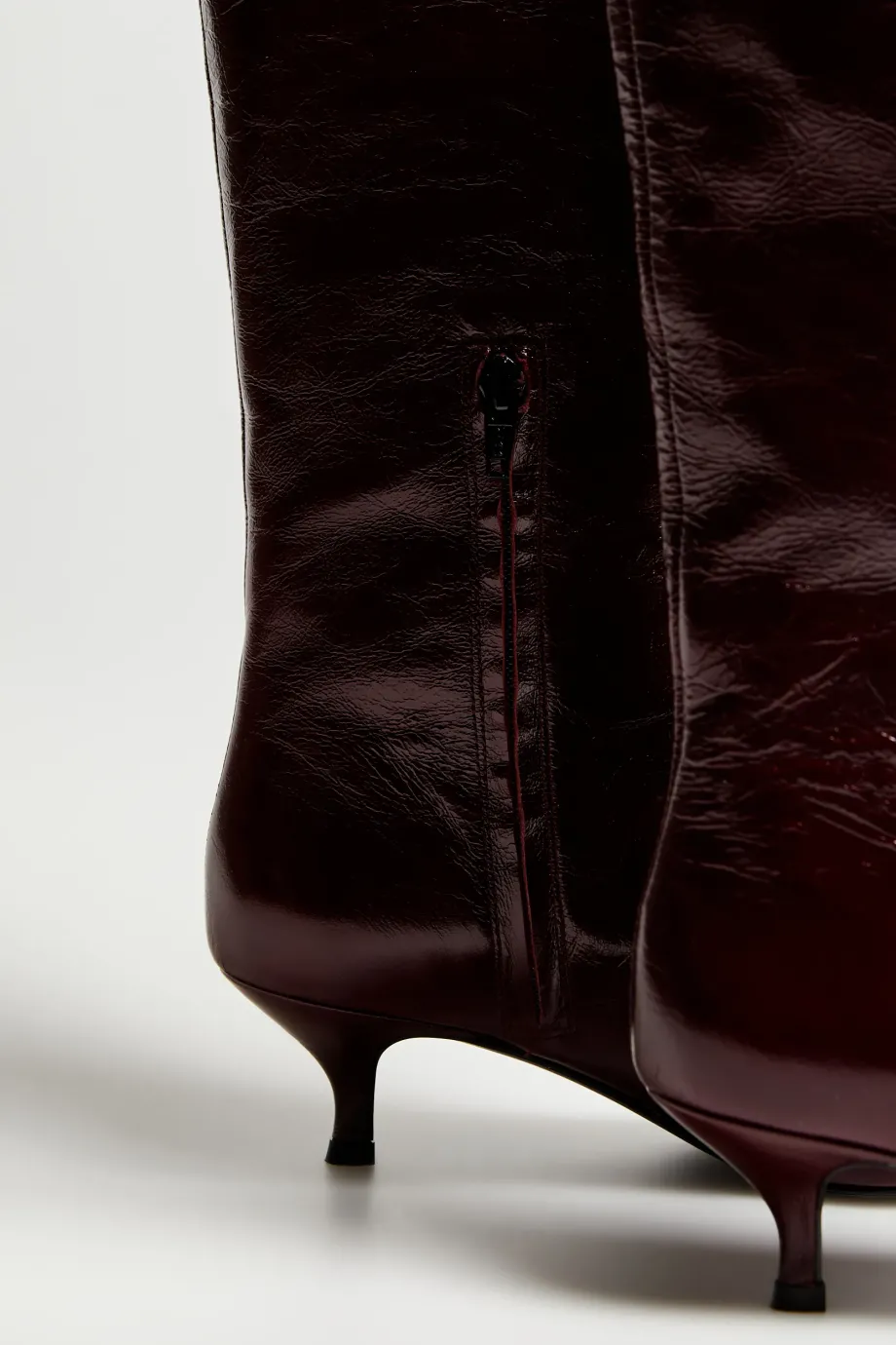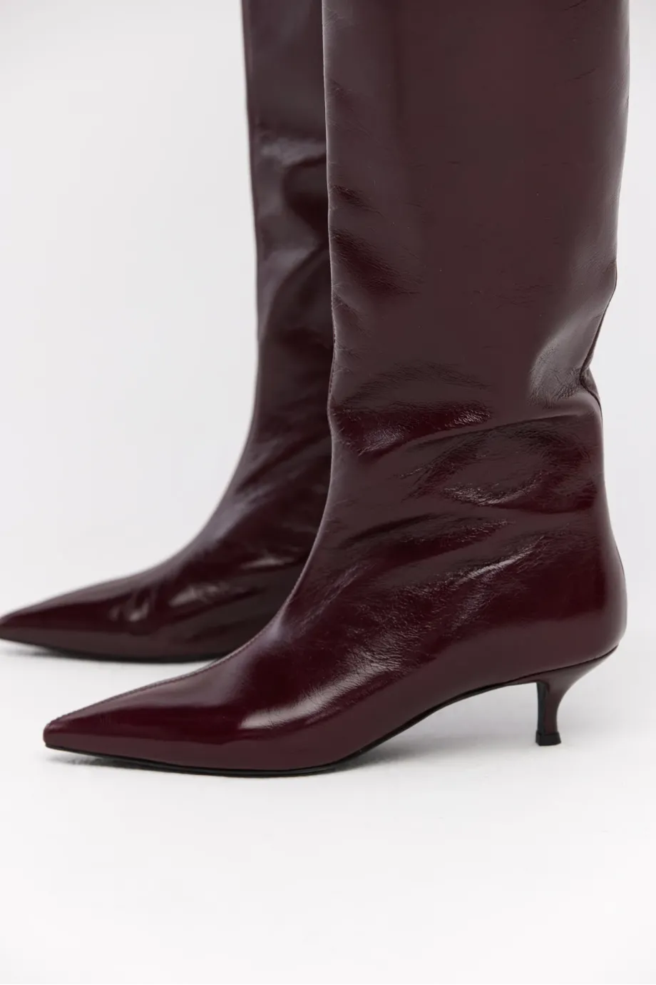 Kozačky z přírodní boxerkové kůže v barvě lilku. Štíhlá, špičatá špička, střední podpatek typu kitten heel. Z boku zapínání. Minimalistické, ručně vyrobené v italské manufaktuře.