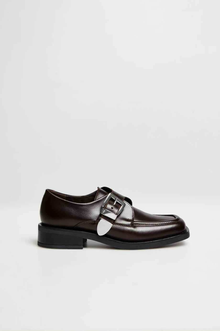 Hnědé polobotky typumnichvyrobené z přírodní kůže, zapínané na přezku. Čtveratá špička. Ručně šité v portugalské manufaktuře,