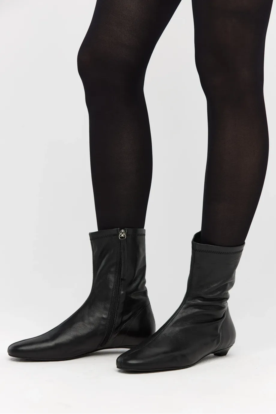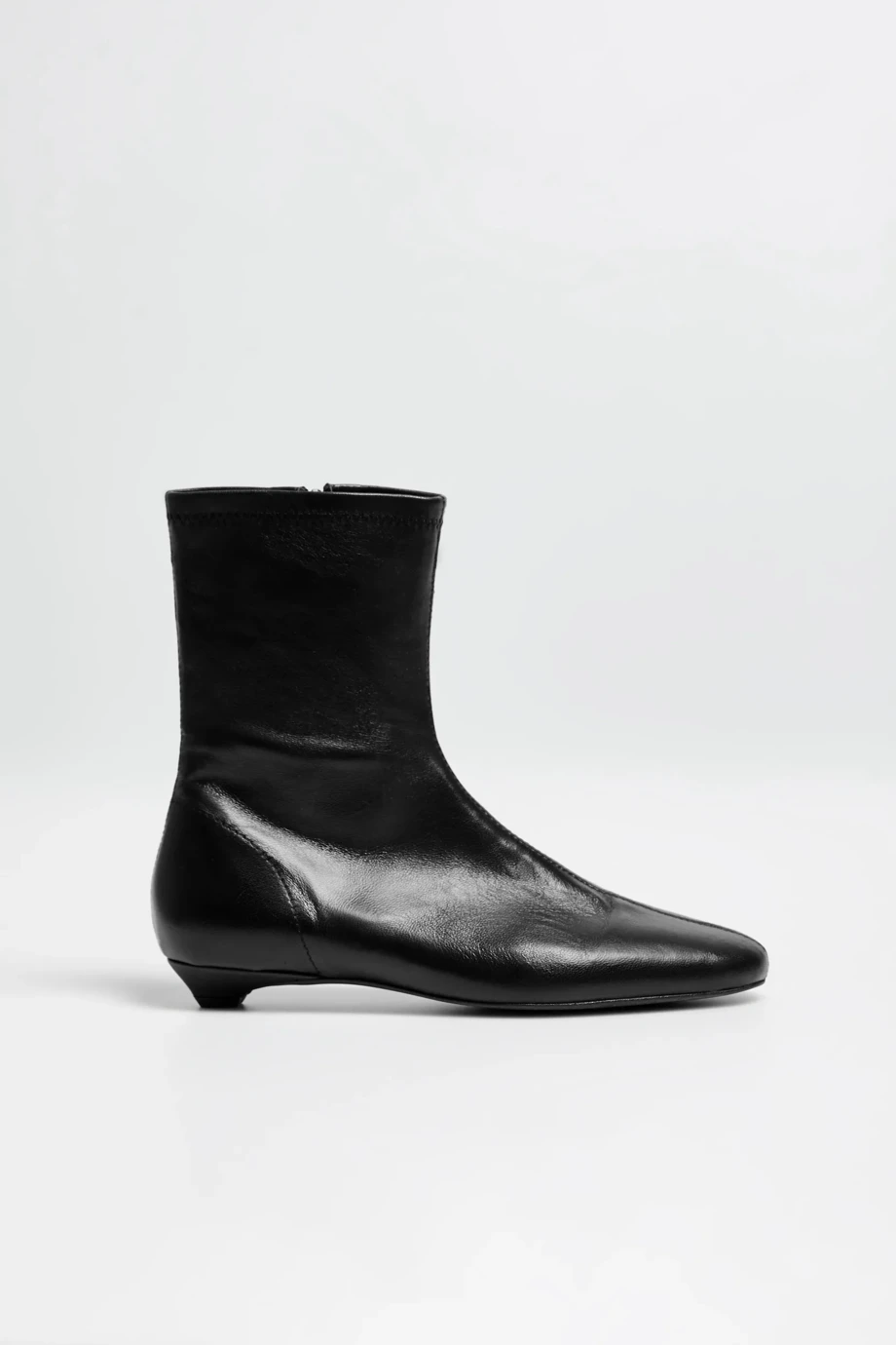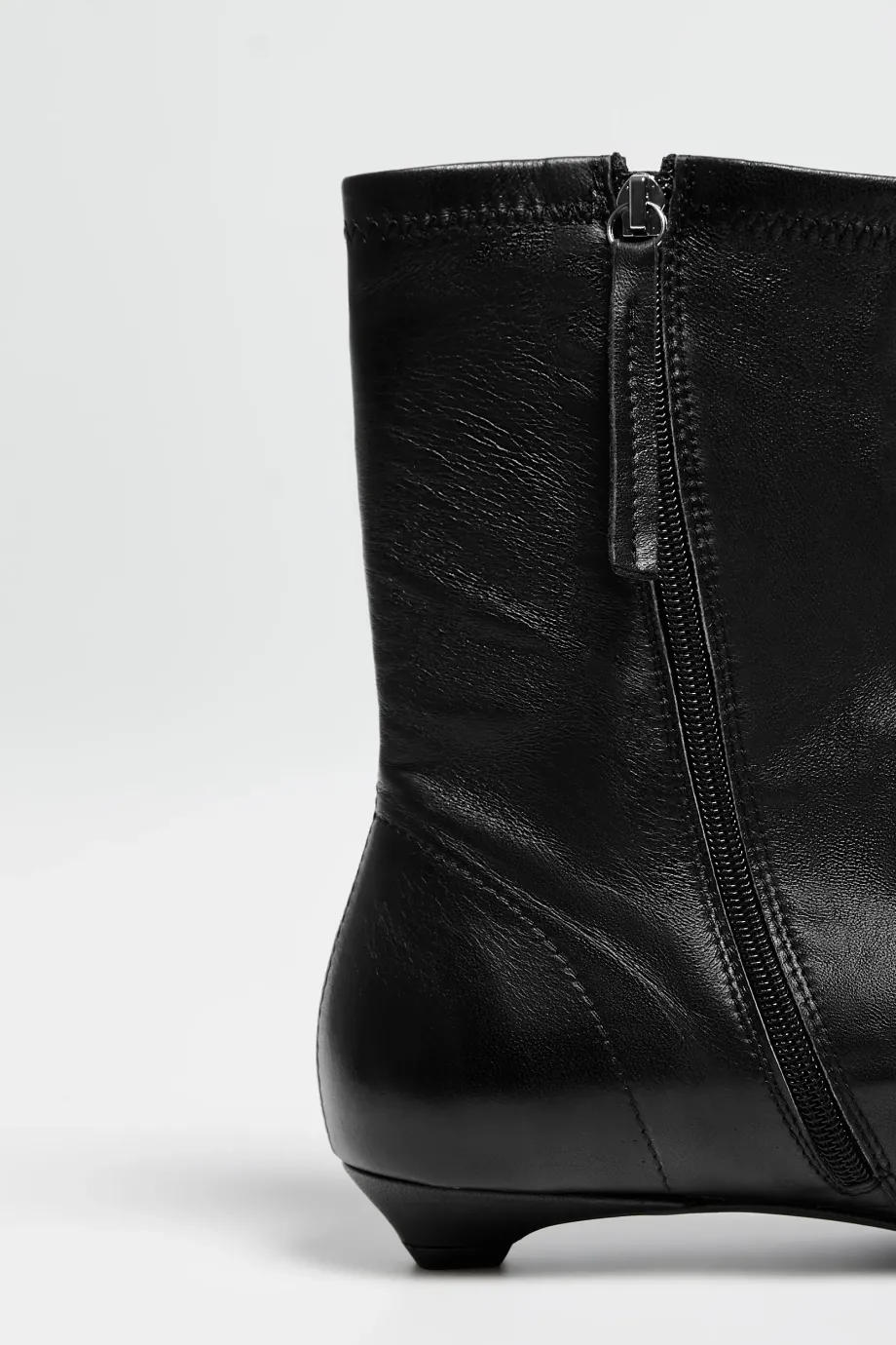Černé botky z velmi měkké, přírodní kůže, ručně vyráběné v polské manufaktuře. Klasický model s jednoduchým svrškem a kulatou špičkou, zapínané na zip, na nízkém podpatku typu kitten heel. Minimalistická forma.