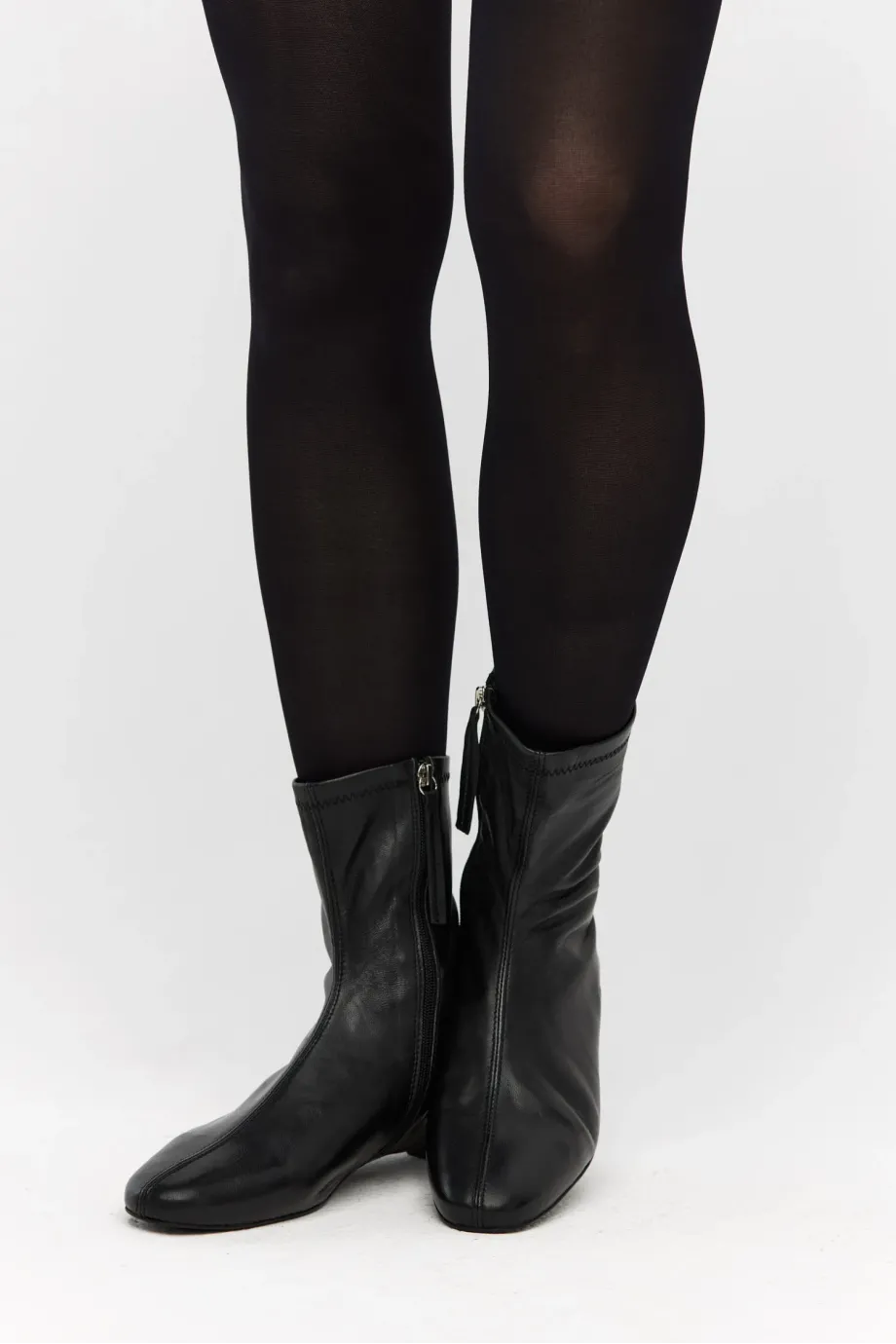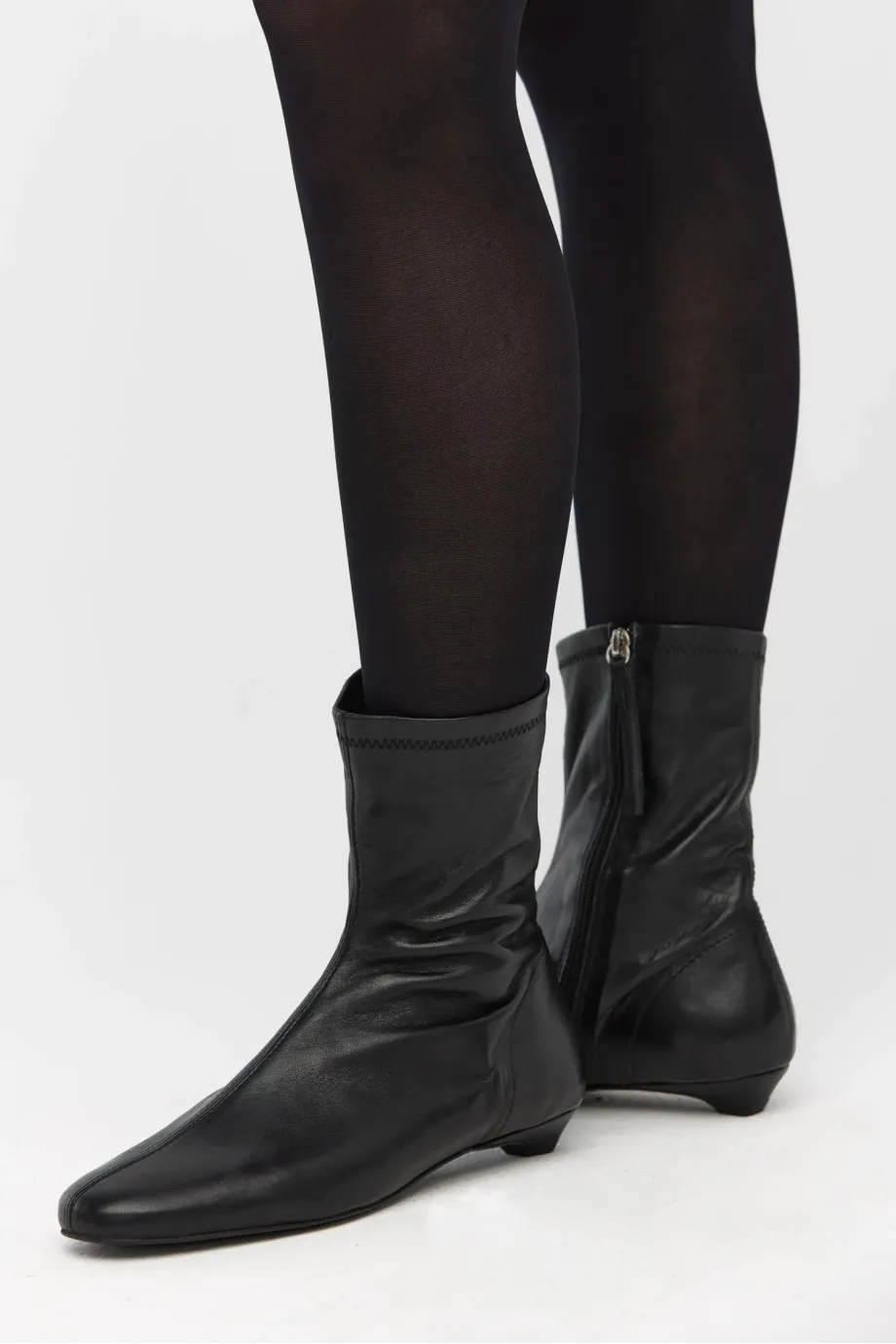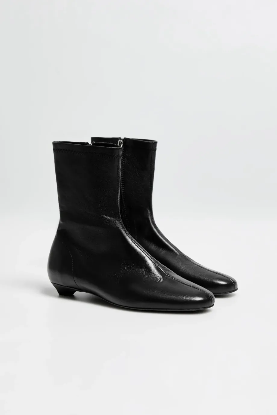 Černé botky z velmi měkké, přírodní kůže, ručně vyráběné v polské manufaktuře. Klasický model s jednoduchým svrškem a kulatou špičkou, zapínané na zip, na nízkém podpatku typu kitten heel. Minimalistická forma.