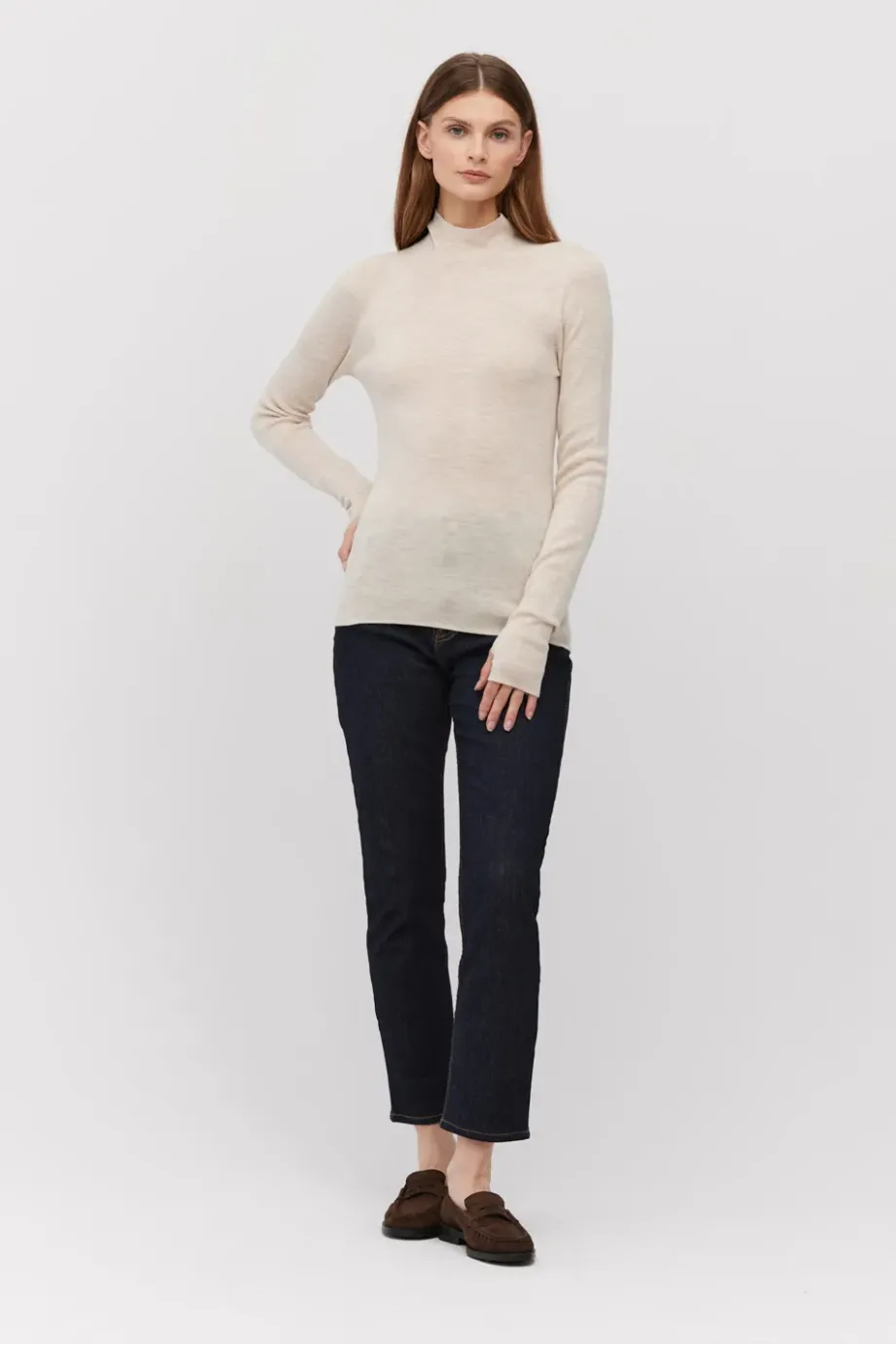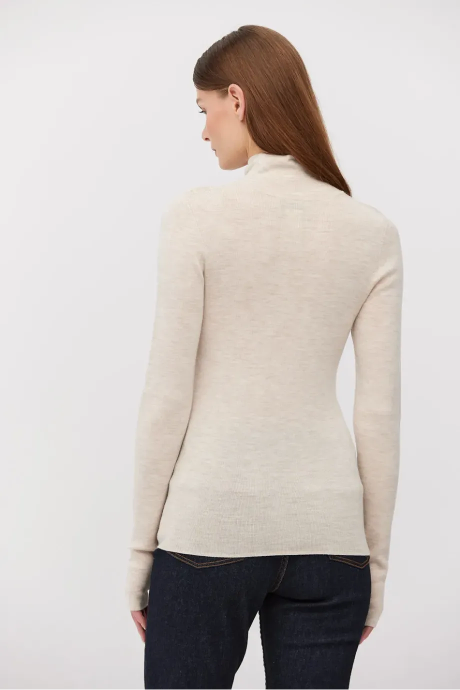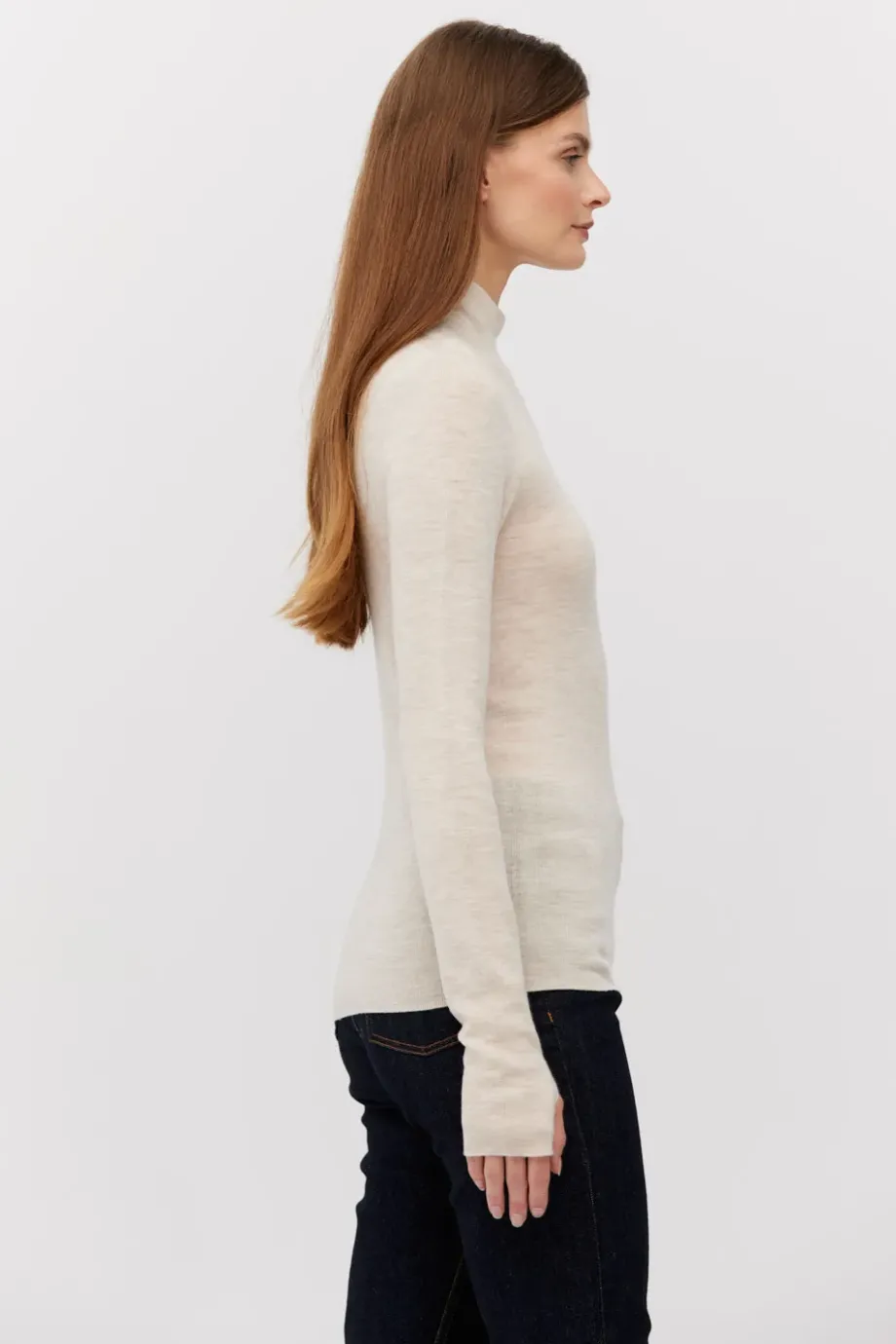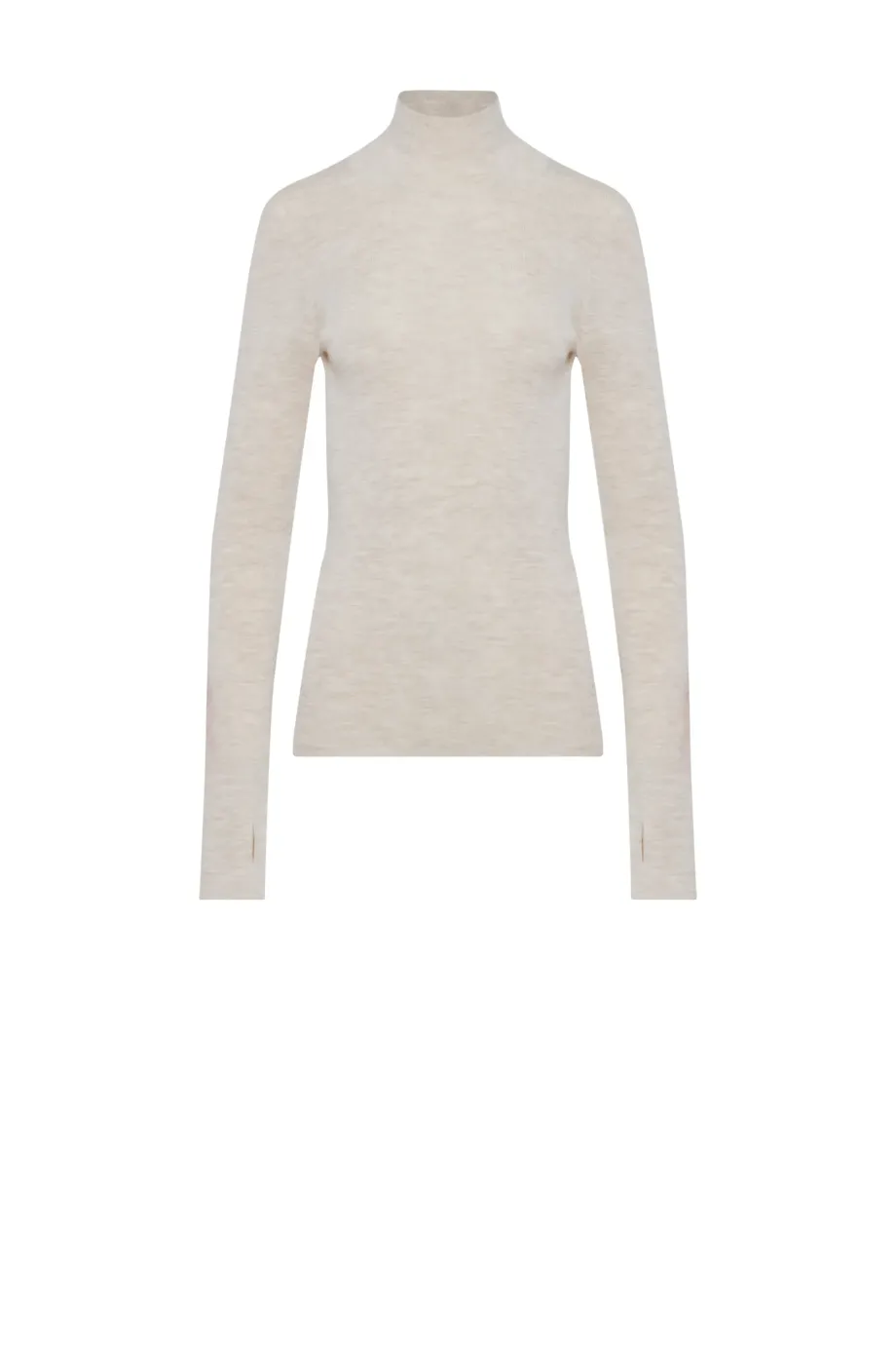 Polo rolák z merino v barvě studené béžové, s dlouhým rukávem a přiléhavým střihem. Vyrobeno v velmi jemném úpletu cable knit na stroji s jemností 18 GG.