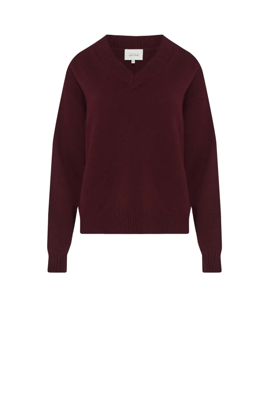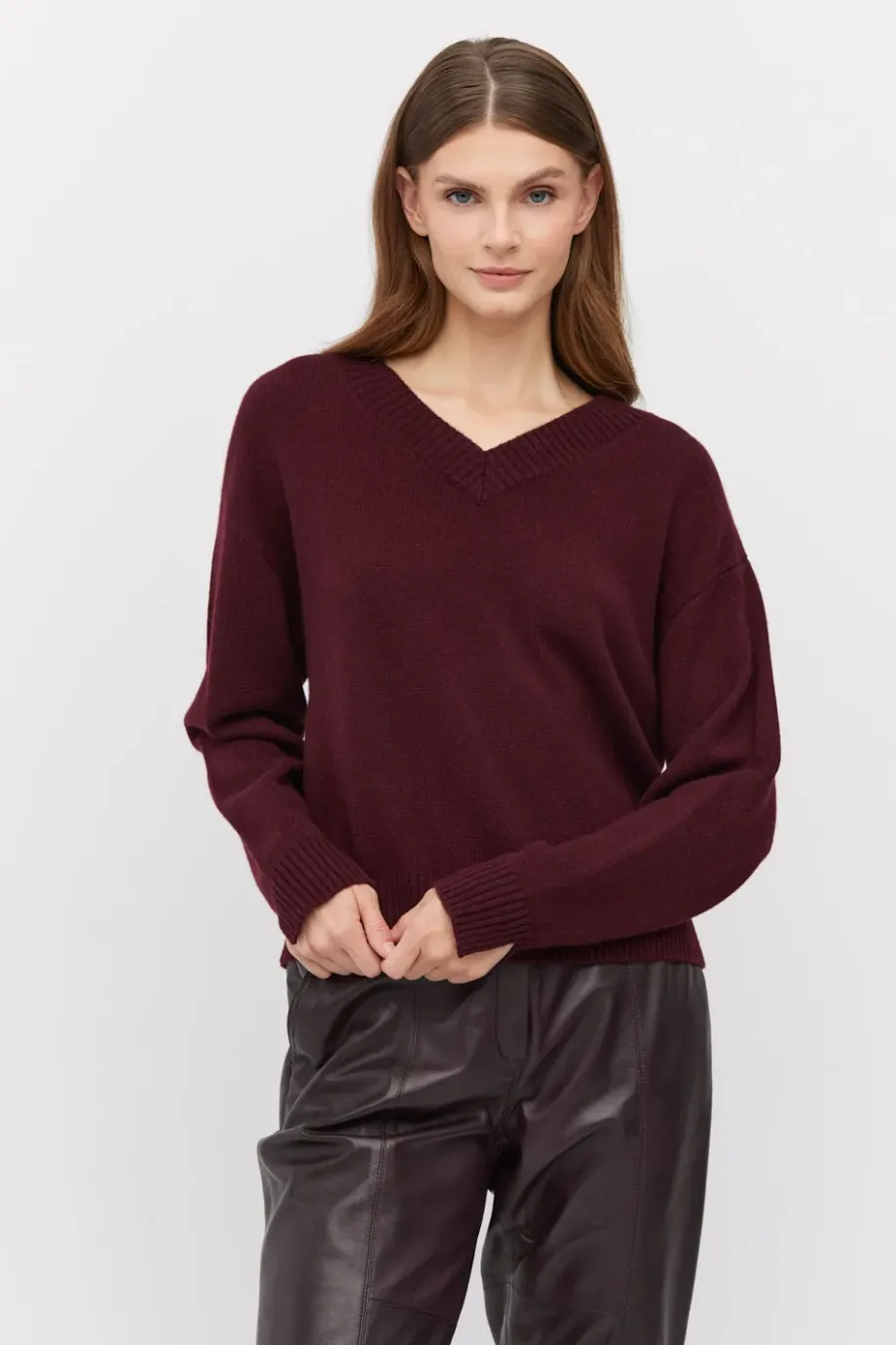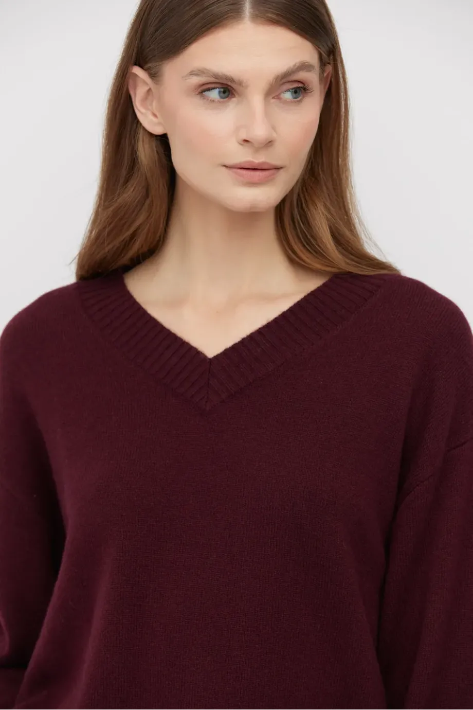 Svetr s kašmírem a merino vlnou, volného střihu a s výstřihem do V. Vyrobený pletením typu cable knit na stroji 7 GG. Dlouhý rukáv, dostupný ve dvou barvách.