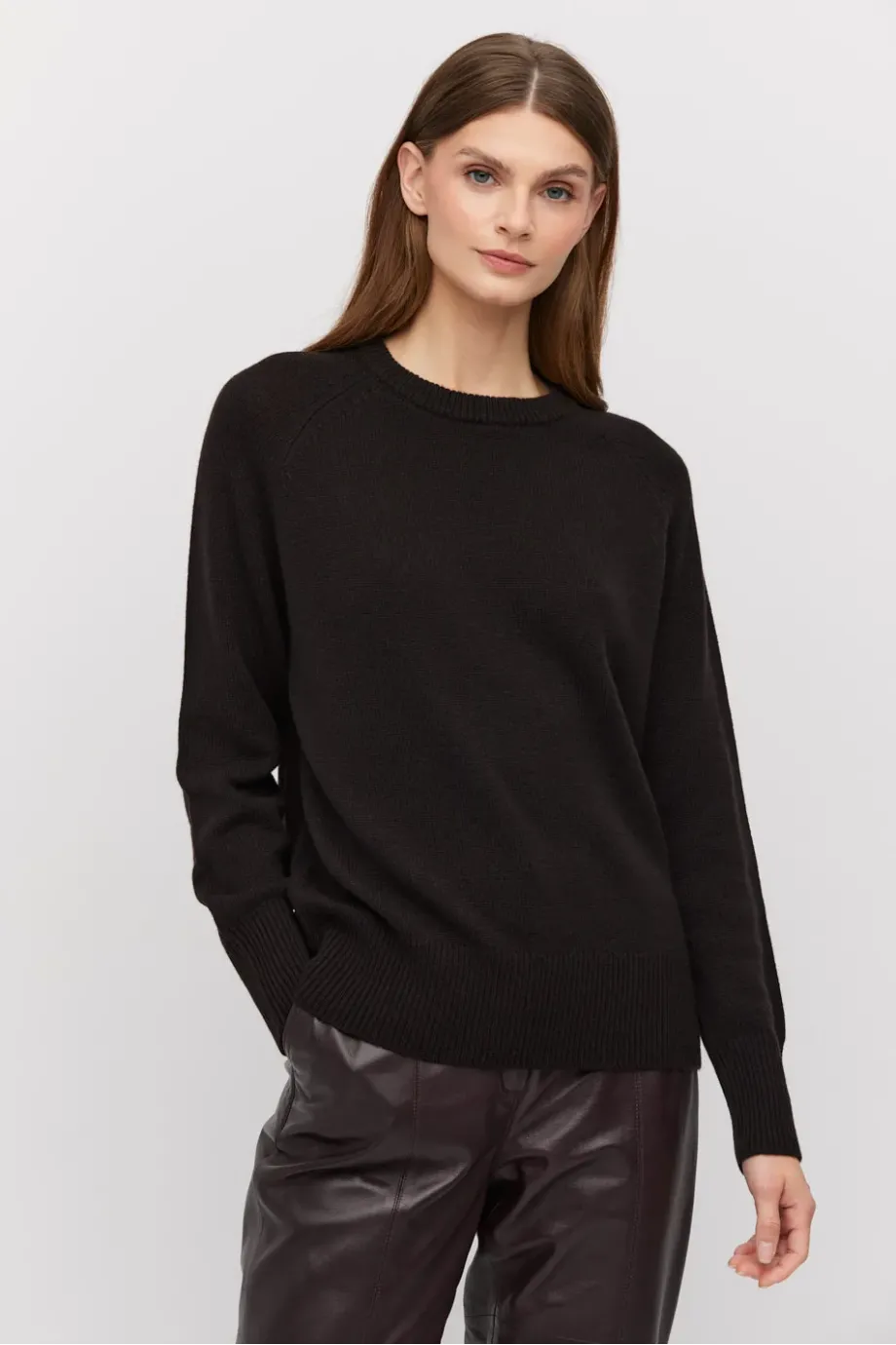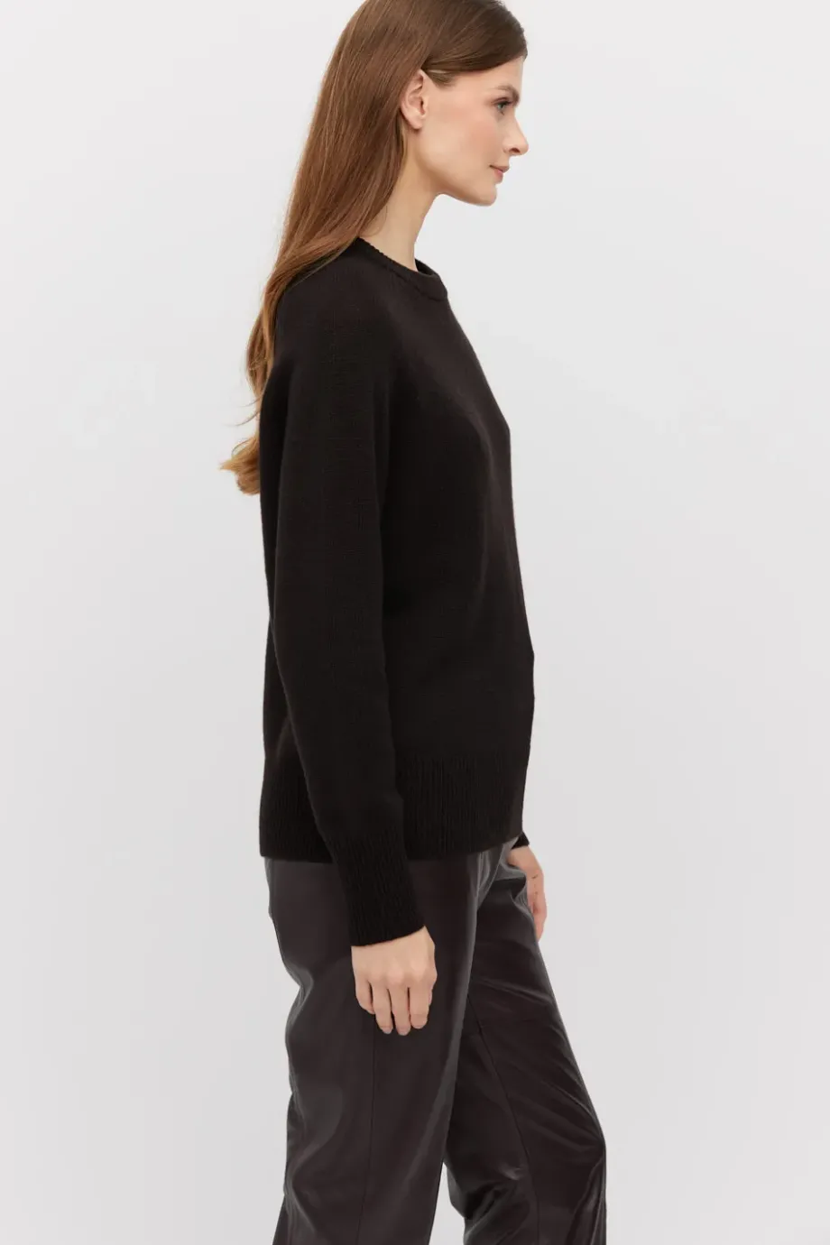 Svetr z mixu merino vlny a kašmíru, jednoduchého střihu a volného střihu. Vyrobeno v úpletu single jersey, s kulatým výstřihem a dlouhými rukávy. Barva hnědá.
