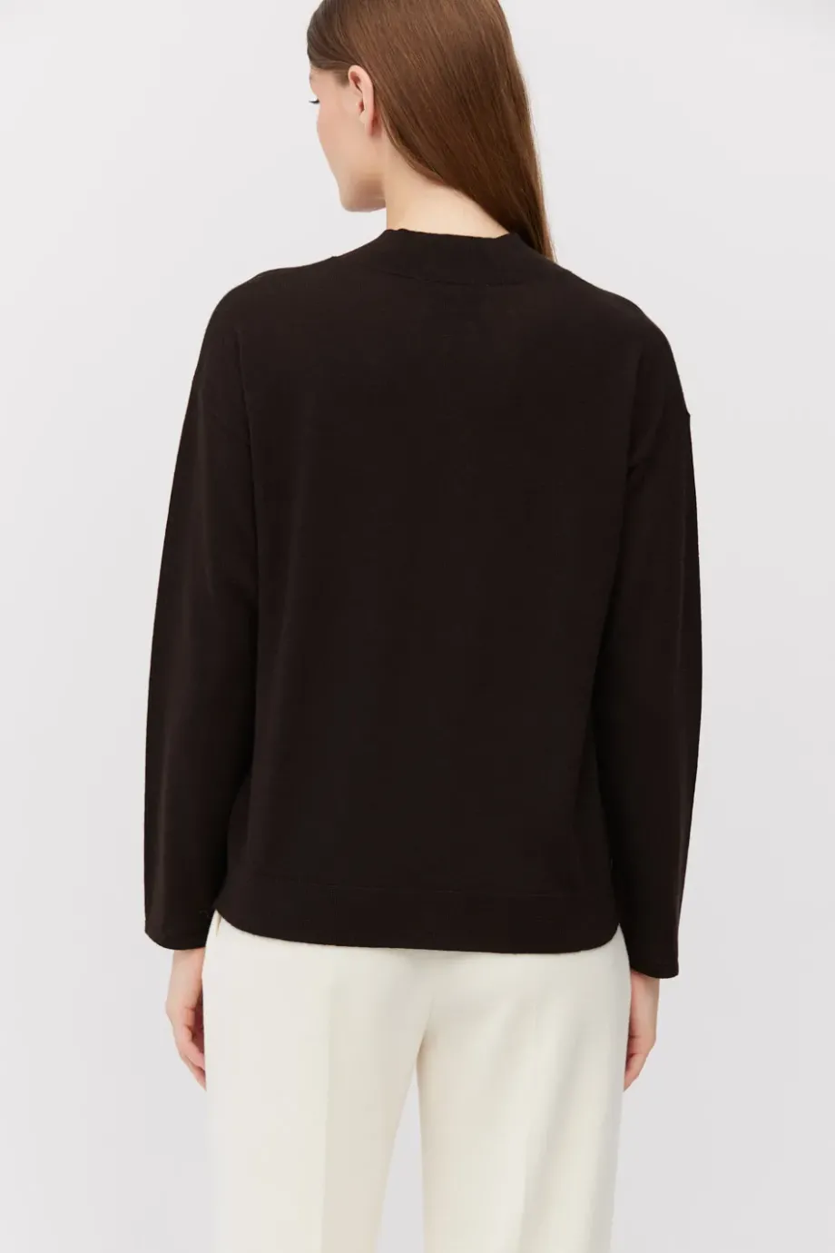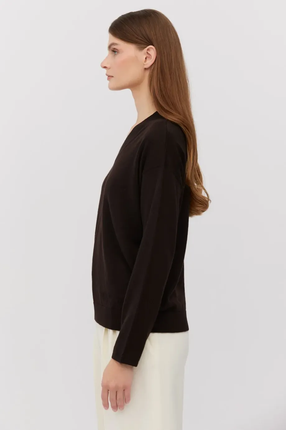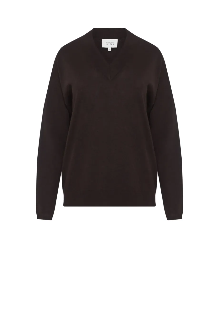 Halenka z merino v hnědé barvě. Výstřih do V, jemný úplet single jersey, vyrobeno na stroji 16 GG. Dlouhý rukáv.
