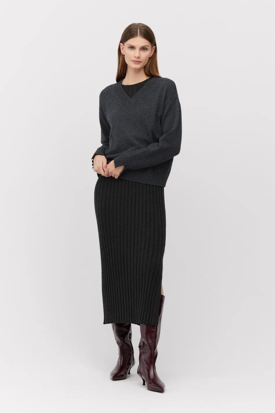 Tmavě šedé, přiléhavé pletené šaty s příměsí merino vlny, vertikální pruh - rib 12 gg. Dlouhý rukáv, kulatý výstřih a rozparek na boku. Midi délka.