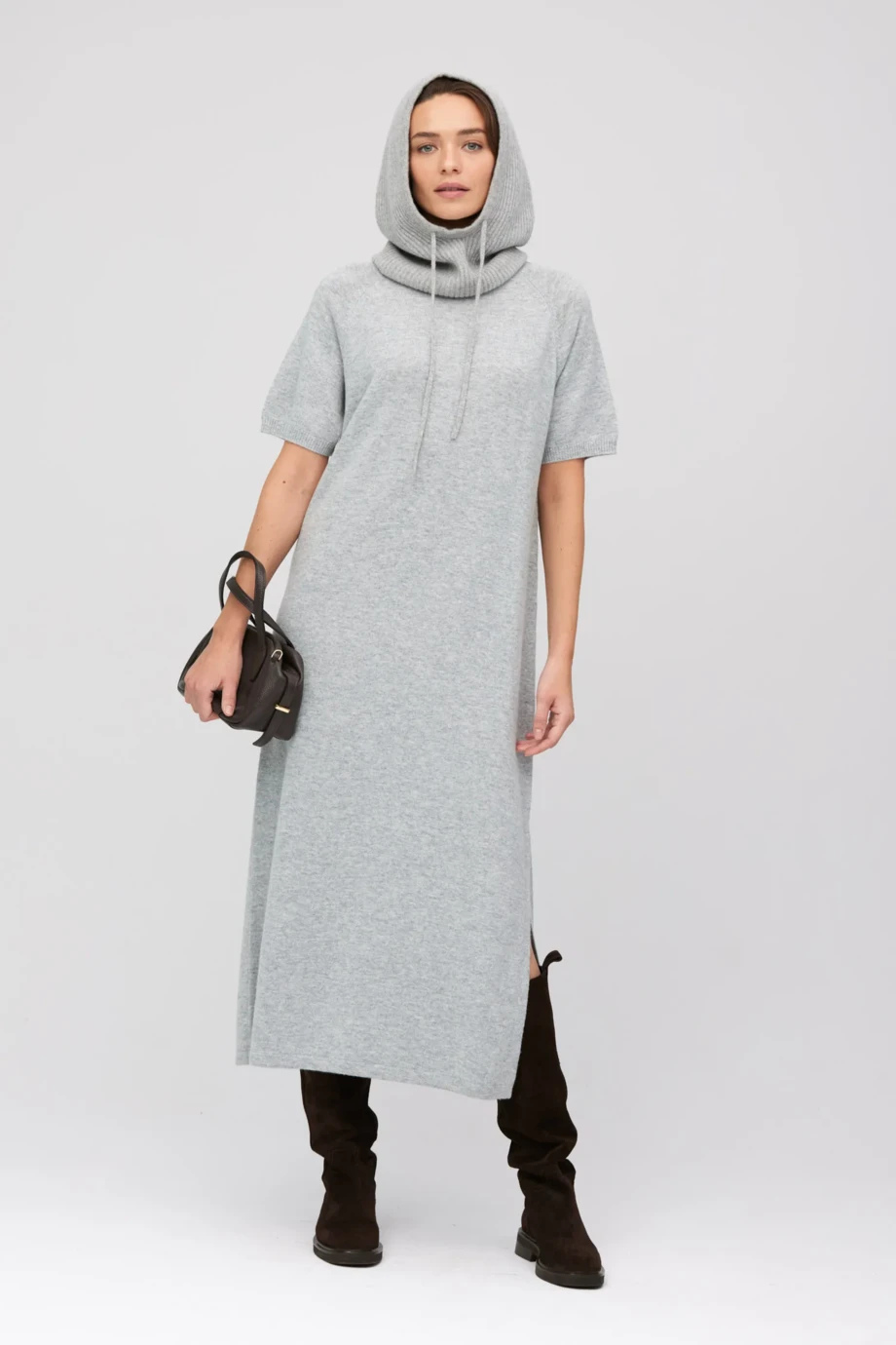 Midi šaty z merino vlny a kašmíru. Jednoduchý, volný střih s kulatým výstřihem a dlouhým rukávem. Pletenina v žerzejovém úpletu, vyrobená na stroji s jemností 12 GG. Barva světle šedá.