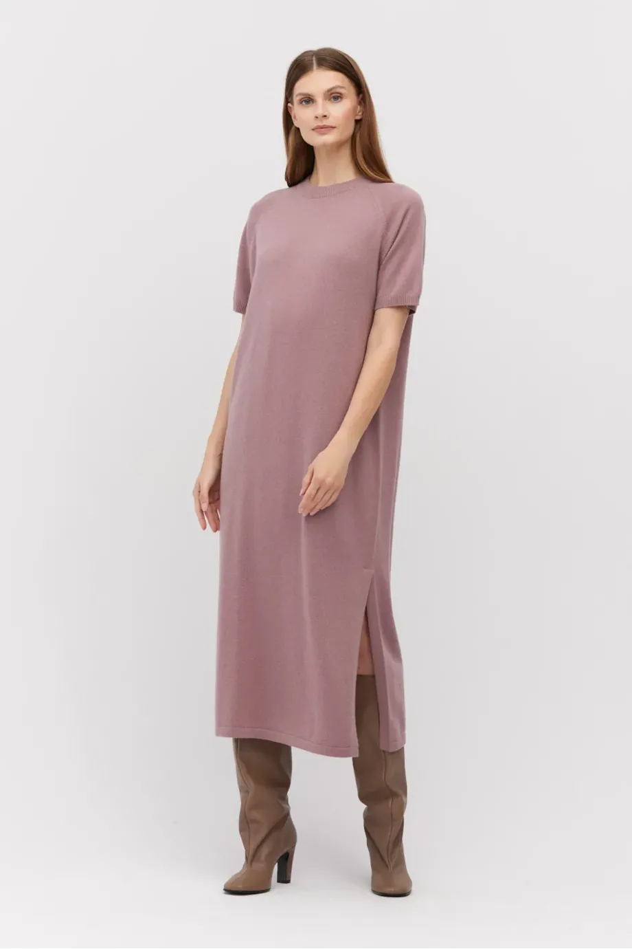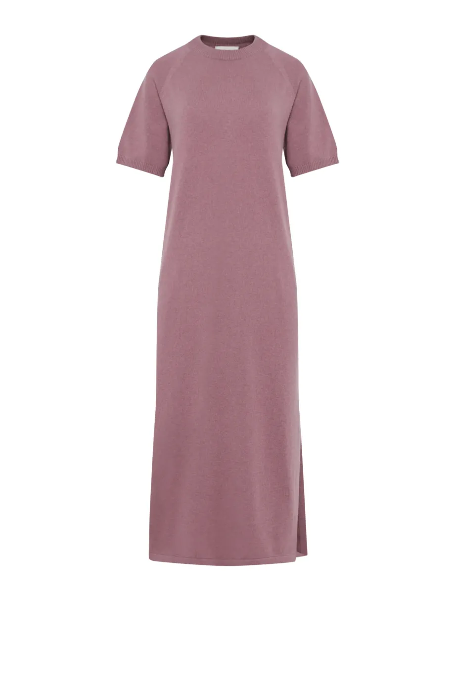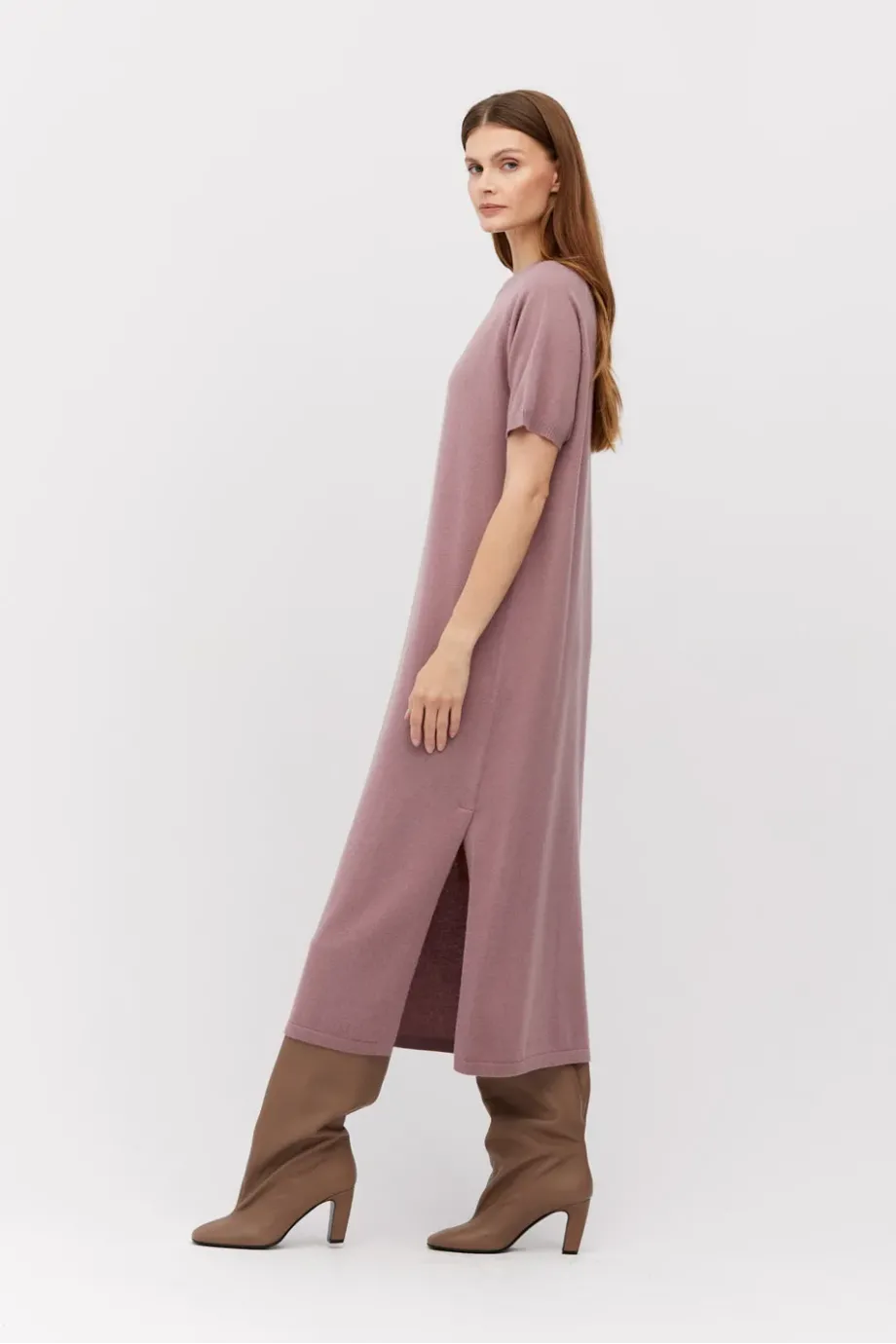 Midi šaty z merinovlny a kašmíru. Jednoduchý, volný střih s kulatým výstřihem a krátkým rukávem. Pletenina v žerzejovém úpletu, vyrobená na stroji s jemností 12 GG. Barva světle fialová.