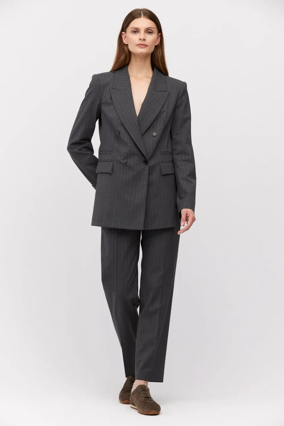 Dvouřadý pruhovaný blejzr, ušitý z jehněčí vlny v tmavě šedé barvě. Jemně přiléhavý střih, dlouhý rukáv, zapínání na knoflík z perleťové mušle a vnitřní knoflík z corozo ořechu. Kapsy. Model na podšívce, s ozdobným prošíváním a lemováním uvnitř.