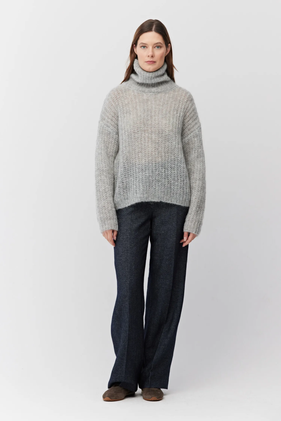 Šedý svetr s delšími vlasy, z směsi vlny a jemného 'kid' mohéru. Rolák, dlouhý rukáv, volný střih. Pletenina s volným vzorem half cardigan vyrobená na stroji s uiglením 3 GG.