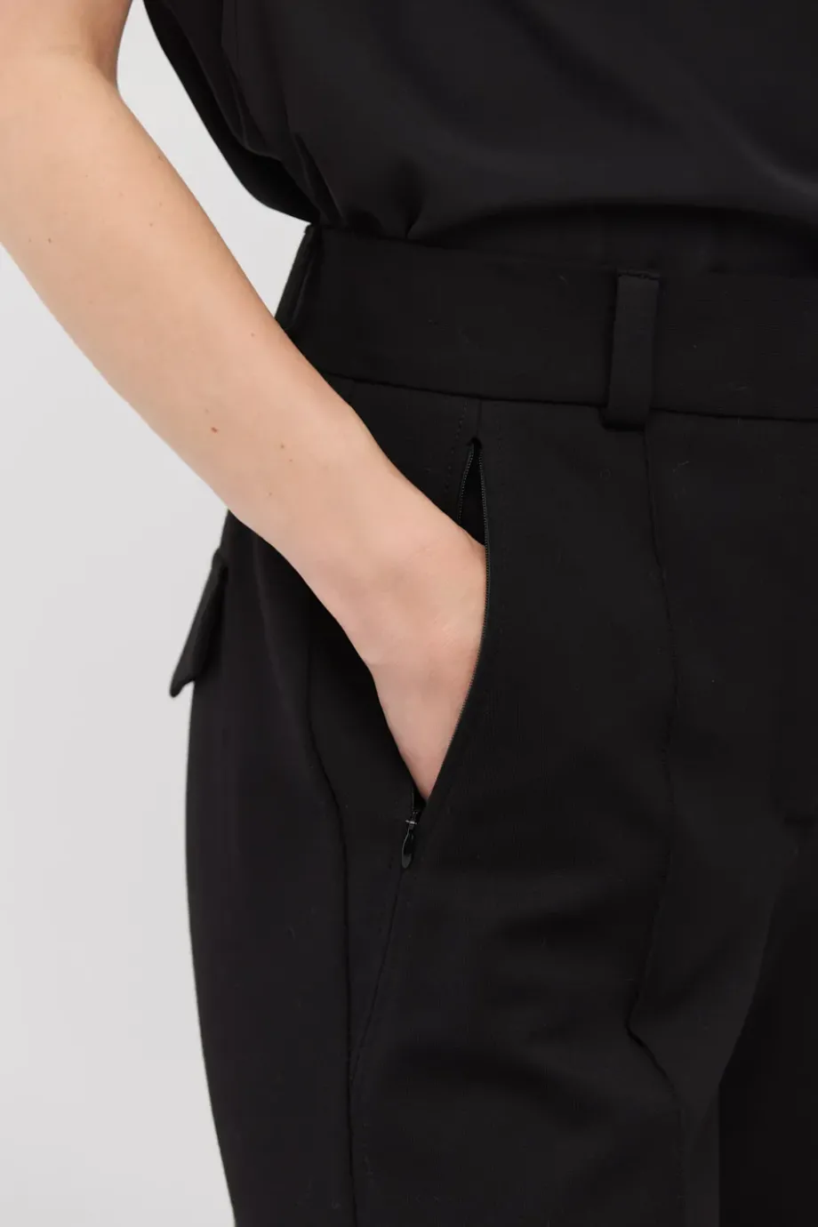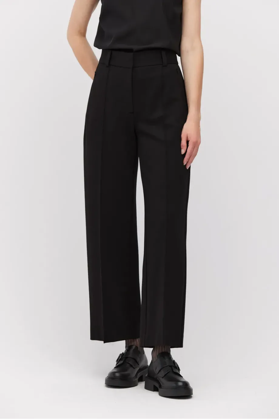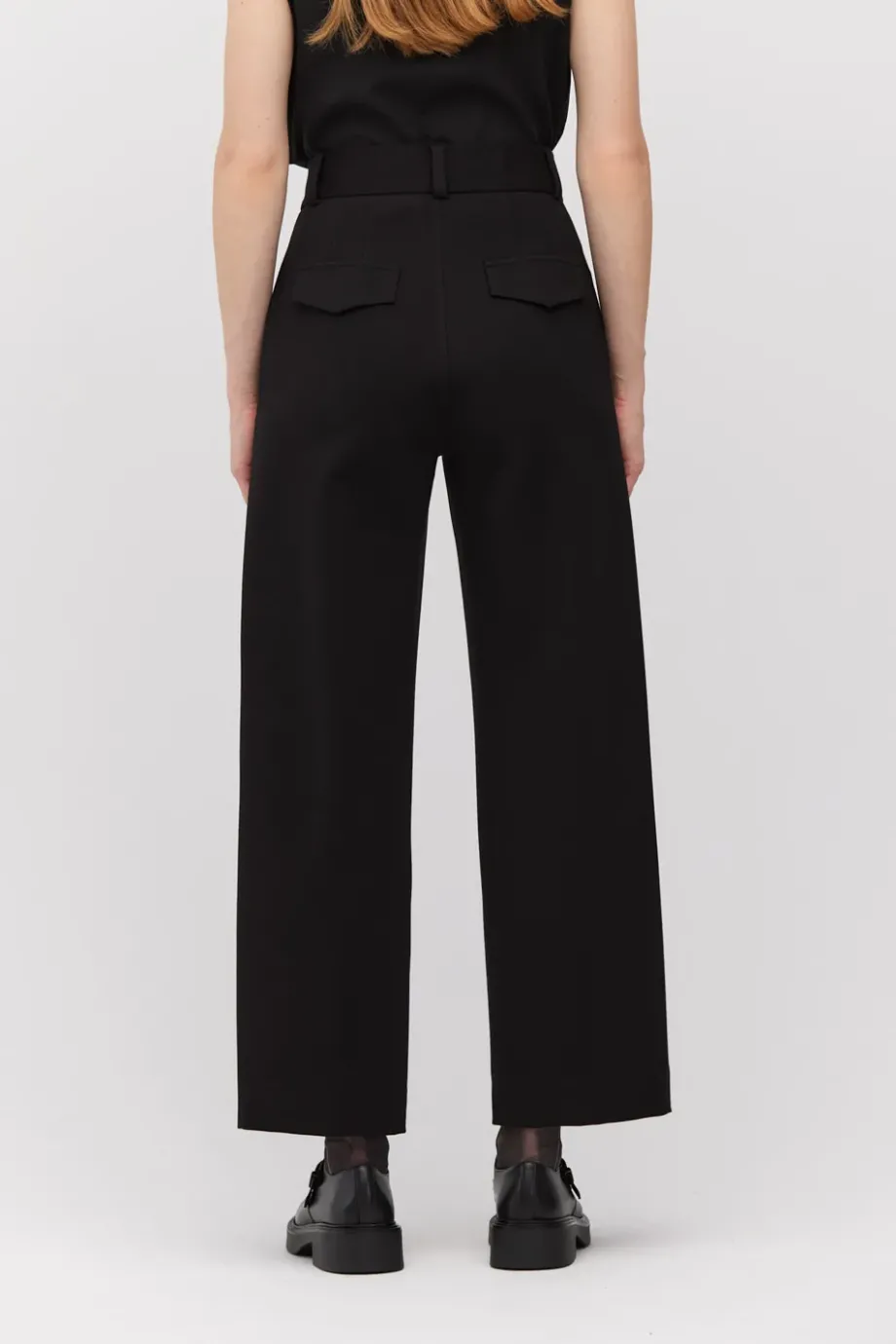 Černé kalhoty s vyšším pasem. Široké nohavice s záhybem. Zapínací boční kapsy, ozdobné vnitřní zakončení. Poutka. Zapínání na skrytý zip, háček a vnitřní knoflík z přírodního ořechu corozo.