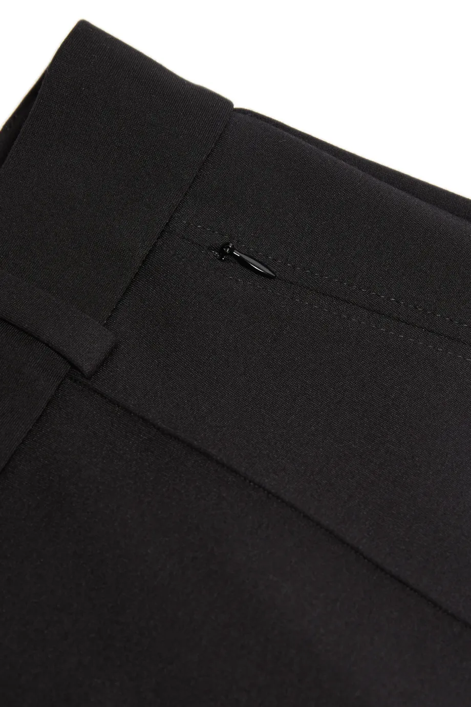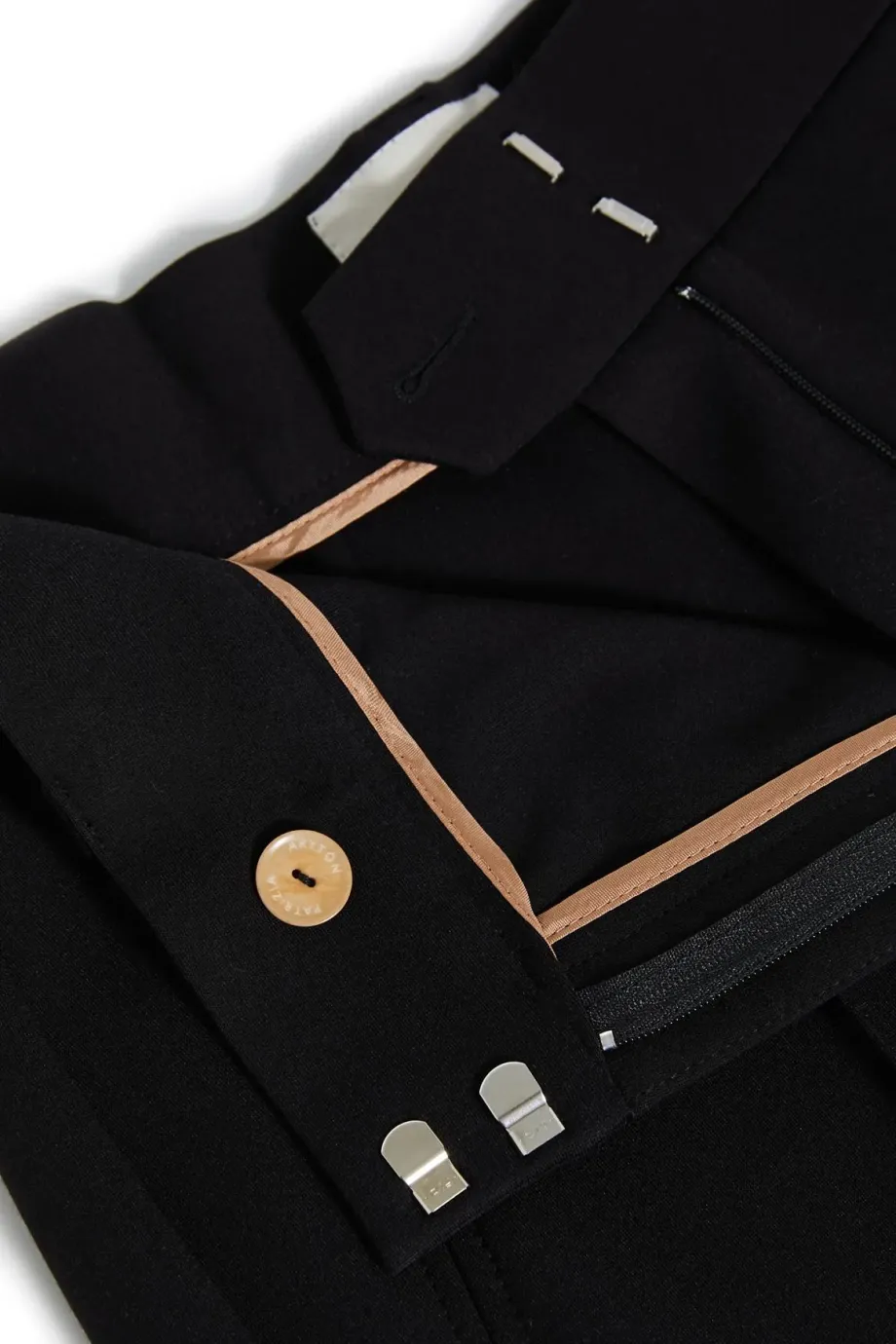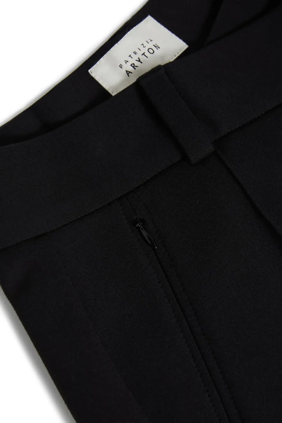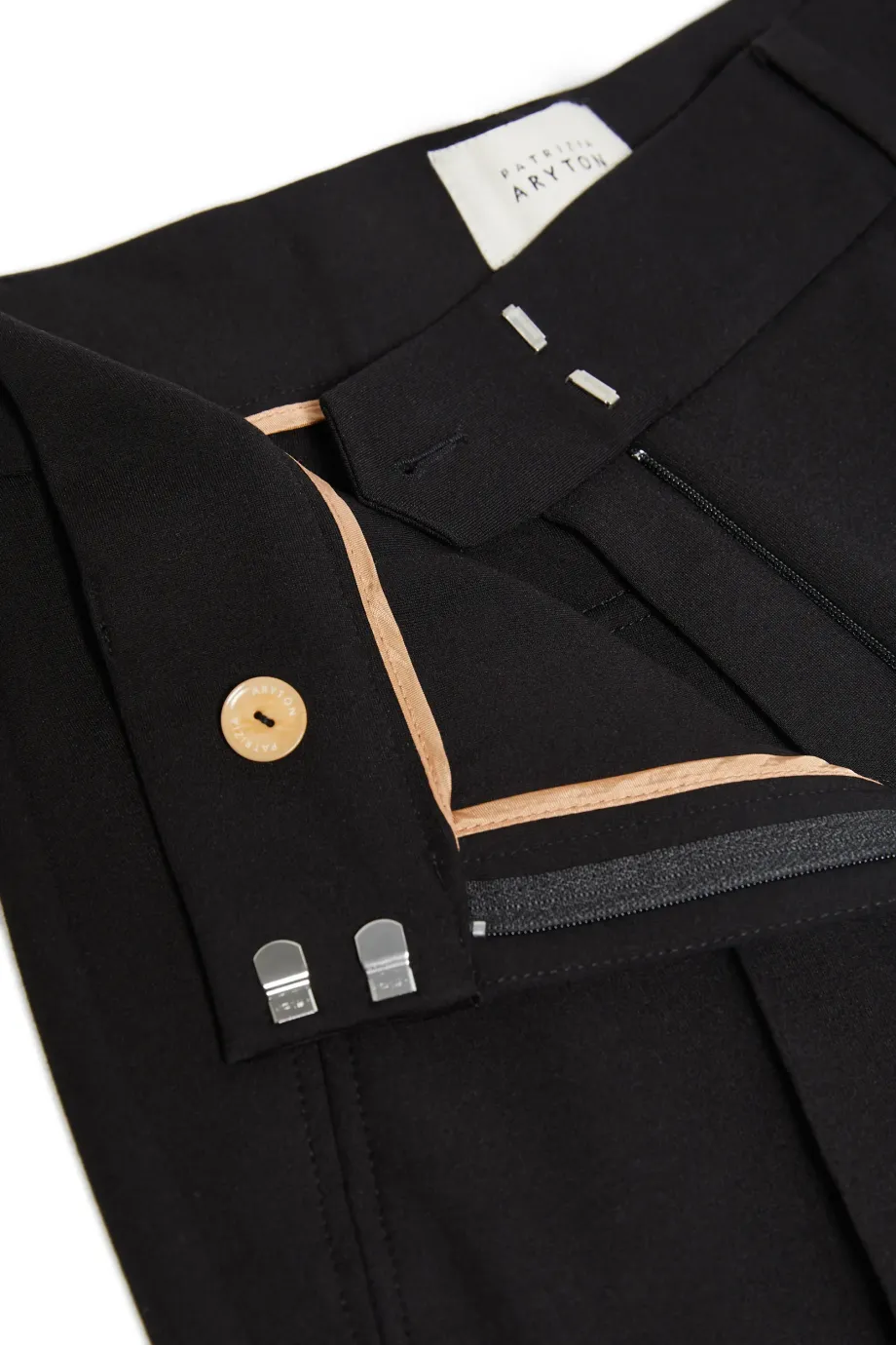 Černé kalhoty s vyšším pasem. Široké nohavice s záhybem. Zapínací boční kapsy, ozdobné vnitřní zakončení. Poutka. Zapínání na skrytý zip, háček a vnitřní knoflík z přírodního ořechu corozo.