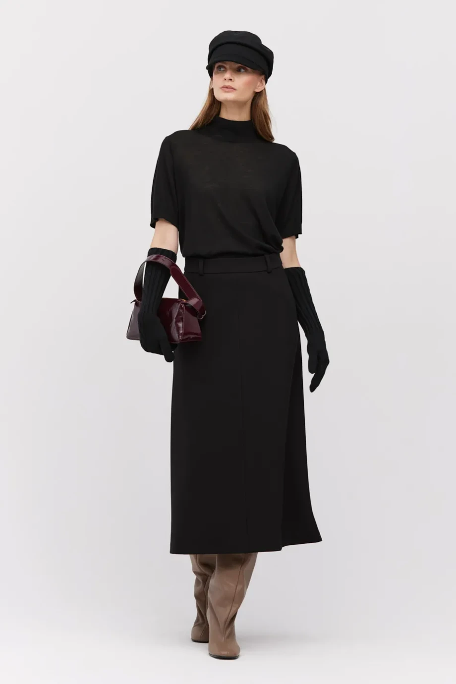 Sukně s trapezovým střihem. Kapsy a poutka, bez podšívky.