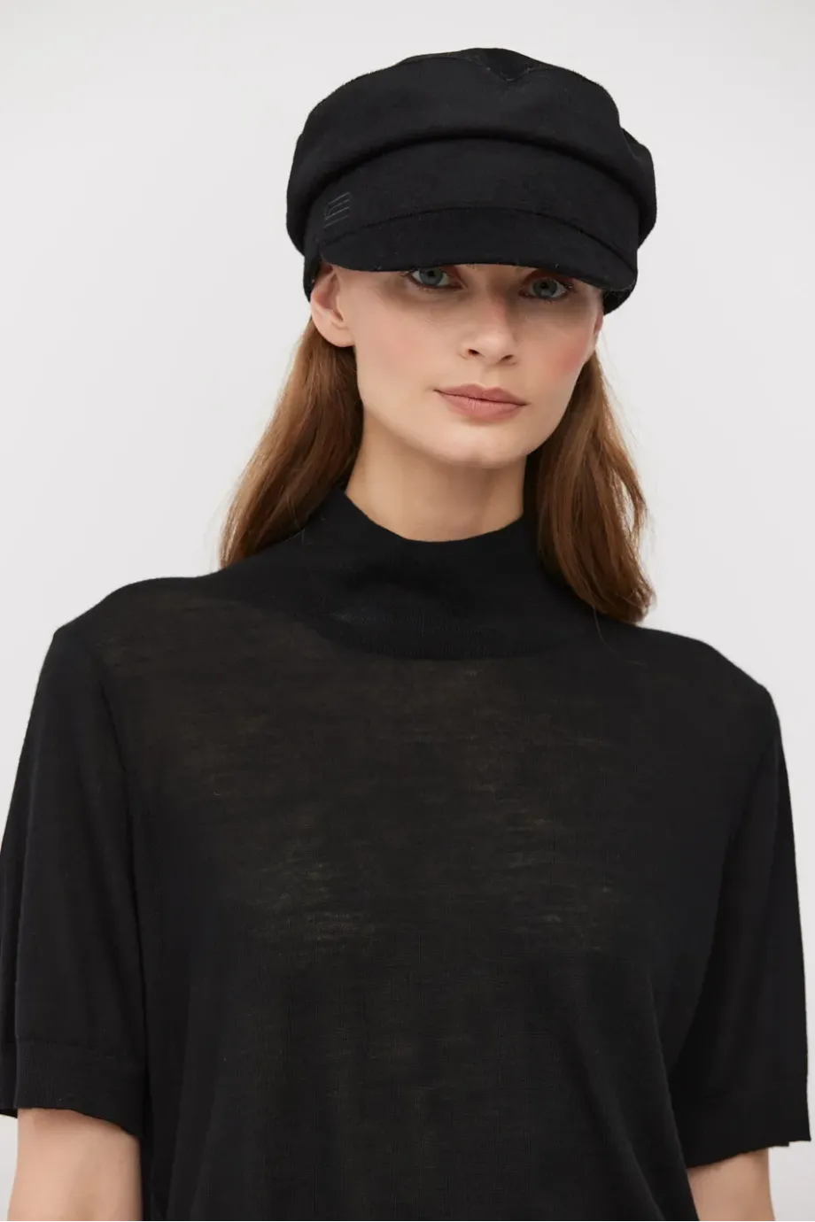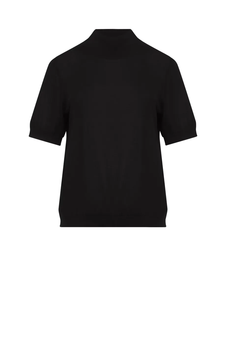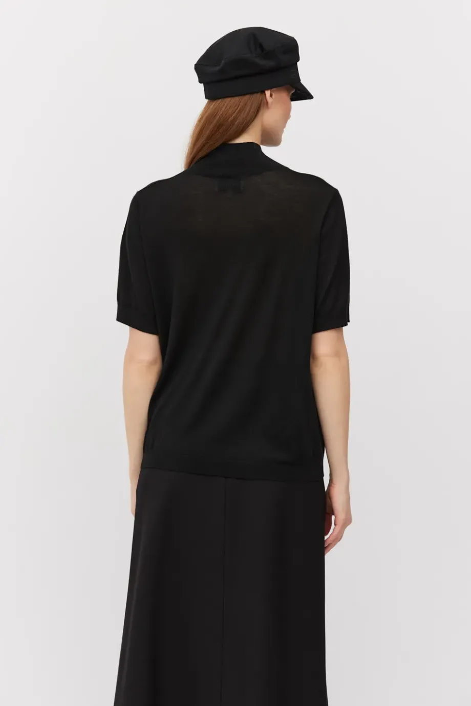 Polo z merinovlny. Jednoduchý střih s krátkým rukávem. Pletenina s jemným stehem jersey knit, vyrobená na stroji s uiglením 18 GG. Barva černá.