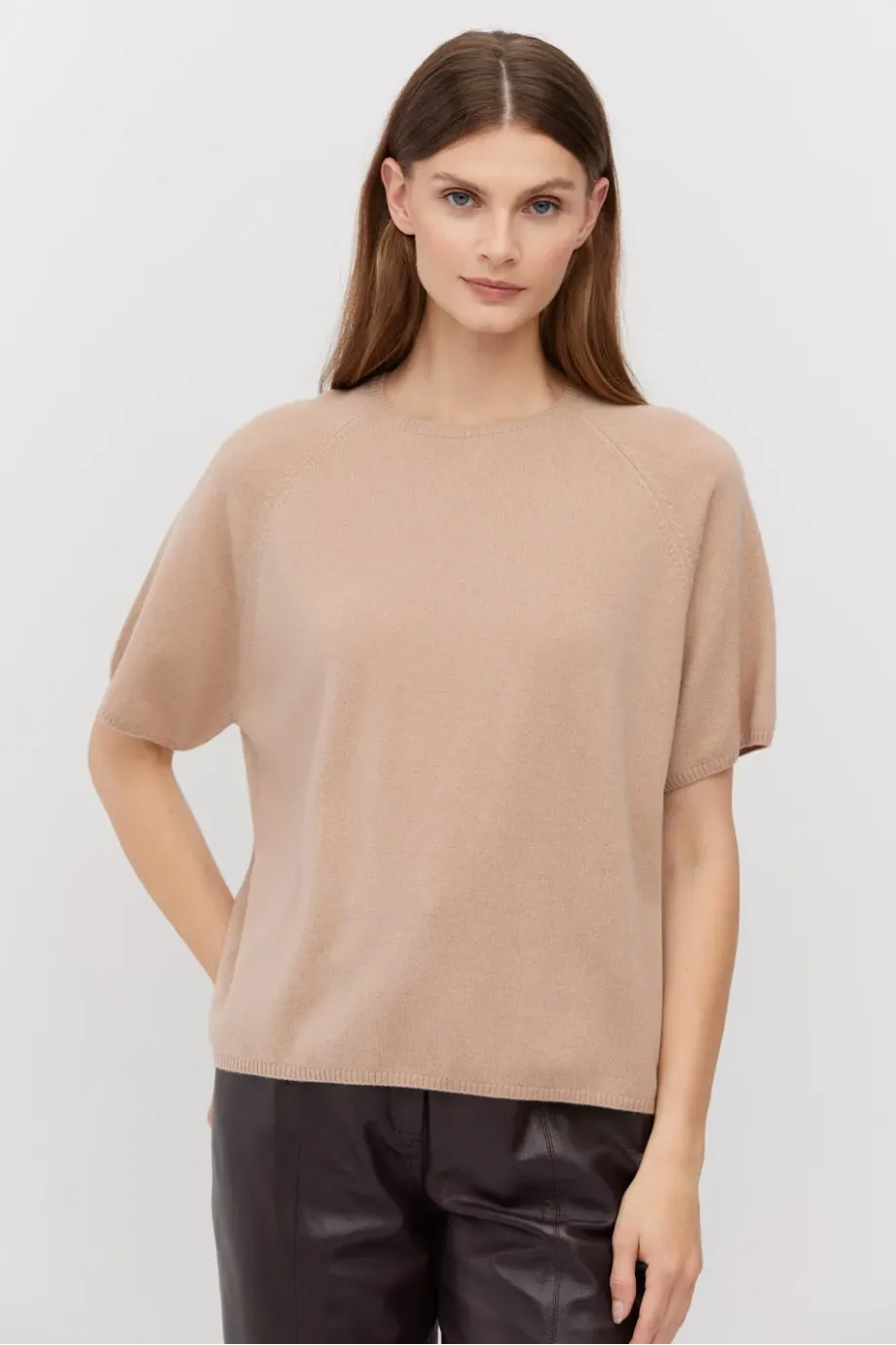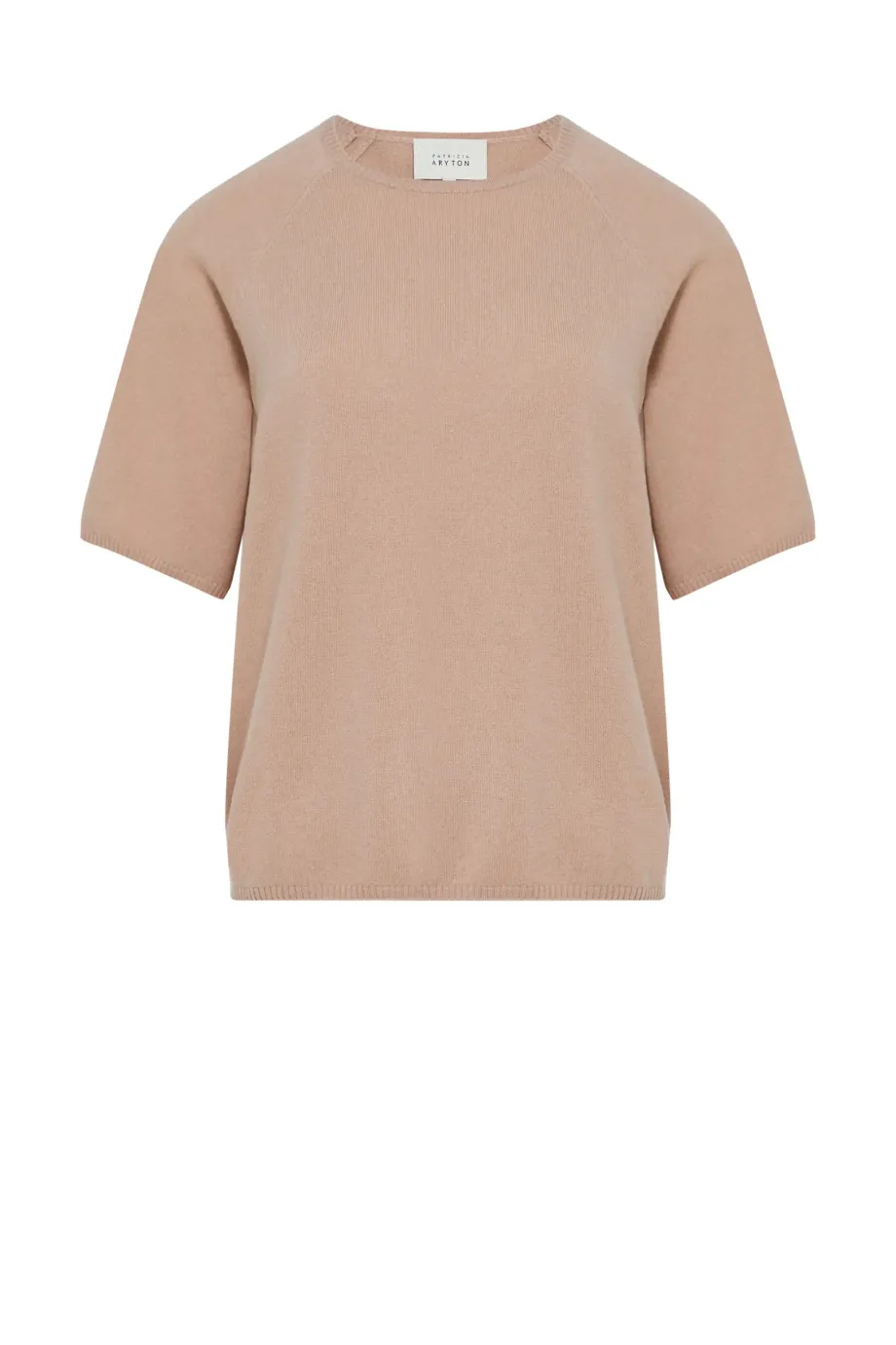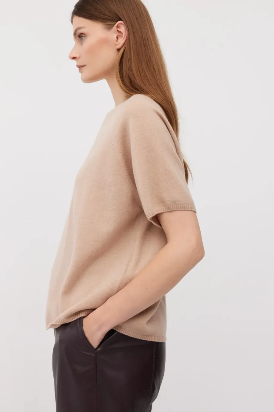 Halenka z merino vlny. Jednoduchý, volný střih s krátkým rukávem. Pletenina s úpletem jersey knit, vyrobená na stroji s 14 GG. Barva je tlumená růžová.