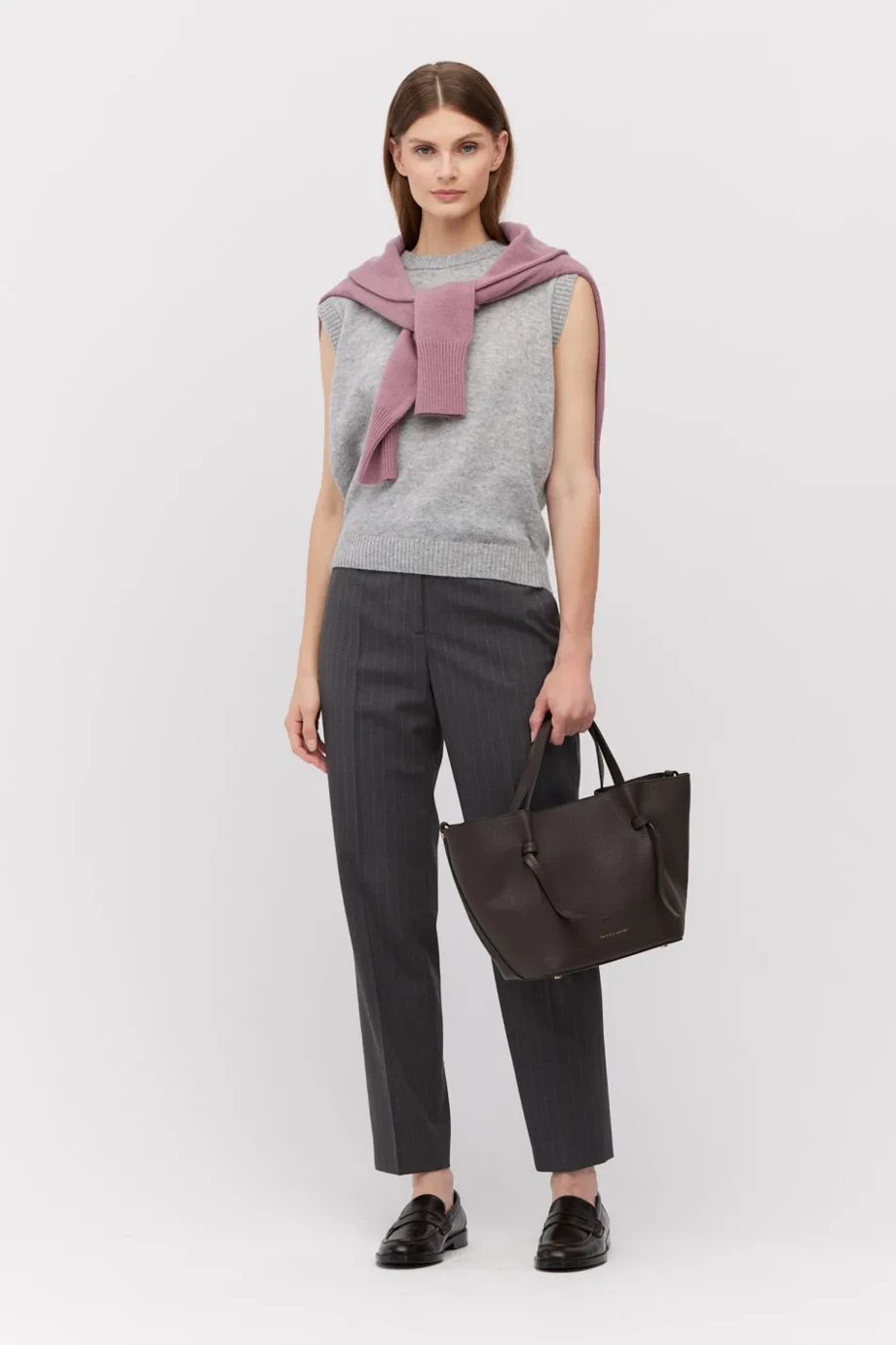 Vlněné pruhované kalhoty. Střih s vyšším pasem, nohavice mírně zúžené ke spodní části. Boční kapsy, ozdobné vnitřní detaily. Zapínání na skrytý zip, háček a vnitřní knoflík z přírodního ořechu corozo. K doplnění soupravy sako ze stejné látky.