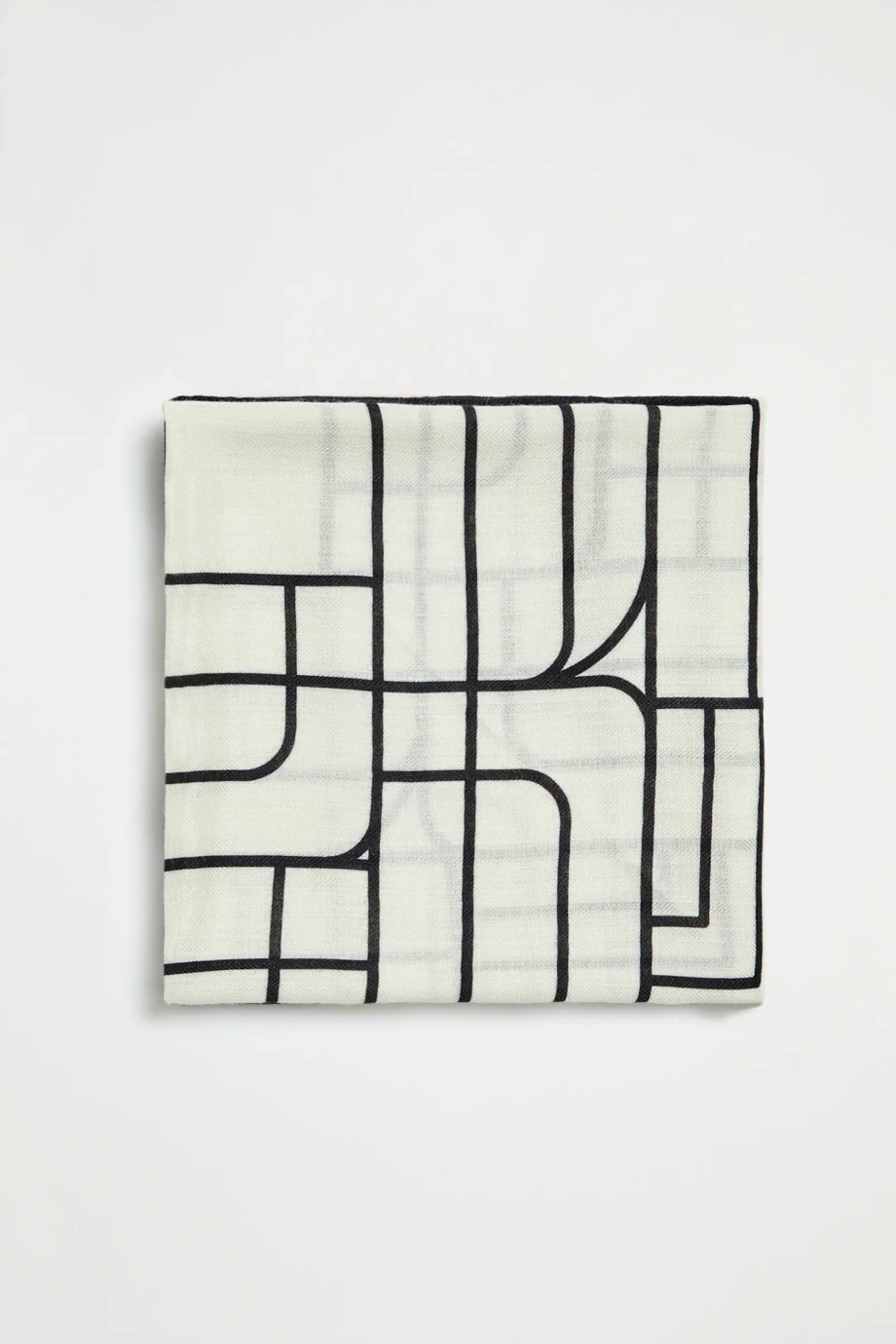 Šátek z vlny a hedvábí, v minimalistickém, geometrickém vzoru. Měkký, jemný na dotek.