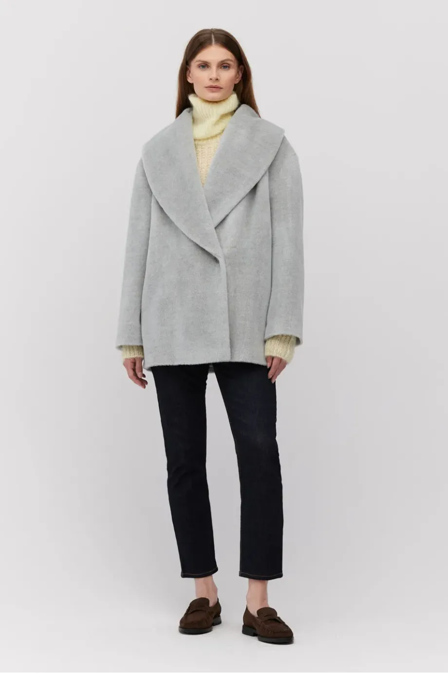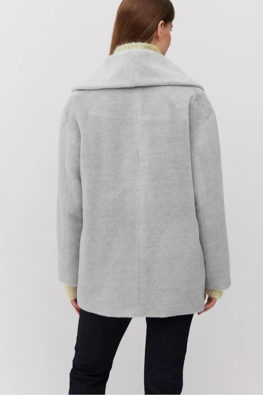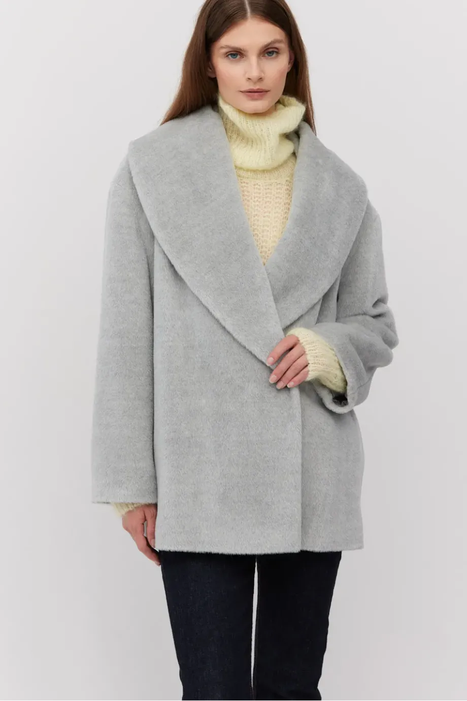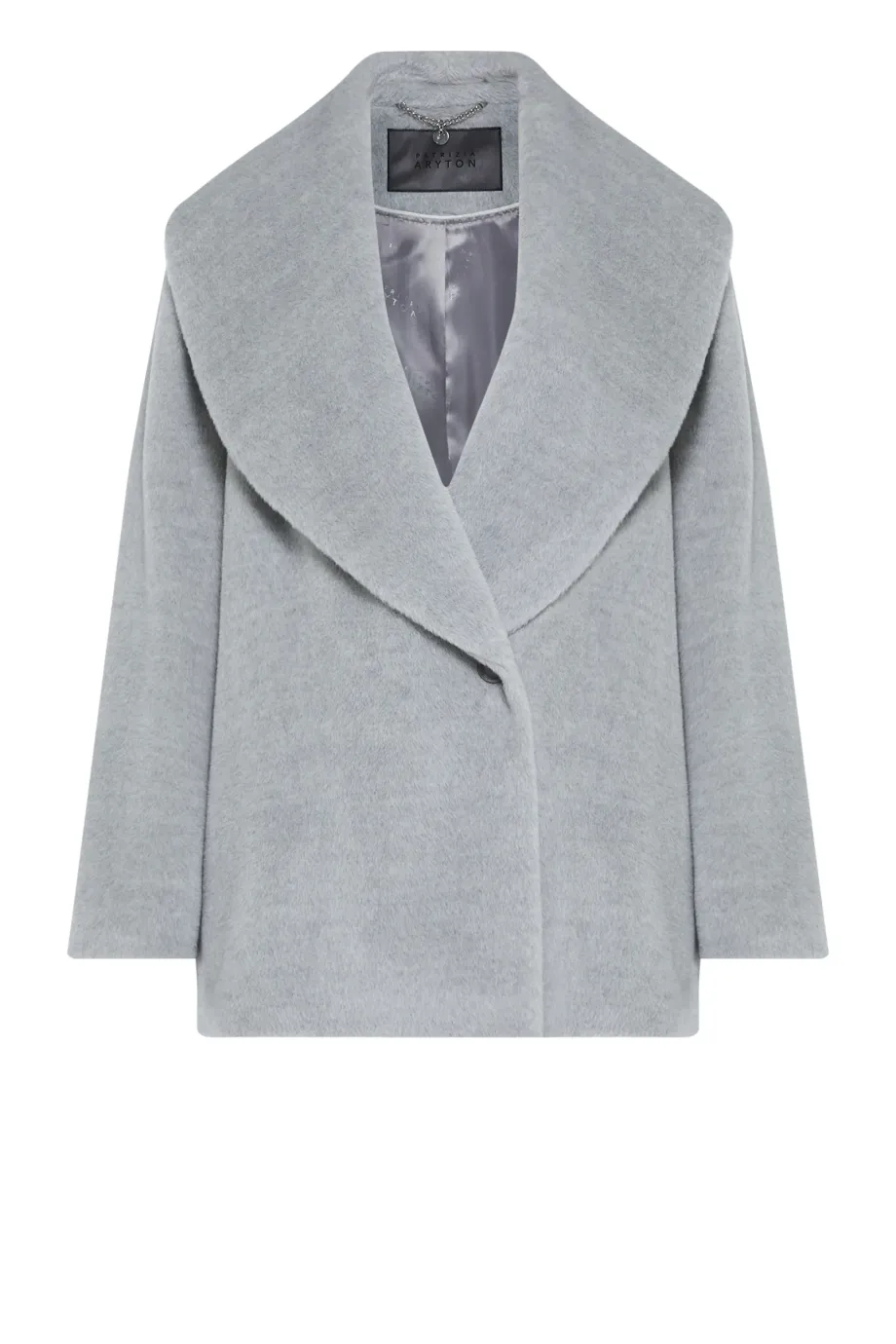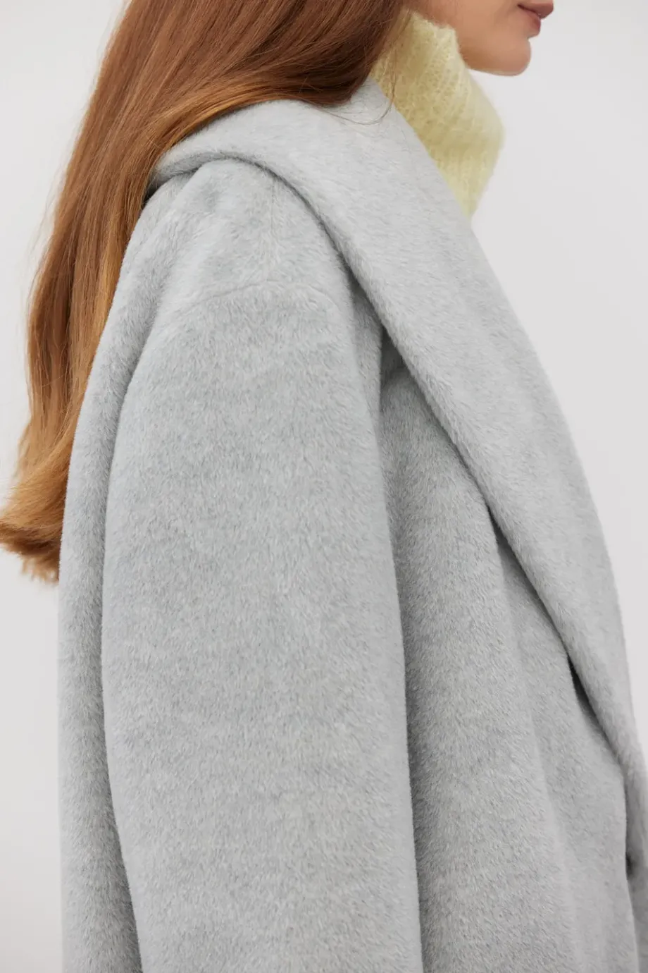 Kabát z baby suri alpaky v šedé barvě. Volný střih s šálovým límcem. Zapínání na přírodní knoflíky. Model na podšívce se ozdobným lemováním.