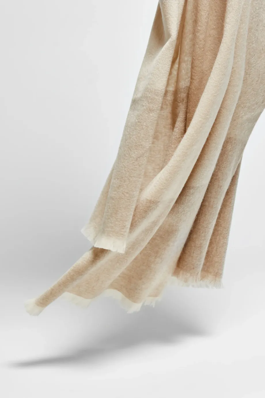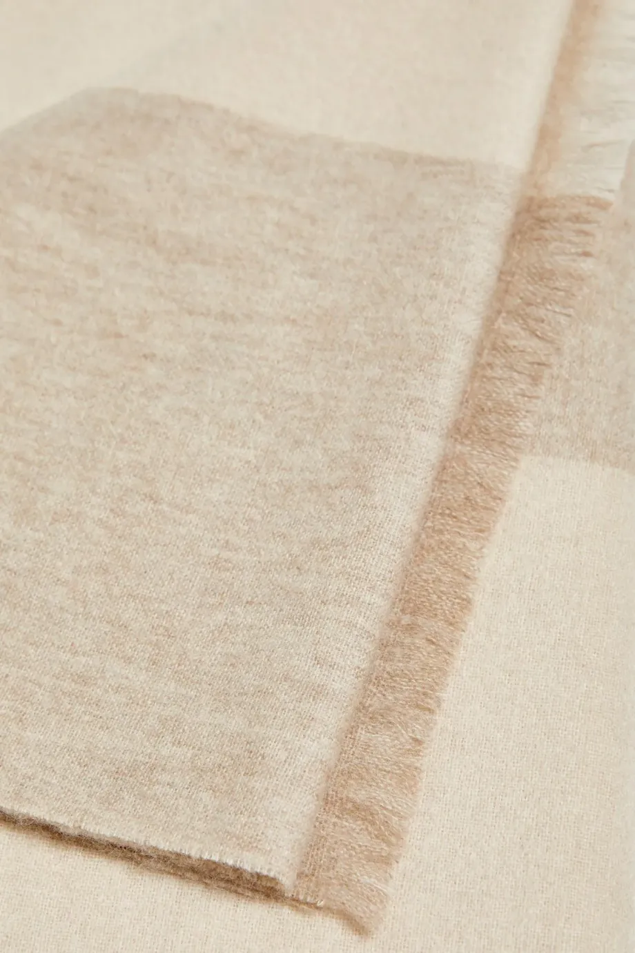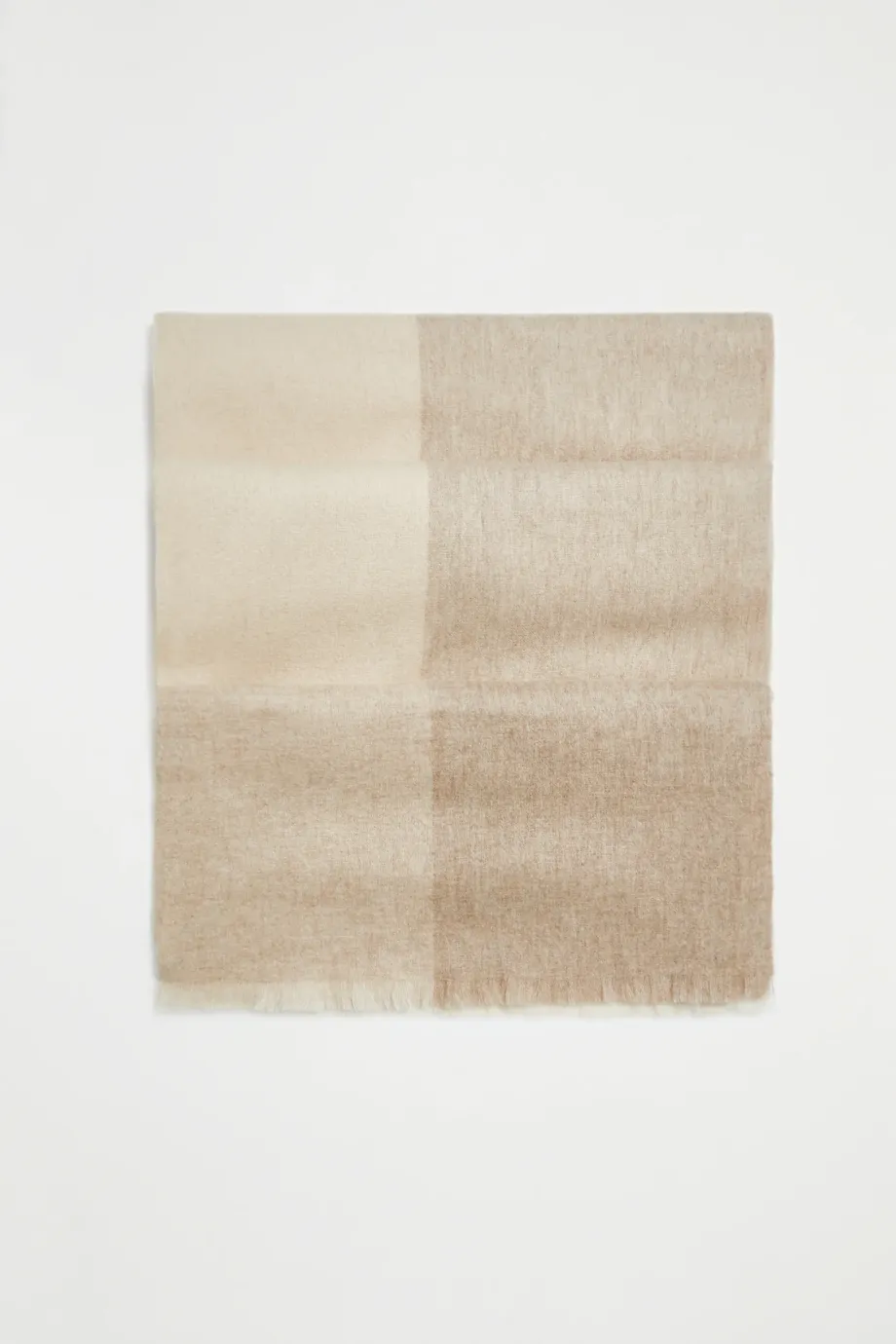 Šál vyrobený z vlny. Třásně. Měkký a příjemný na dotek.