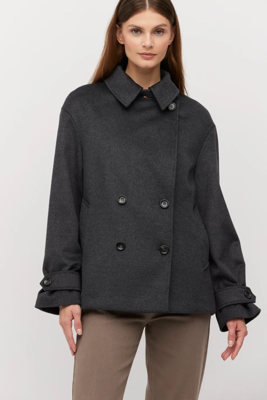 Tmavě šedá kabát z vlny volnějšího střihu. Dvouřadý, zapínaný pod krkem. Model s podšívkou, mírně spadlými rameny, kontrafaldou vzadu a epolety na rukávech.