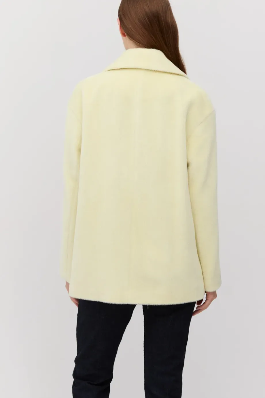 Bunda s baby suri alpakou v pastelově žluté barvě. Volný střih se spadlým rukávem. Jednořadé zapínání na knoflík z ořechu corozo. Model s podšívkou a ozdobným pip