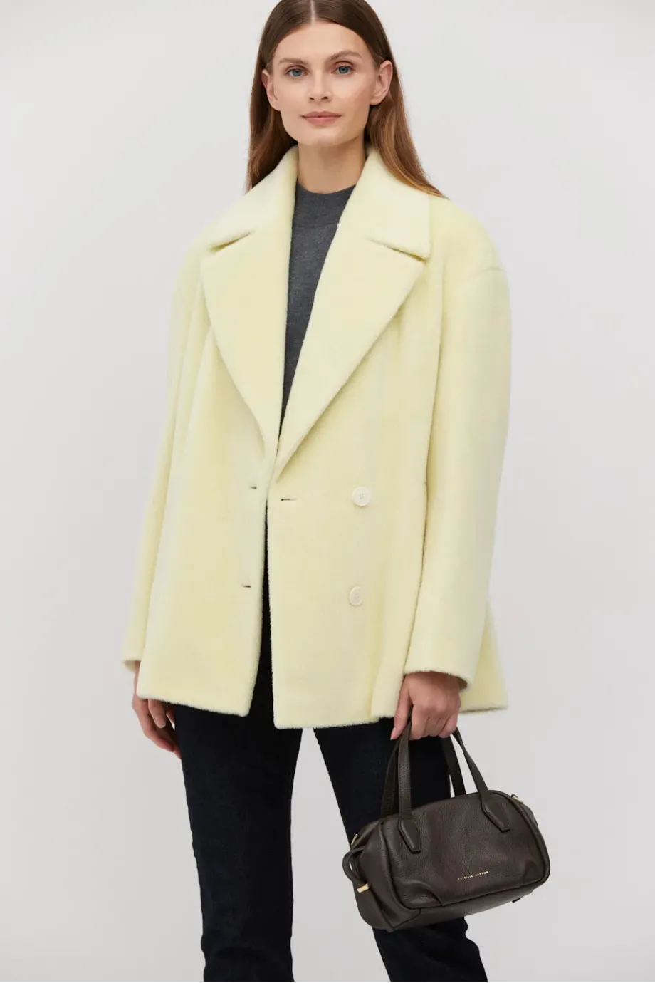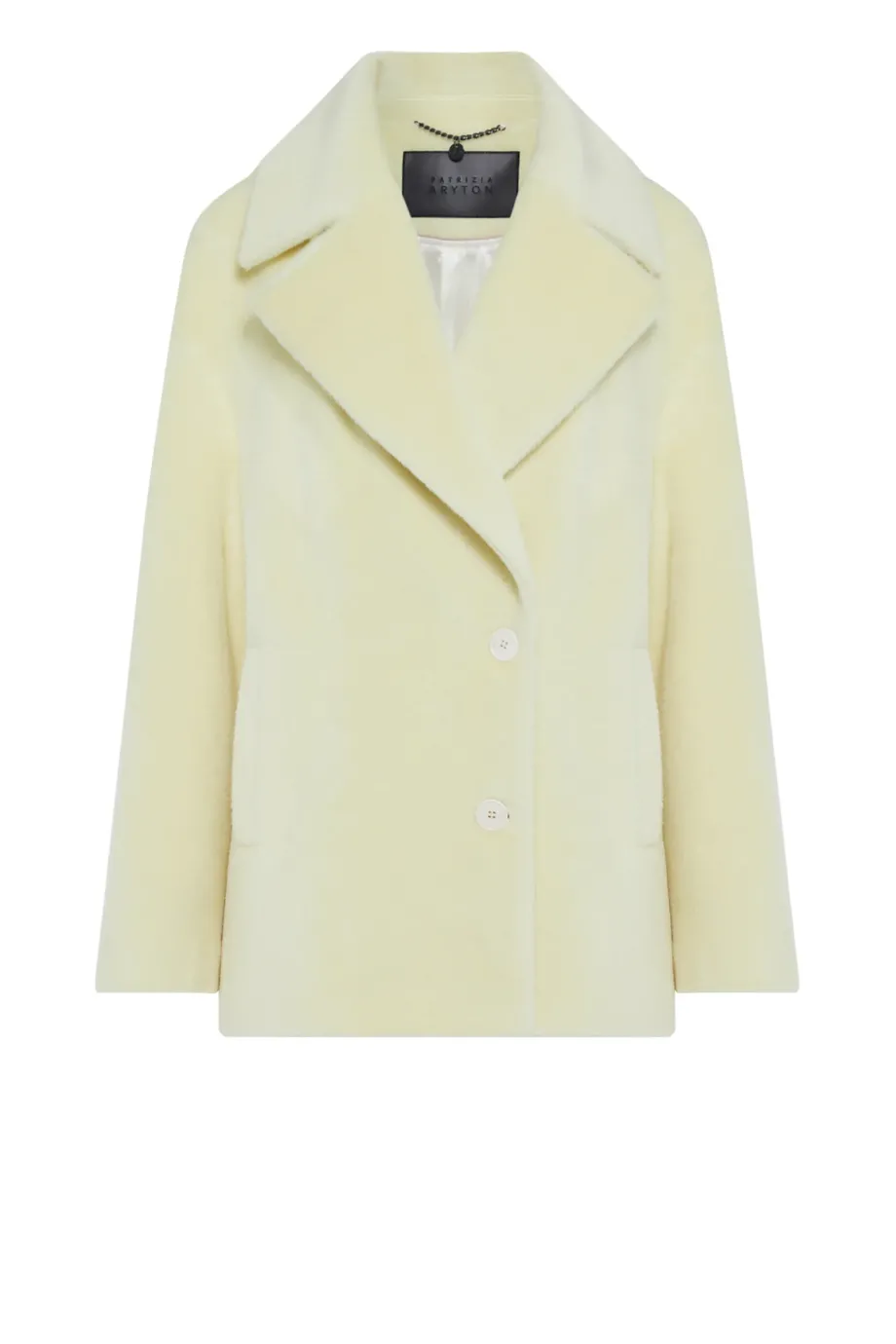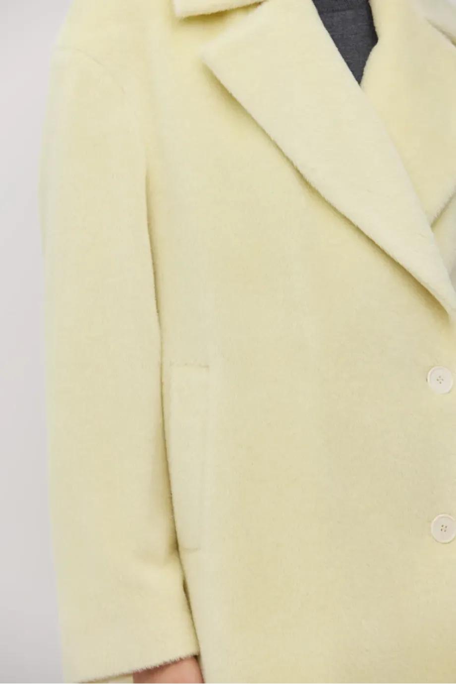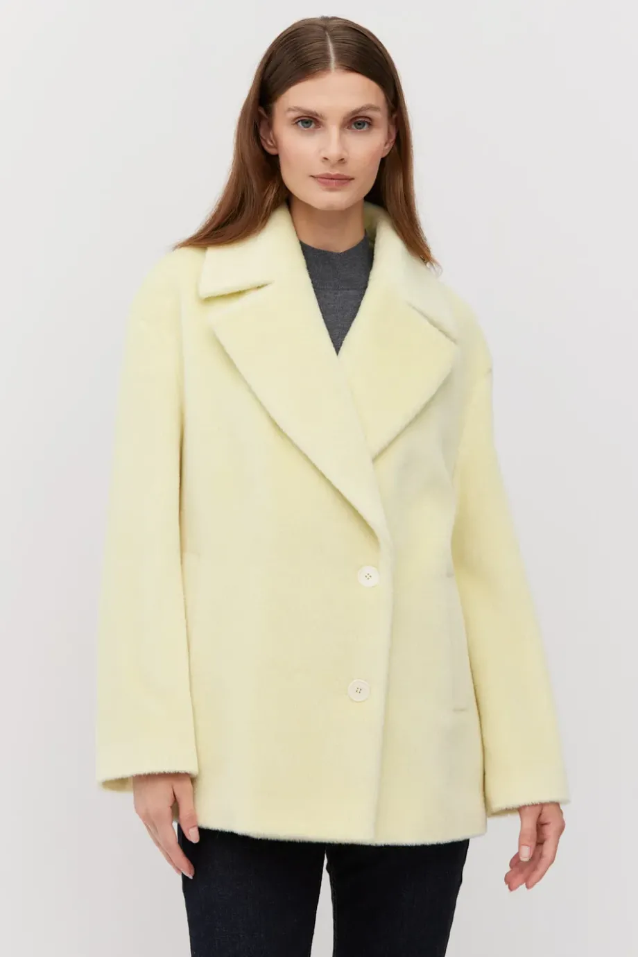 Bunda s baby suri alpakou v pastelově žluté barvě. Volný střih se spadlým rukávem. Jednořadé zapínání na knoflík z ořechu corozo. Model s podšívkou a ozdobným pip