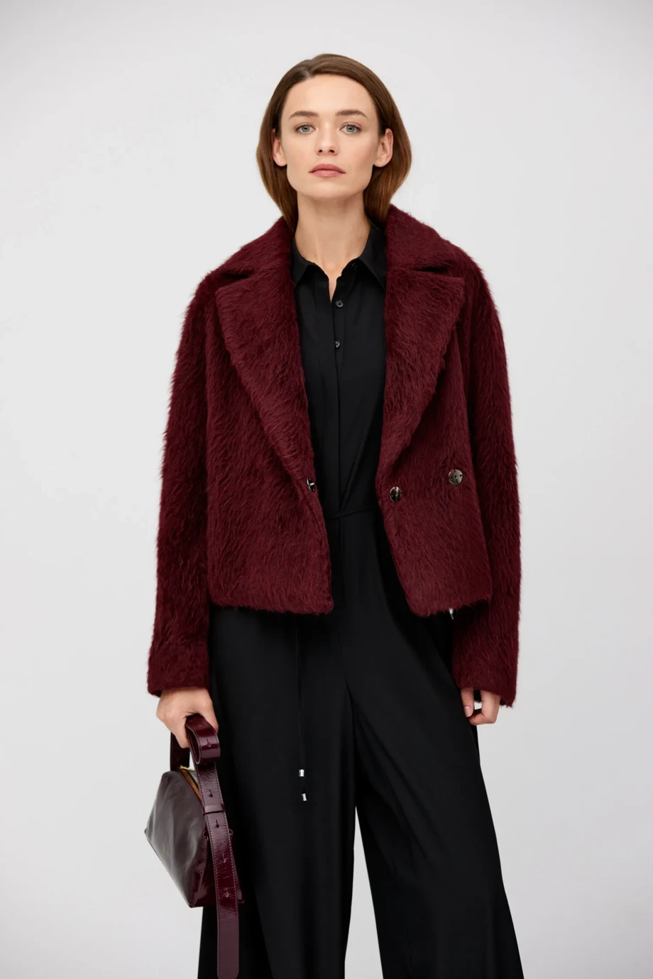 Kurtka z alpaky a jehněčí vlny (pannenské). Volný střih s límcem. Dlouhý rukáv. Zapínání na druky. Model na podšívce se ozdobným lemem. Barva třešňová.