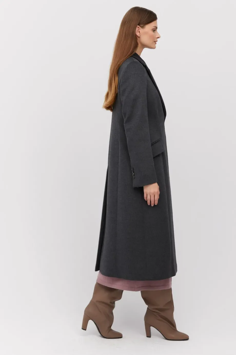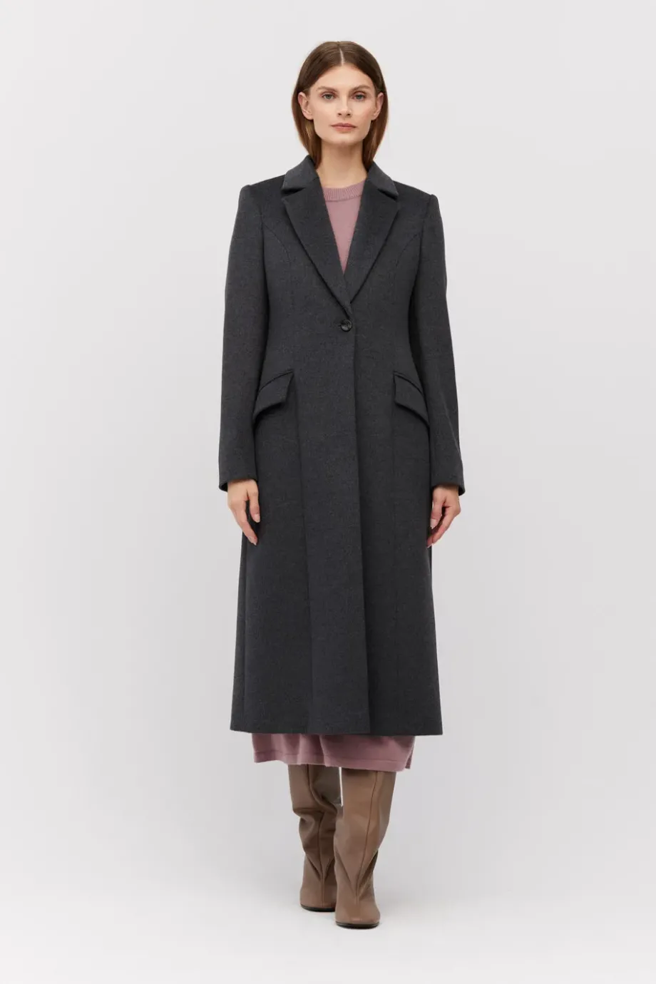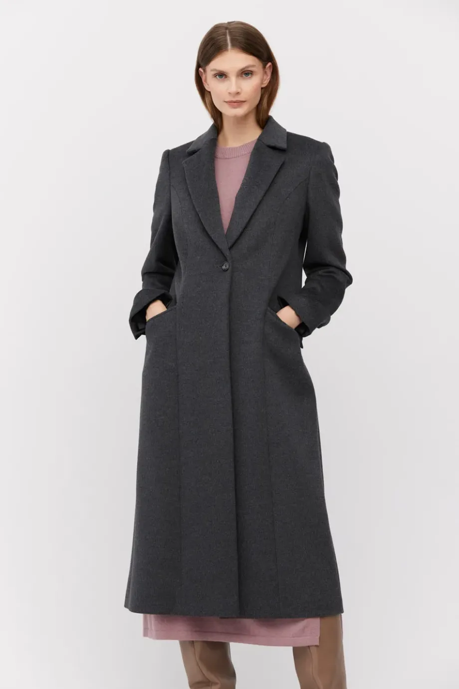 Tmavě šedý vlněný plášť klasického střihu, zapínaný na jeden knoflík. Model na podšívce, s kapsami s klopou. Délka midi.